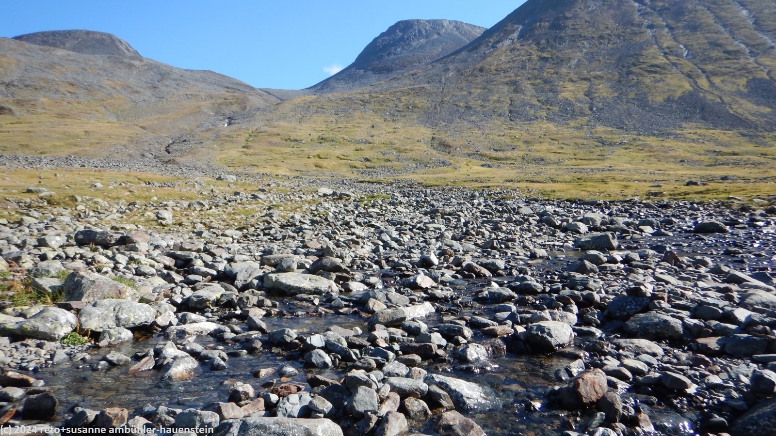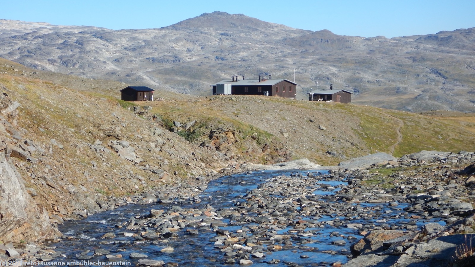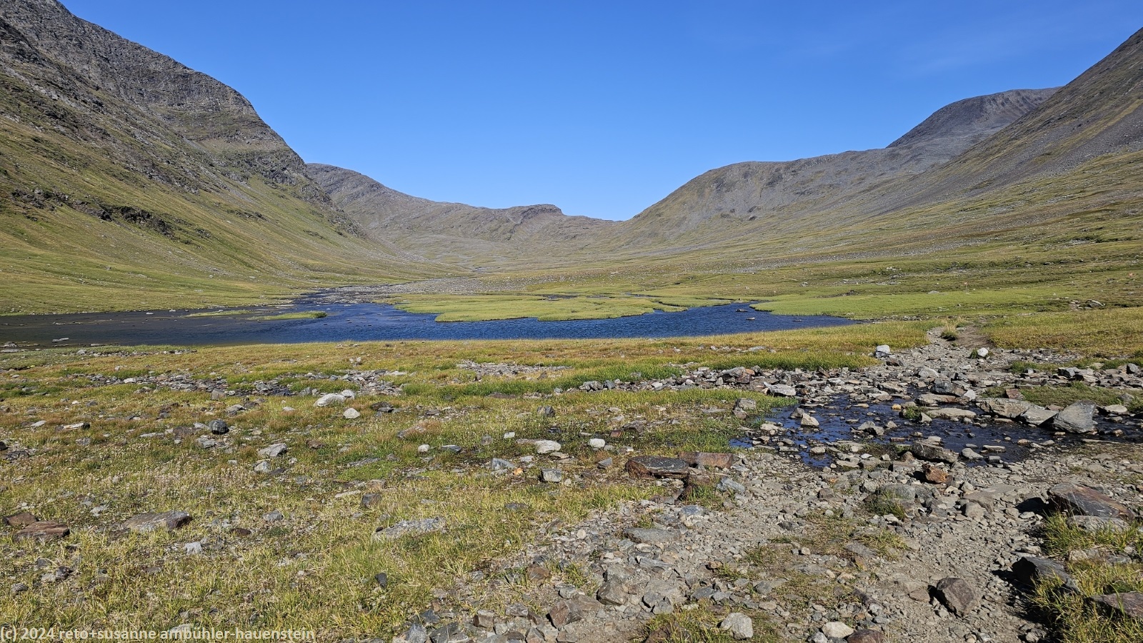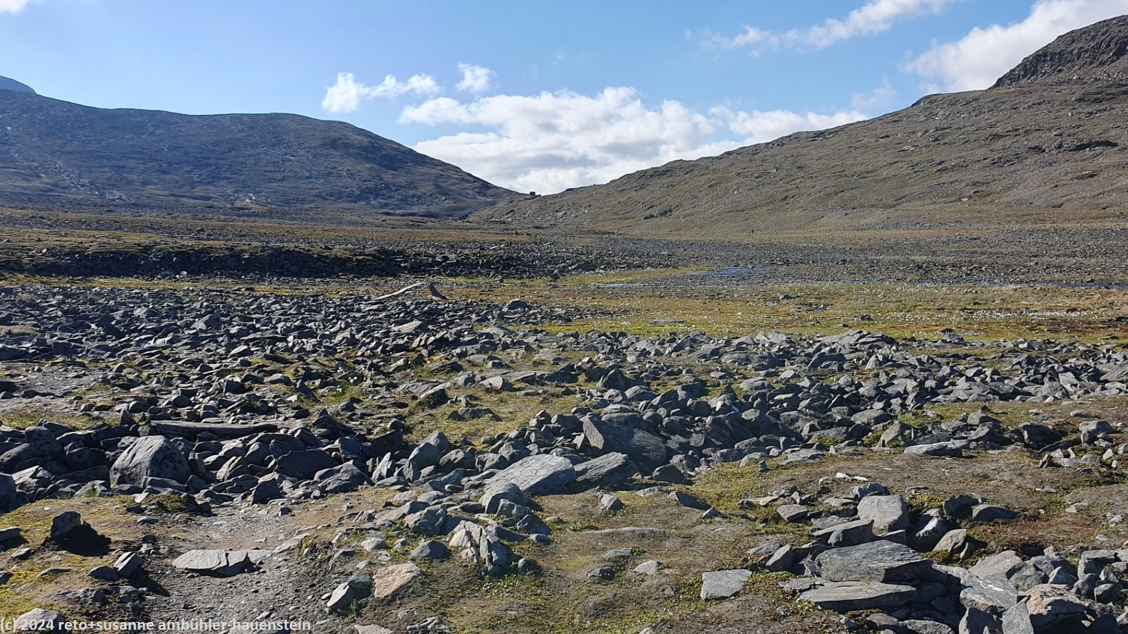 es geht ein stürmischer wind. nach einem kurzen halt nehmen wir den abstieg ins tal des tjäktajåkka in angriff. zu beginn ist der pfad recht steil und windet sich kurvenreich bergab. danach wird das gelände zwar flacher, der weg aber umso holpriger. ausgedehnte felsenfelder machen das vorwärtskommen ziemlich mühsam. die stege dazwischen sind eine willkommene abwechslung und grosse erleichterung. als wir einen etwas breiteren zufluss zum tjäktajåkka erreichen, haben wir ziemlich genau den halben weg hinter uns. mitten im flussbett setzen wir uns auf einen grossen stein und machen kurz pause. wir trinken einen schluck und essen einen stengel. knapp zehn minuten später brechen wir wieder auf. die teilnehmenden der fjällräven classic haben wir definitiv hinter uns. in beiden richtungen sind die gewohnten wanderer unterwegs. im gegensatz zum eher felsigen tal nördlich des tjäktjapasses ist das südliche tal üppig bewachsen und sehr grün. wir sehen einige einzelne rentiere. schnee hat es dieses jahr fast gar keinen. gegen 13 uhr erreichen wir die sälkastugorna. wir werden freundliche empfangen.