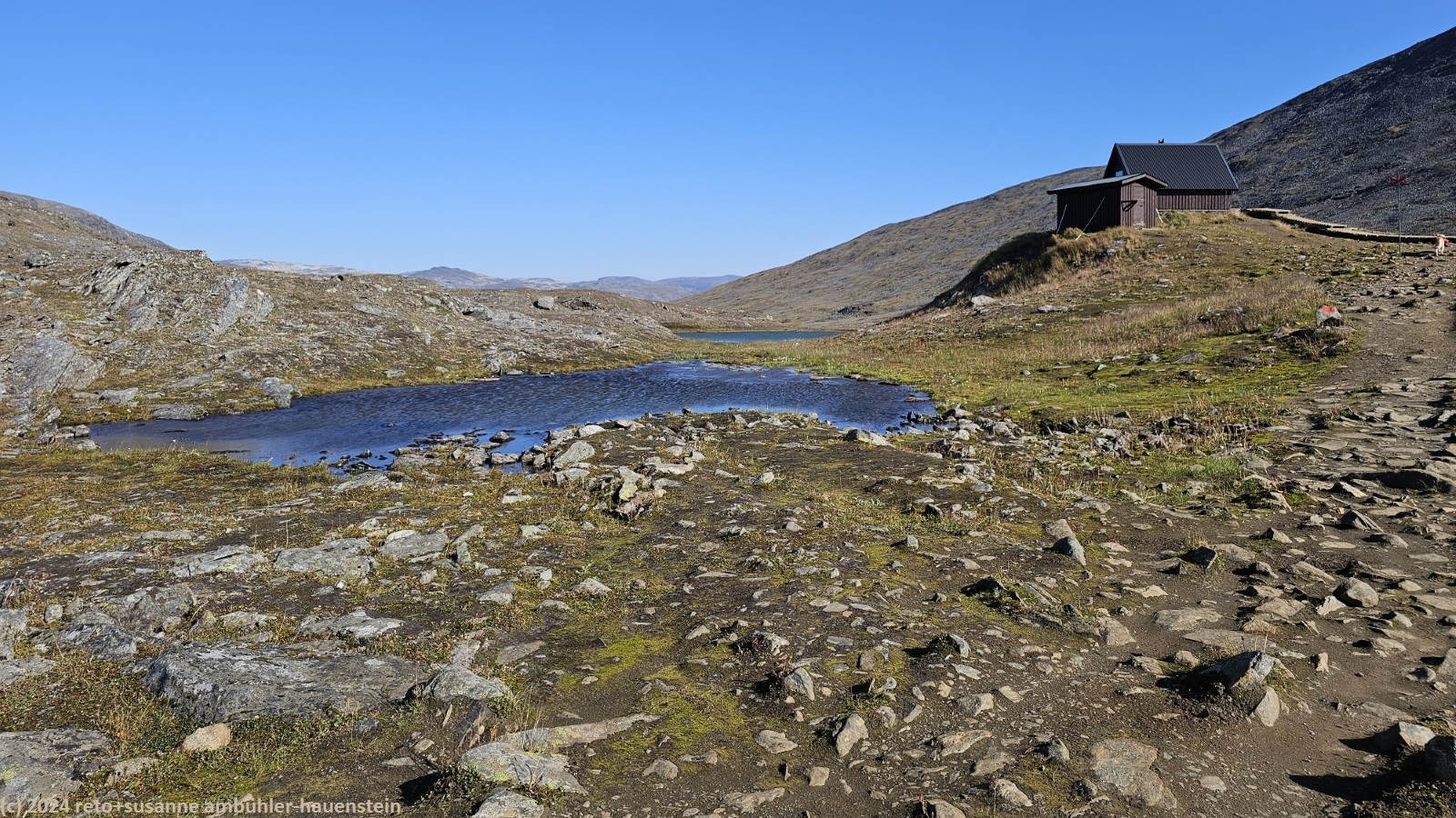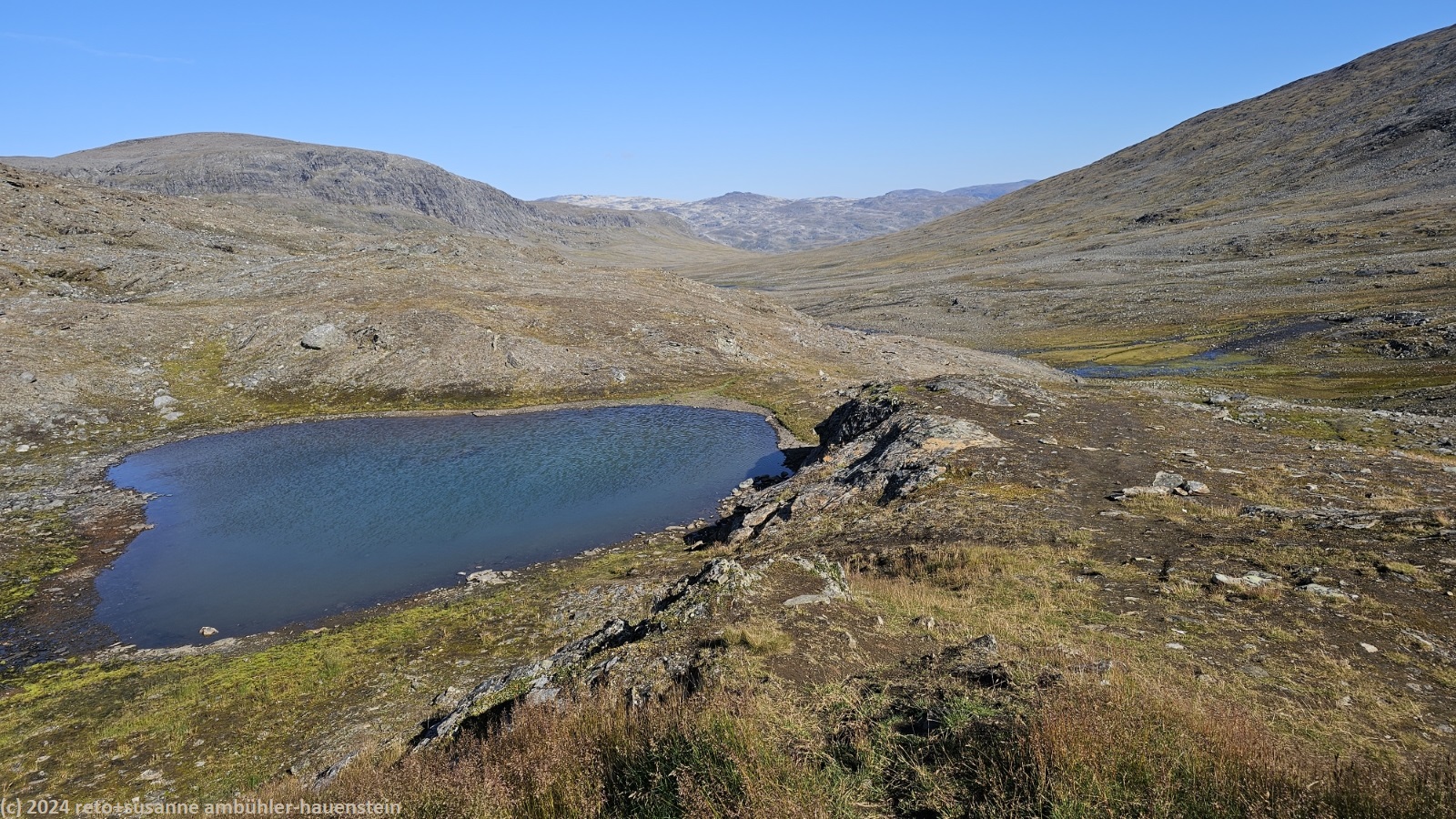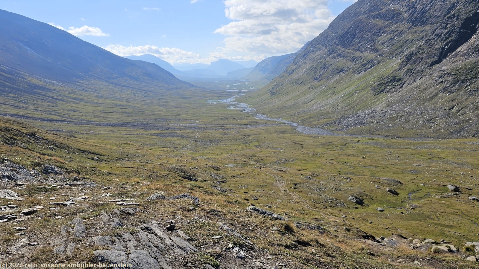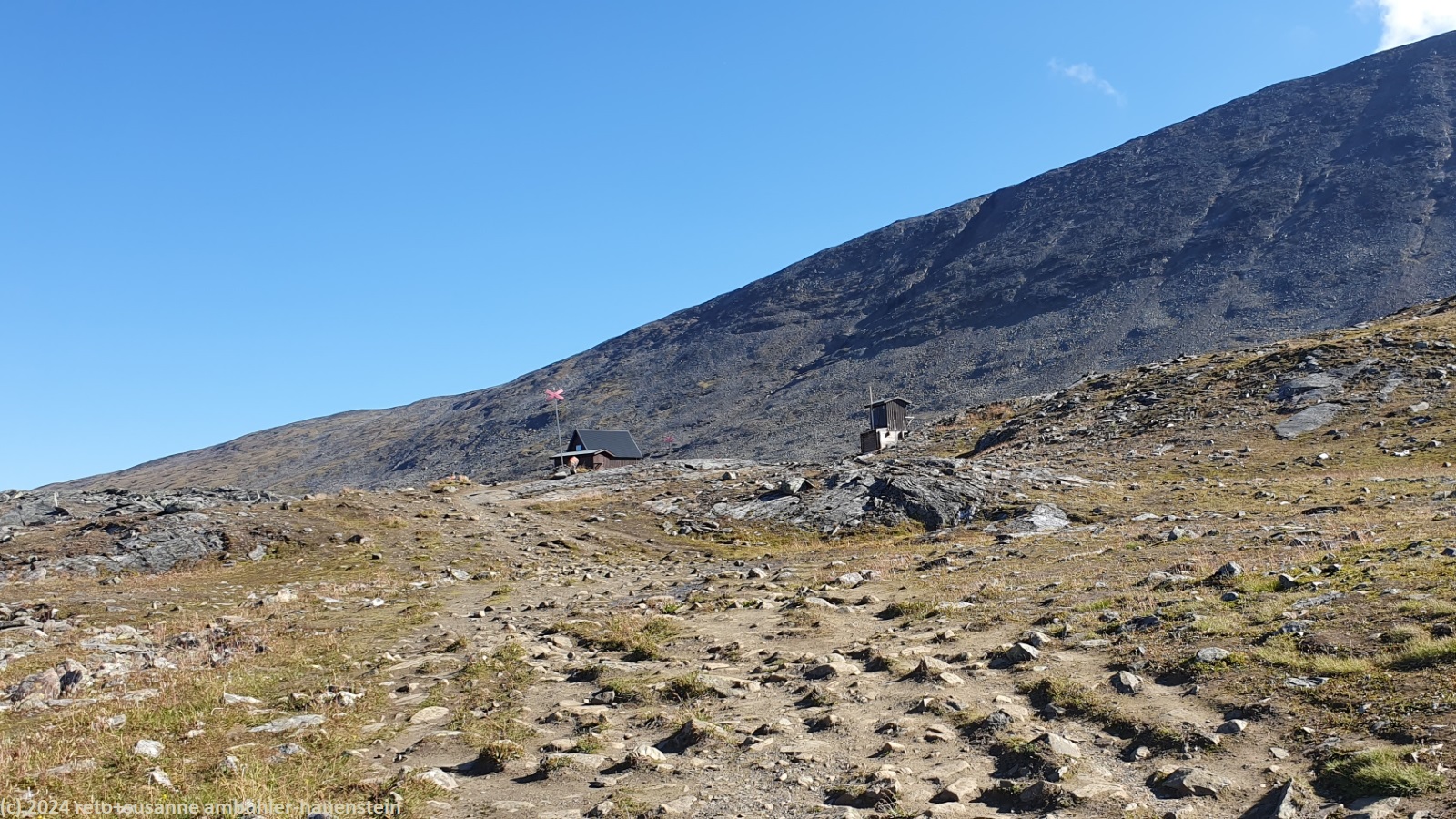 die nacht ist sehr ruhig. wir schlafen bis um 5 uhr der wecker unseres zimmergenossen los geht. er stellt ihn zwar rasch ab, aber wach sind wir trotzdem. er bleibt dennoch bis 7 uhr liegen. um 07:30 uhr stehen wir auf und frühstücken in der küche. es herrscht reger betrieb aber es geht sehr gesittet zu und her. der himmel ist fast wolkenlos, die sonne scheint herrlich. es geht jedoch immer noch ein kräftiger südwind. kurz nach 9 uhr brechen wir auf. wie im tagebuch von gestern bereits erwähnt, sind wir die vor uns liegende strecke schon einmal gelaufen, aber ohne den zwischenhalt in der tjäktjastuga, siehe tagebuch vom 07-aug-2017. über die spektakuläre hängebrücke geht es zurück auf den kungsleden. dieser steigt nun weiter an richtung tjäktjapass. es gibt einige einfache flussdurchquerungen. es kommen uns nun nur noch vereinzelte wanderer entgegen, niemand trägt die orange markierung der fjällräven classic. offenbar haben wir die teilnehmenden nun alle hinter uns. während wir den pass erklimmen, geniessen wir die wiedergewonnene ruhe. der blick zurück ins tal ist atemberaubend, ganz besonders bei diesem herrlichen wetter. nach etwa einer stunde erreichen wir die passhöhe. mit 1140 m.ü.m. befinden wir uns nun auf dem höchsten punkt des nördlichen kungsleden.