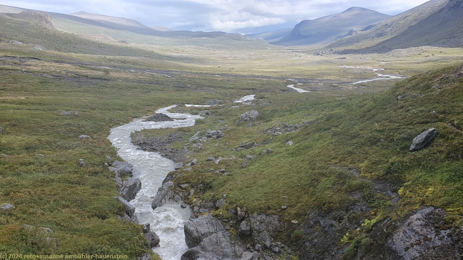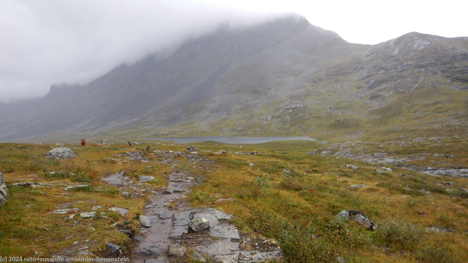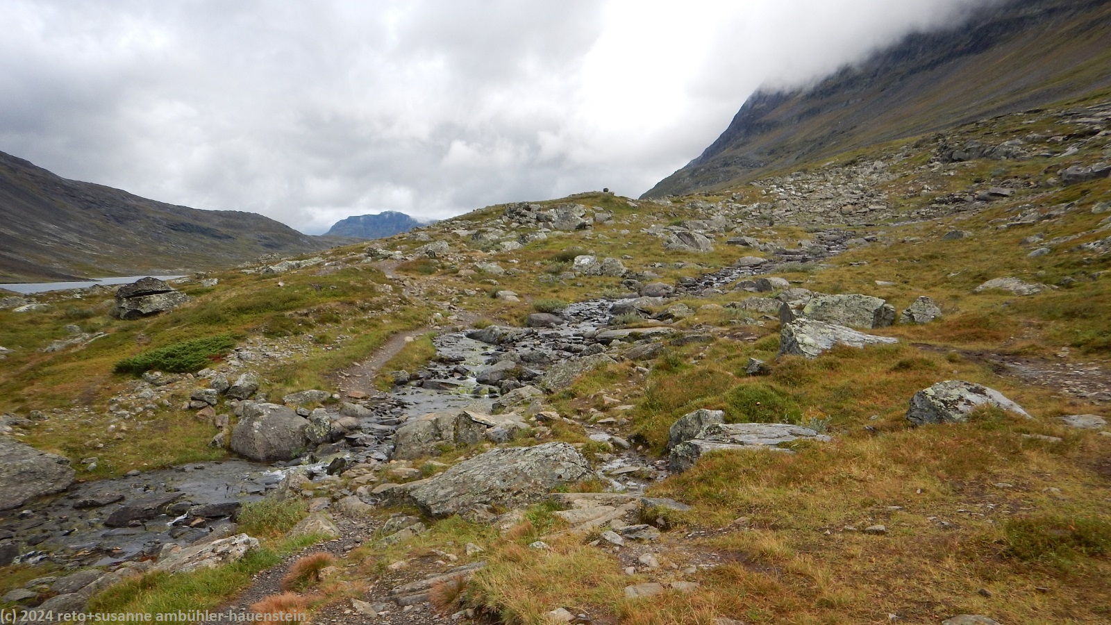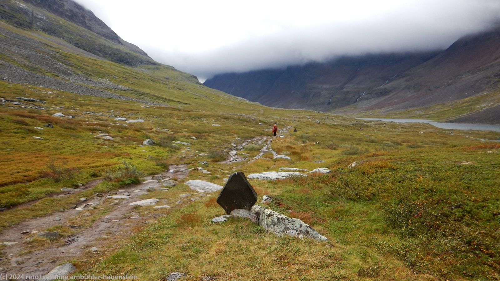 da heute vorallem für den vormittag starker regen angesagt ist, verzichten wir darauf, einen wecker zu stellen. die nacht ist sehr ruhig, wir schlafen bestens. um 07:45 uhr stehen wir auf. das deutsche pärchen ist bereits in der küche. wir bereiten ebenfalls unser frühstück zu. draussen bläst ein stürmischer wind und es regnet. in der nacht war es noch trocken, aber nun entleeren sich die grauen, tiefliegenden wolken. gegen 09:10 uhr sind wir startbereit. wir haben regenhosen und regenjacken angezogen und auch an den rucksäcken die regenschütze montiert. heute folgen wir nicht mehr dem kungsleden, sondern wir wandern auf dem "dag hammarskjöldsleden" westwärts richtung nikkaluokta. genau genommen waren wir schon die ganze zeit auf diesem als "moderner pilgerweg" bezeichneten pfad unterwegs, denn dieser führt von abisko nach nikkaluokta, dies ist exakt unsere route. entlag des "dag hammarskjöldsleden" hat es sieben sogenannte "meditationsplätze" wo menschen ihre "innere ruhe" finden können. der pilgerweg hat einen religösen hintergrund, siehe website der schwedischen kirche. unser heutiges ziel ist die kebnekaise fjällstation. von dieser strecke sind wir nur die letzten kilometer schon einmal gewandert, als wir von der kebnekaise fjällstation aus einen tagesausflug zum silverfallet gemacht hatten, siehe tagebuch vom 24-jul-2013. der weg steigt sofort an. vor uns liegen 150 höhenmeter bis zum lássajávri. es regnet und es bläst immer noch dieser kräftige wind. eigentlich hatte ich erwartet, dass wir heute rücken- oder zumindest seitenwind hätten, aber der wind bläst uns direkt ins gesicht. während dem aufstieg intensiviert sich der regen. erst als wir die passhöhe erreicht haben, lässt er etwas nach. wir wandern nun ins hübsche tal des láddjujohka. anfangs hat es einige seelein, dann geht es dem fluss entlang. eher überraschend macht der regen etwas pause. wir nutzen die gelegenheit, setzen uns auf einen grossen stein am wegrand und essen einen stengel. kaum brechen wir wieder auf, beginnt der regen erneut und nun ziemlich heftig. der pfad ist entsprechend matschig mit vielen pfützen. manche steine sind sehr rutschig, so dass man stets auf der hut sein muss. wir überstehen die holprige wanderung schadlos. gegen 12:15 uhr halten wir ausschau nach einer gelegenheit um zu mittag zu essen. schutzhütten gibt es an dieser strecke leider keine. susanne entdeckt etwas abseits des weges einen mächtigen felsen, der dank seiner schrägen form etwas schutz vor dem regen bietet. wir setzen uns unter den vorsprung und essen unsere sandwiches.