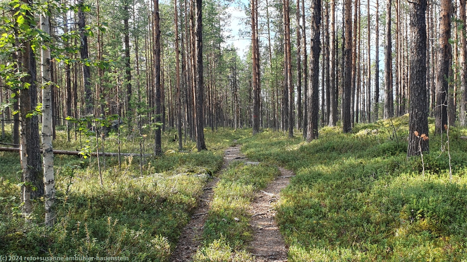 als wir fertig gepackt haben, unternehmen wir einen spaziergang. wir folgen erst dem ufer des lilla luleälven. der pfad ist nicht ganz einfach zu erkennen, führt uns aber durch einen schönen wald. er endet an einem zufluss zum lilla luleälven. wir schaffen es trockenen fusses über die grossen steine im wasser auf die andere seite, aber dort hat es keinen weg. da wir in der nähe ein haus sehen, schlagen wir uns durch den wald bis zur kleinen siedlung. ab hier geht es auf einer unbefestigten strasse bis zur hauptstrasse. dieser folgen wir bis zum nahen reitstall. wir überqueren die hauptstrasse und finden in der zufahrtsstrasse den einstieg zum wanderweg zurück zum campingplatz. wieder führt der pfad durch einen schönen wald. noch einmal müssen wir über die hauptstrasse, dann sind wir wieder beim campingplatz.