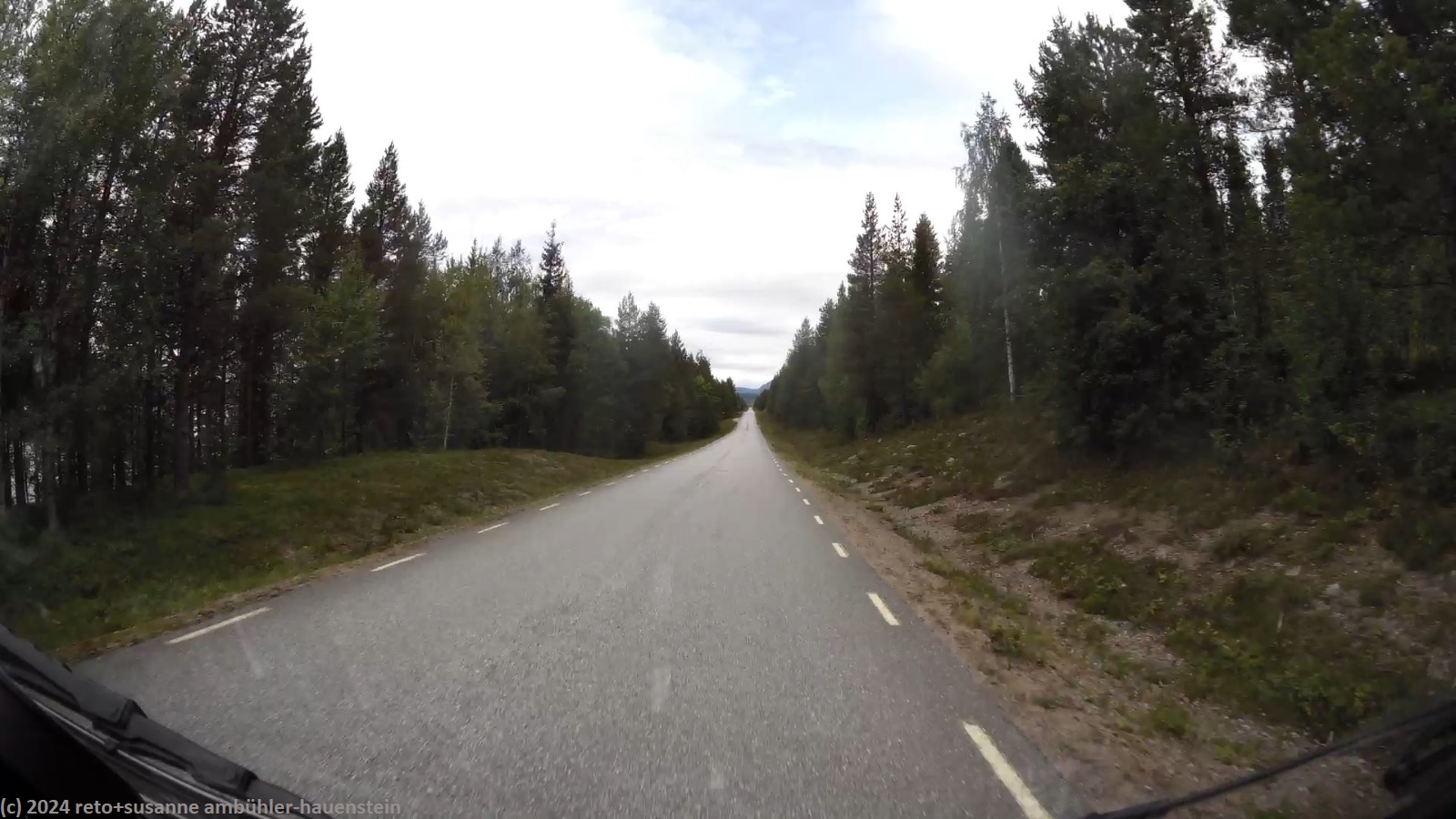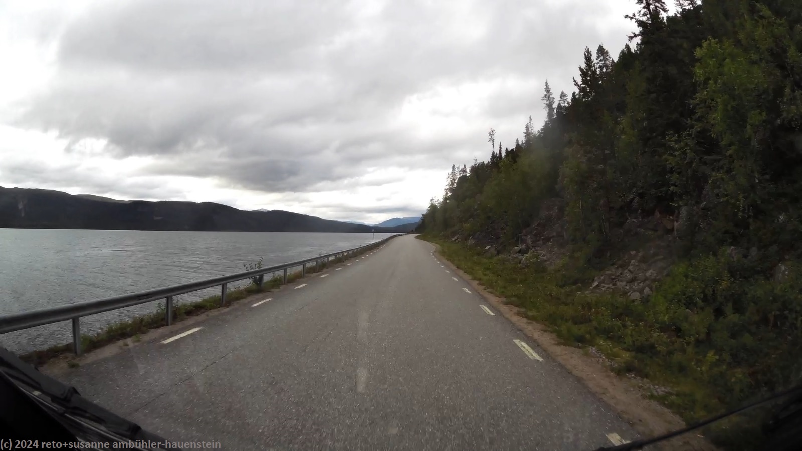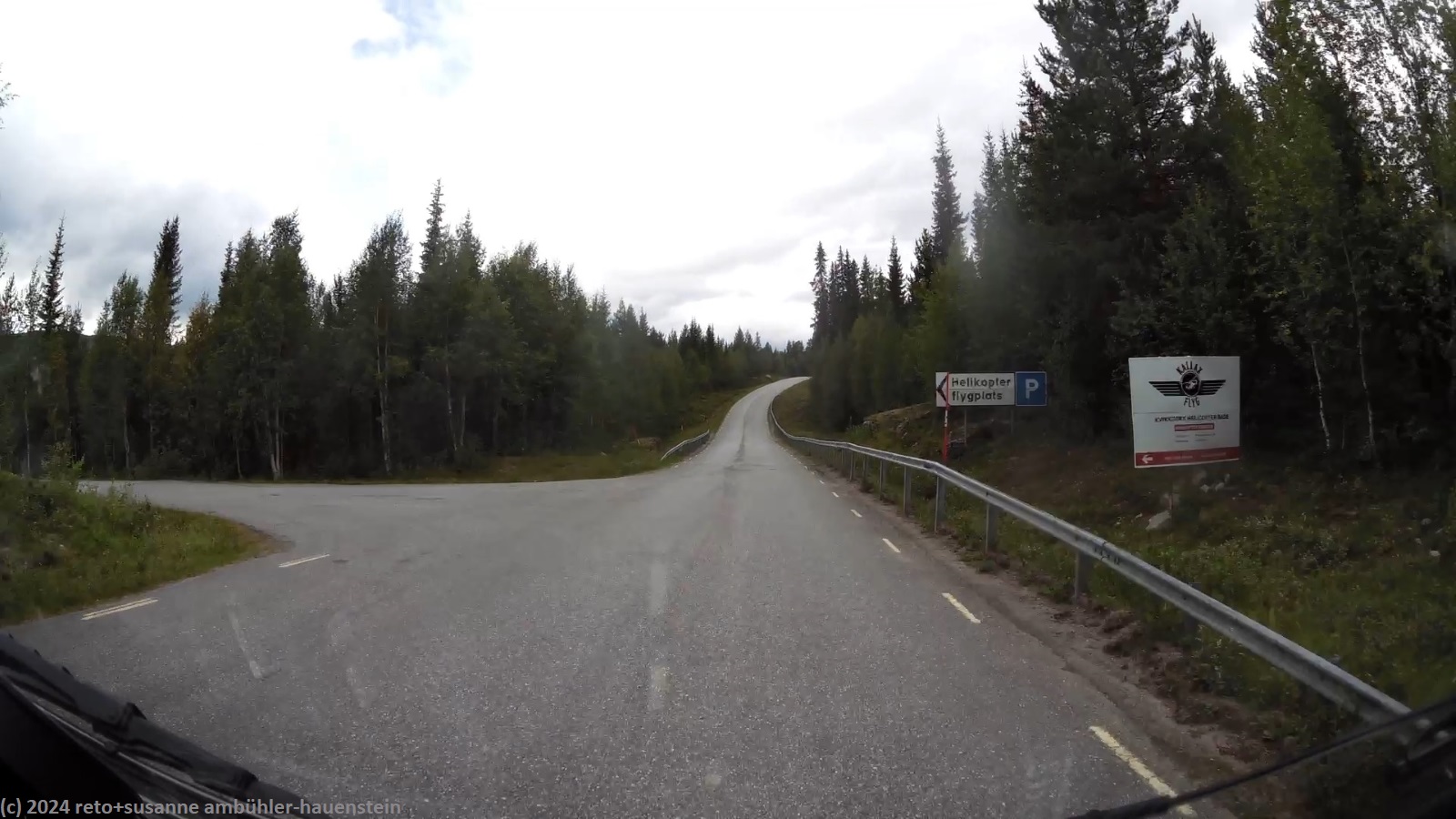 unser handy weckt uns um 07:30 uhr. wir haben auch diese nacht sehr gut geschlafen. gerne würden wir draussen frühstücken, aber es fallen vereinzelte regentropfen, so essen wir halt im wagen. nach dem frühstück packen wir zusammen und sind um 09:50 uhr startbereit. wir machen einen weiteren versuch bei "unserer" bäckerei und heute haben wir glück, sie ist geöffnet. wir kaufen zwei zimtschnecken, danach machen wir uns definitiv auf den weg nach kvikkjokk. auf der E45 fahren wir nordwärts. beim damm im stora luleälven sind die schleussen geöffnet worden, offenbar muss wasser abgelassen werden. gischt wird aufgewirbelt und stiebt über die fahrbahn, es fühlt sich an, als würden wir durch eine waschanlage fahren. nach 6 km biegen wir links ab auf die stichstrasse nach kvikkjokk. diese strasse ist nicht ganz so holprig wie diejenige nach ritsem, aber auch hier muss man jederzeit mit bodenwellen rechnen. das wetter ist ein klein wenig freundlicher geworden, zumindest ist es nun trocken. auf der fahrt nach kvikkjokk begegnen wir dieses jahr mehr autos in unsere richtung (eins) als rentieren (null). die landschaft ist trotz des eher trüben himmels sehr schön mit den etwas höheren bergen vor uns. 20 km vor kvikkjokk machen wir einen halt beim camping årrenjarka. wir würden gerne für kommenden sonntag einen platz, vorallem aber das abendessen buchen, aber der empfang hat vor 15 minuten geschlossen. wir werden die reservation per email machen. um 11:30 uhr erreichen wir kvikkjokk.