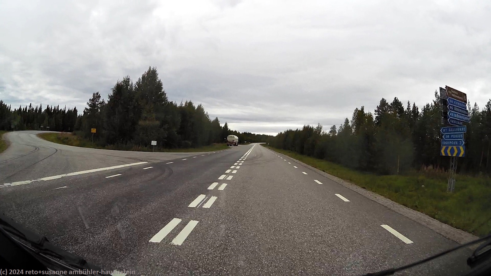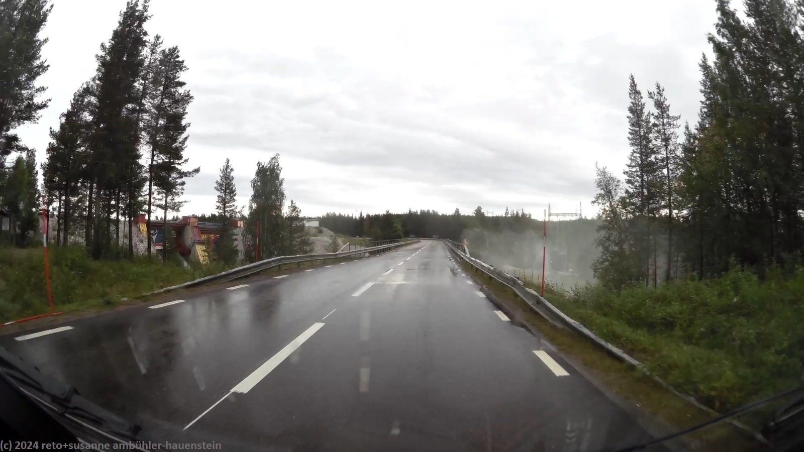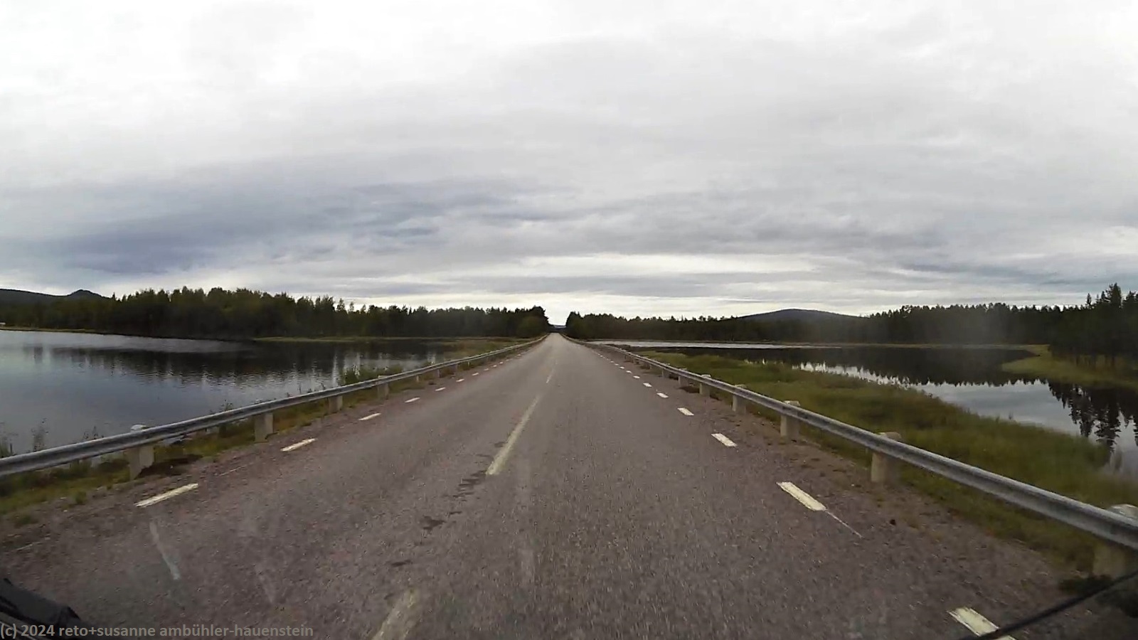 unser handy weckt uns um 07:30 uhr. wir haben auch diese nacht sehr gut geschlafen. gerne würden wir draussen frühstücken, aber es fallen vereinzelte regentropfen, so essen wir halt im wagen. nach dem frühstück packen wir zusammen und sind um 09:50 uhr startbereit. wir machen einen weiteren versuch bei "unserer" bäckerei und heute haben wir glück, sie ist geöffnet. wir kaufen zwei zimtschnecken, danach machen wir uns definitiv auf den weg nach kvikkjokk. auf der E45 fahren wir nordwärts. beim damm im stora luleälven sind die schleussen geöffnet worden, offenbar muss wasser abgelassen werden. gischt wird aufgewirbelt und stiebt über die fahrbahn, es fühlt sich an, als würden wir durch eine waschanlage fahren. nach 6 km biegen wir links ab auf die stichstrasse nach kvikkjokk. diese strasse ist nicht ganz so holprig wie diejenige nach ritsem, aber auch hier muss man jederzeit mit bodenwellen rechnen. das wetter ist ein klein wenig freundlicher geworden, zumindest ist es nun trocken. auf der fahrt nach kvikkjokk begegnen wir dieses jahr mehr autos in unsere richtung (eins) als rentieren (null). die landschaft ist trotz des eher trüben himmels sehr schön mit den etwas höheren bergen vor uns. 20 km vor kvikkjokk machen wir einen halt beim camping årrenjarka. wir würden gerne für kommenden sonntag einen platz, vorallem aber das abendessen buchen, aber der empfang hat vor 15 minuten geschlossen. wir werden die reservation per email machen. um 11:30 uhr erreichen wir kvikkjokk.