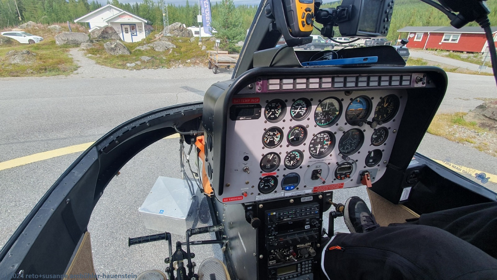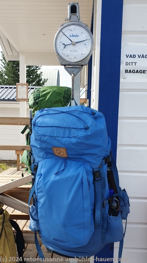 wir stoppen beim heliport und vergewissern uns, dass unsere buchung geklappt hat. der freundliche herr am schalter bestätigt dies. da wir noch eine stunde zeit haben, bis wir hier sein müssen, fahren wir zur fjällstation. unsere sandwiches müssen wir draussen essen, kaffee und kuchen geniessen wir dann im restaurant. um 12:20 uhr sind wir wieder beim heliport. wir schliessen an unserem jogi die vorhänge und ziehen unsere wandersachen an. danach wägen wir unsere rucksäcke. susannes rucksack wiegt 10.4 kg, meiner ist mit 11.4 kg ebenfalls etwas leichter als bei der letzten mehrtageswanderung auf dem nördlichen kungsleden, siehe tagebuch vom 11-aug-2024.