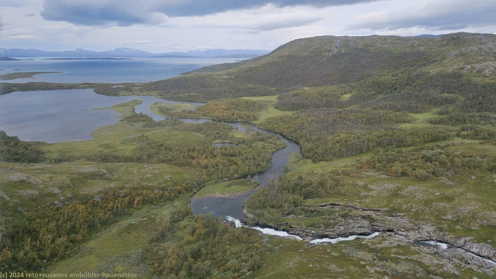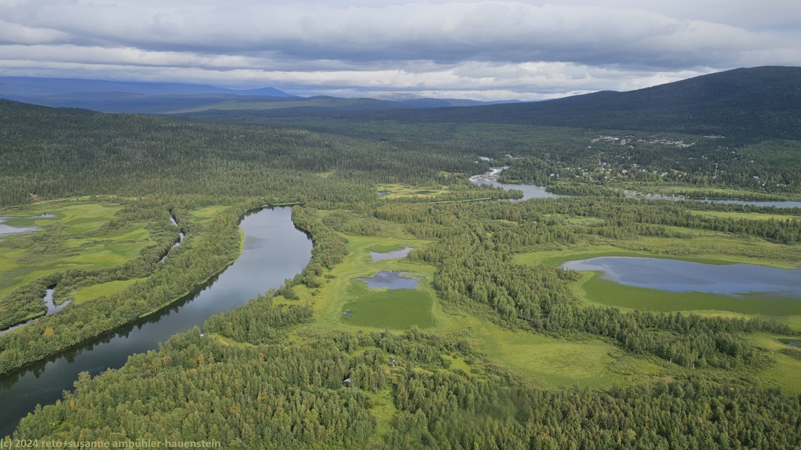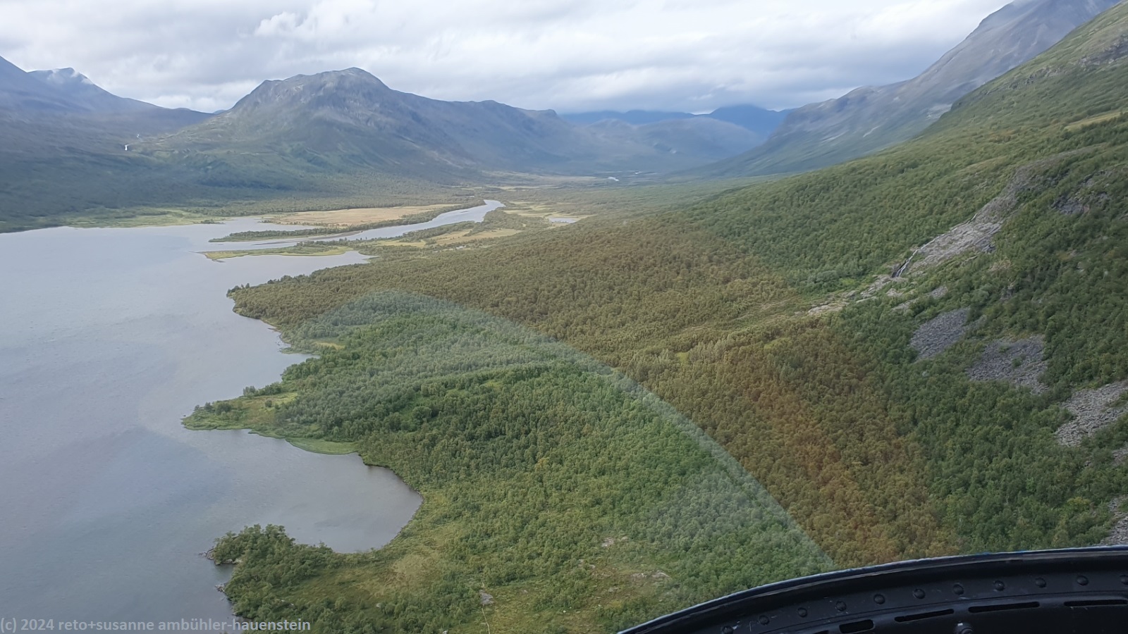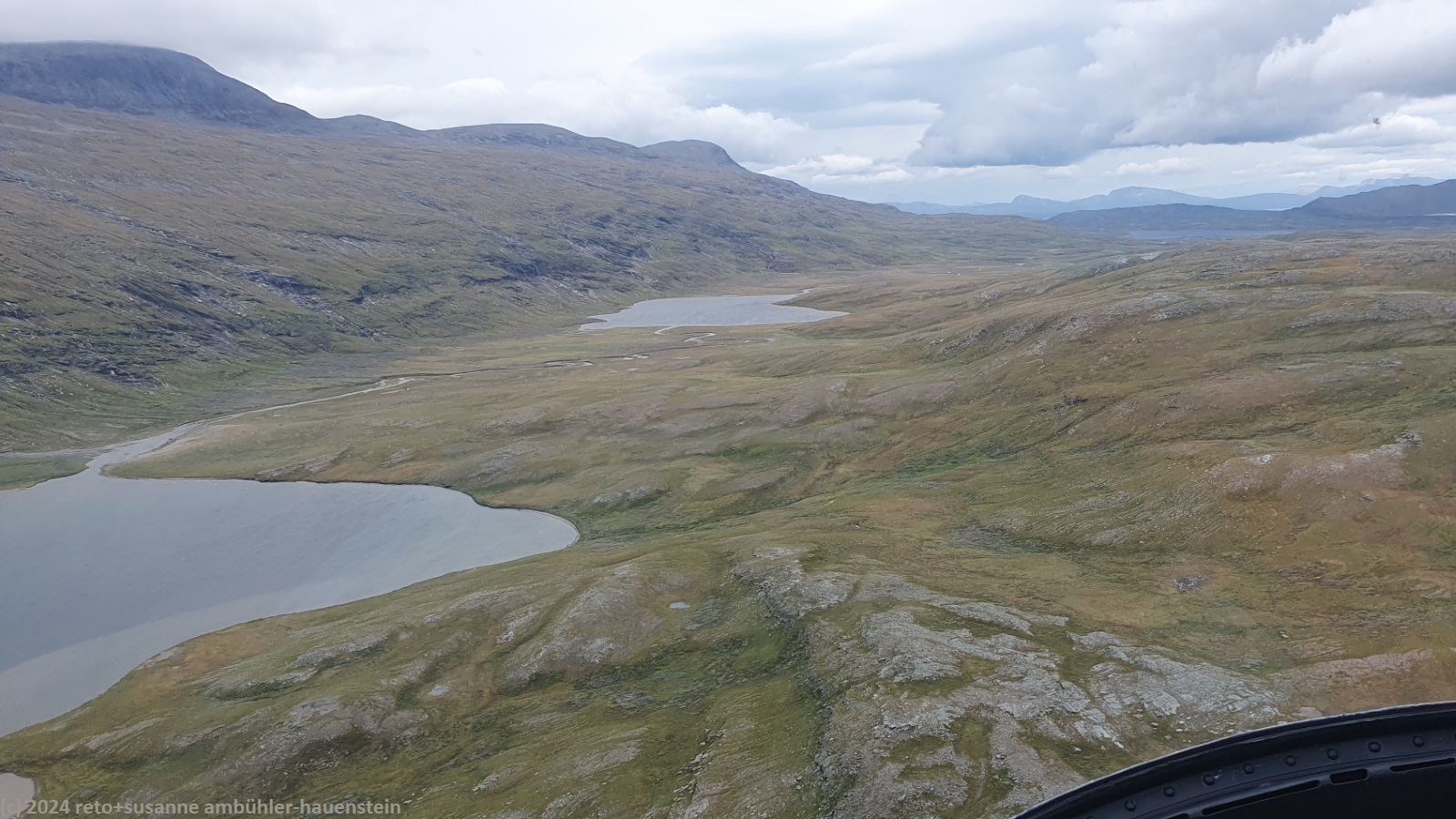 zehn minuten vor dem geplanten start fragt der pilot, ob wir bereit seien. wir bejahen und auch der belgier mit seinen zwei kindern, die mit uns zusammen fliegen werden, sind startklar. der pilot verstaut die fünf rucksäcke im heli, dann dürfen wir einsteigen. der belgische vater möchte mit seinen kindern hinten sitzen, susanne ebenfalls. so nehme ich mit vergnügen neben dem piloten platz. der heli hebt sanft ab und schon geht es im tiefflug übers fjäll. es ist auch heute ziemlich windig, aber der pilot hat sein fluggerät fest im griff. gelegentlich dringen ein paar sonnenstrahlen durch die wolkendecke. wir überfliegen die beiden fjällstugas njunjes und såmmerlappa. die anderen beiden stugas lassen wir rechts liegen. nach knapp 25 minuten flug erreichen wir unser ziel staloluokta.