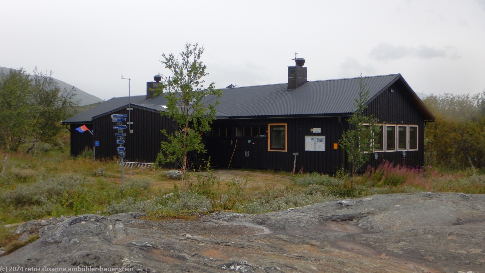 wir schultern unsere rucksäcke und sind wenig später in der fjällstuga. der empfang öffnet zwar erst um 16 uhr, aber susanne begegnet der dame, welche hier schon letztes jahr das sagen hatte, siehe tagebücher vom 27-aug-2023, 28-aug-2023 sowie 29-aug-2023, und diese gestattet uns, das 2-bett-zimmer zu belegen. hier gibt es sechs 4-bett-zimmer und drei 2-bett-zimmer. zwei davon sind VIP-zimmer und haben eine eigene küche. wir dürfen im dritten 2-bett-zimmer übernachten. dieses hat zwar keine eigene küche, aber das brauchen wir auch nicht unbedingt. wir richten uns ein, danach geniessen wir im aufenthaltsraum kaffee bzw. tee und unsere zimtschnecken.
