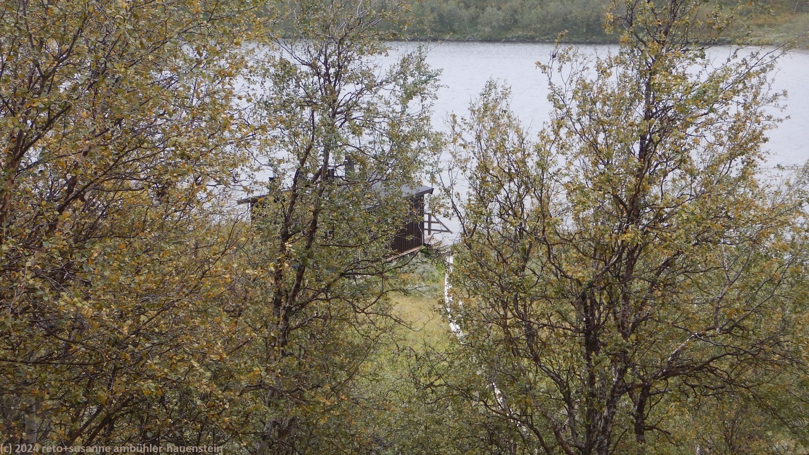 zurück in der stuga möchten wir uns registrieren, denn der empfang ist nun geöffnet. es braucht ungeheuer viel geduld, denn die menschen vor uns brauchen ewig, um alle ihre wünschlein vorzutragen. bis zum nachtessen setzen wir uns in den aufenthaltsraum und lesen, bzw. schreiben tagebuch. gegen 17:30 uhr kocht susanne unser abendessen. dieses geniessen wir im aufenthaltsraum. uns scheint, es hat heute deutlich mehr leute in dieser stuga als letztes jahr. offenbar macht die eine woche früher einiges aus. nach dem nachtessen liest susanne, ich führe die bücher nach. die wolken haben sich soweit verzogen, dass nun die sonne durch die fenster scheint. um 20 uhr besuchen wir die sauna. auch hier gibt es einen waschraum, in welchem man sich mit warmem wasser waschen kann. das wasser wird in einem tank über dem ofen erhitzt, eine brilliante idee. solche wassertanks sieht man inzwischen in vielen saunen. diese ist nicht übermässig heiss, aber die finnen machen einen aufguss nach dem anderen, so kommen wir trotzdem ins schwitzen. zwischen den beiden sitzungen kühlen wir uns im fluss ab, das ist sehr erfrischend. bei der zweiten sitzung haben wir die sauna für uns alleine. gut gewärmt setzen wir uns nochmals in den aufenthaltsraum und trinken eine tasse tee. gegen 22 uhr ziehen wir uns in unser hübsches zimmer zurück und schlüpfen in unsere schlafsäcke.
