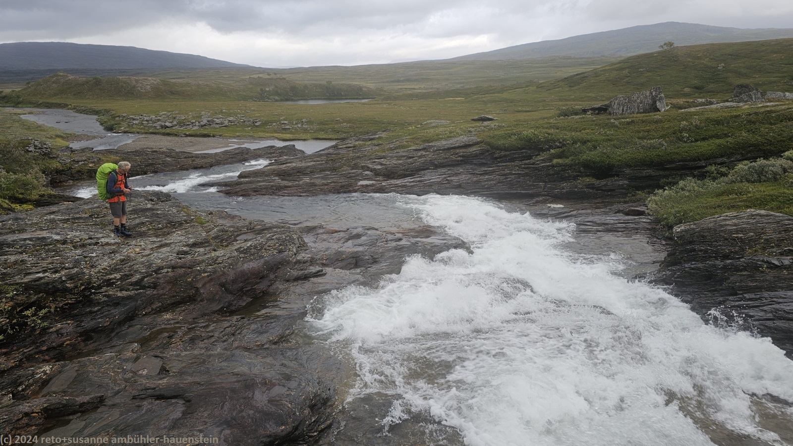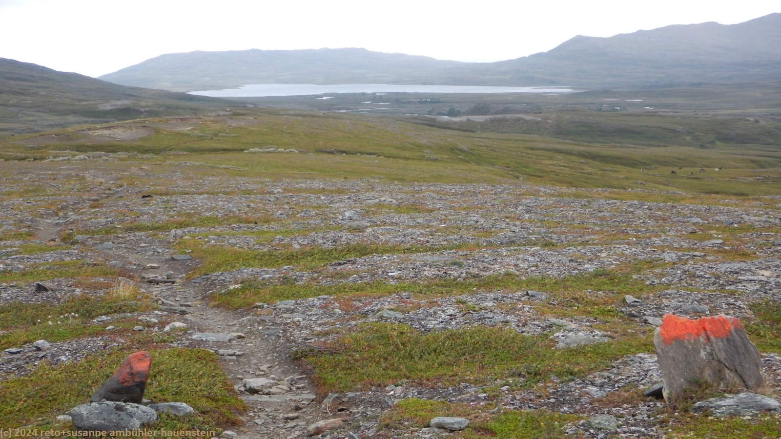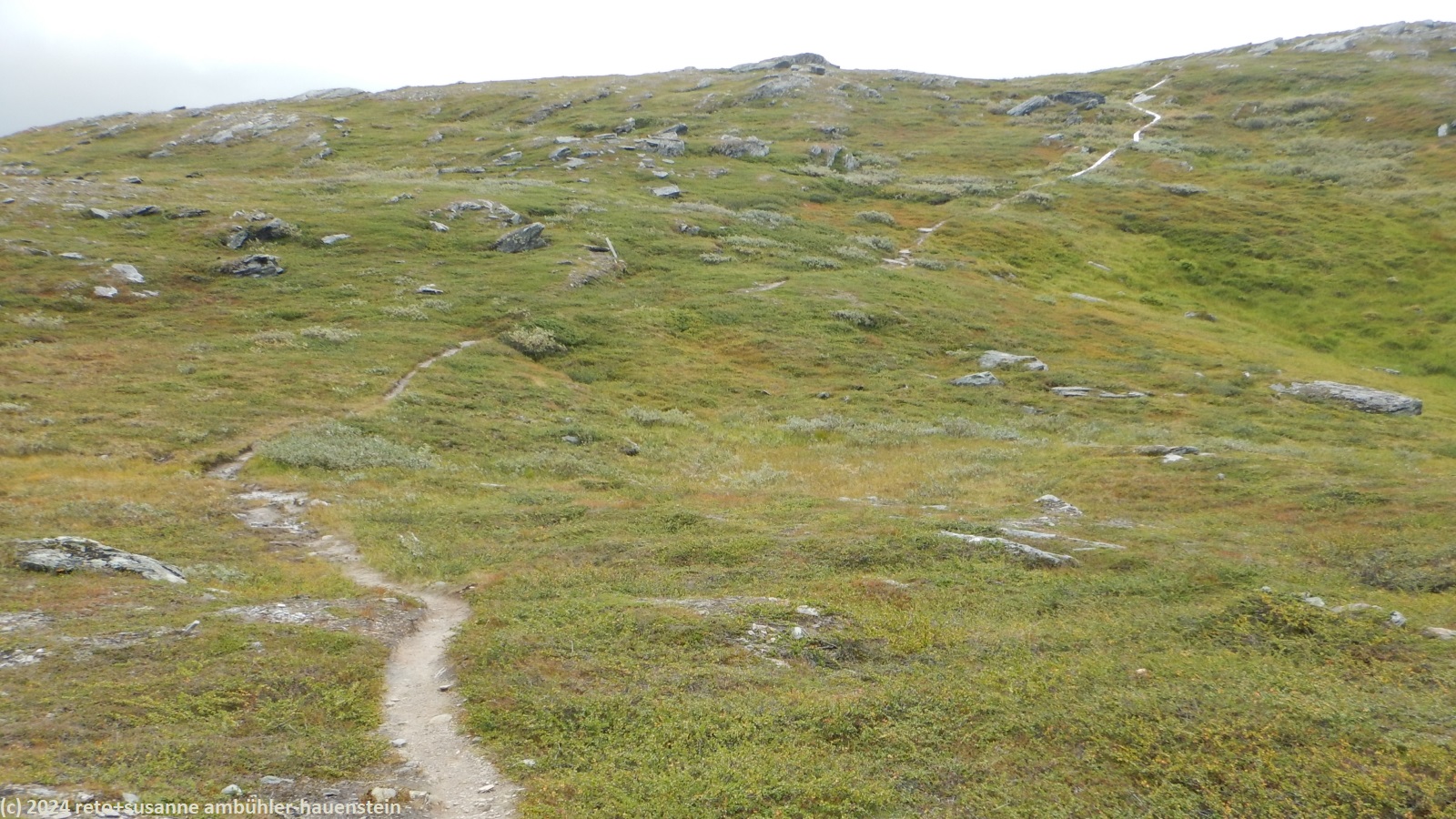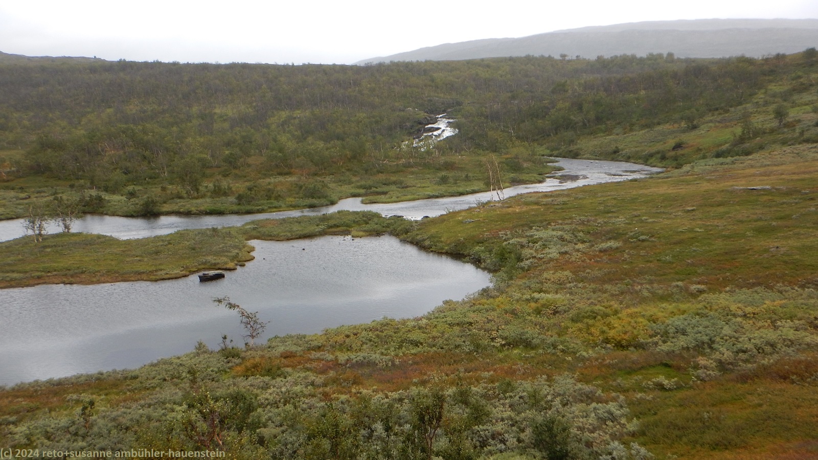 unser handy weckt uns um 7 uhr. die nacht war äusserst ruhig, ich habe sehr gut geschlafen. auch jetzt ist es im haus immer noch völlig still, offenbar sind noch alle gäste am schlafen. wir frühstücken im aufenthaltsraum mit blick auf den see. der himmel ist immer noch sehr verhangen und trüb, der wind bläst wie schon seit tagen. nach dem essen packen wir unsere rucksäcke, danach reinigen wir unser zimmer und den hintereingang. um 08:50 uhr brechen wir auf. wir überqueren die hängebrücke über den gieddejåhkå, danach steigt der weg sanft an. wenig später zweigt der nordkalottleden richtung süden ab. wir folgen dem padjelantaleden vorwiegend ostwärts. anfangs wandern wir durch niedrige birken, bei 630 m.ü.m. kommen wir über die baumgrenze. das kahle fjäll ist sehr grün, dazwischen sehen wir gelbliche und rötliche sträucher. es fällt ein leichter nieselregen, der manchmal etwas intensiver wird, dazwischen aber auch längere pausen macht. susanne hat die regenjacke angezogen, ich laufe im langarm t-shirt. am gieddávrre vorbei geht es ins weite tal des rådoljåhkå. der pfad ist grundsätzlich einfach und bequem zu begehen. er führt abwechslungsweise über offenes gelände und niedrige büsche. manchmal ist der weg ziemlich tief und sehr schmal, so dass nicht beide füsse nebeneinander platz haben. der aufstieg wird immer wieder durch kleine senken unterbrochen, so dass der weg ein bisschen einer berg- und talbahn ähnelt. bei der brücke über den ballavrijåhkå machen wir eine kurze pause. der fluss stürzt über mehrere kleine wasserfälle talwärts und macht einen ziemlichen lärm. ich liebe dieses geräusch. nach zehn minuten brechen wir wieder auf. am gegenüberliegenden hang scheint die sonne. das blaue loch in der wolkendecke ist stets vor uns, aber die sonnenstrahlen erreichen uns nicht. der weg steigt weiter sanft aber kontinuierlich an. wir wandern durch eine weite hochebene. die krete der bergkette rechts von uns ist in den wolken. gelegentlich sehen wir rentiere. gegen mittag finden uns die sonnenstrahlen dann doch noch. um 12:25 uhr picknicken wir in der nähe des ieltijávrásj zwischen grossen steinen.