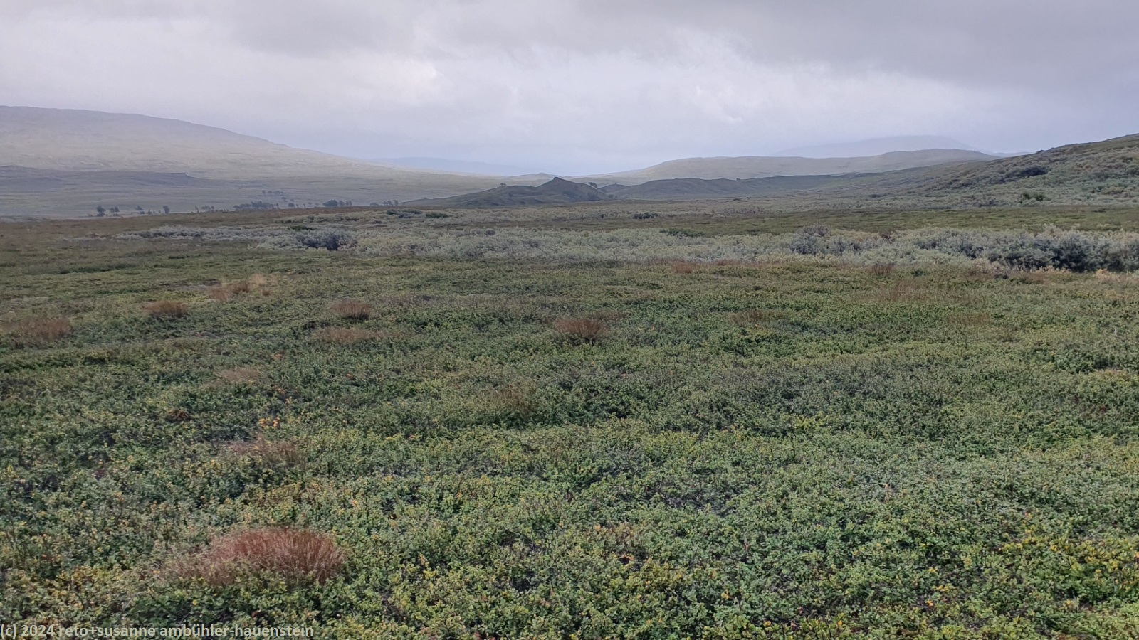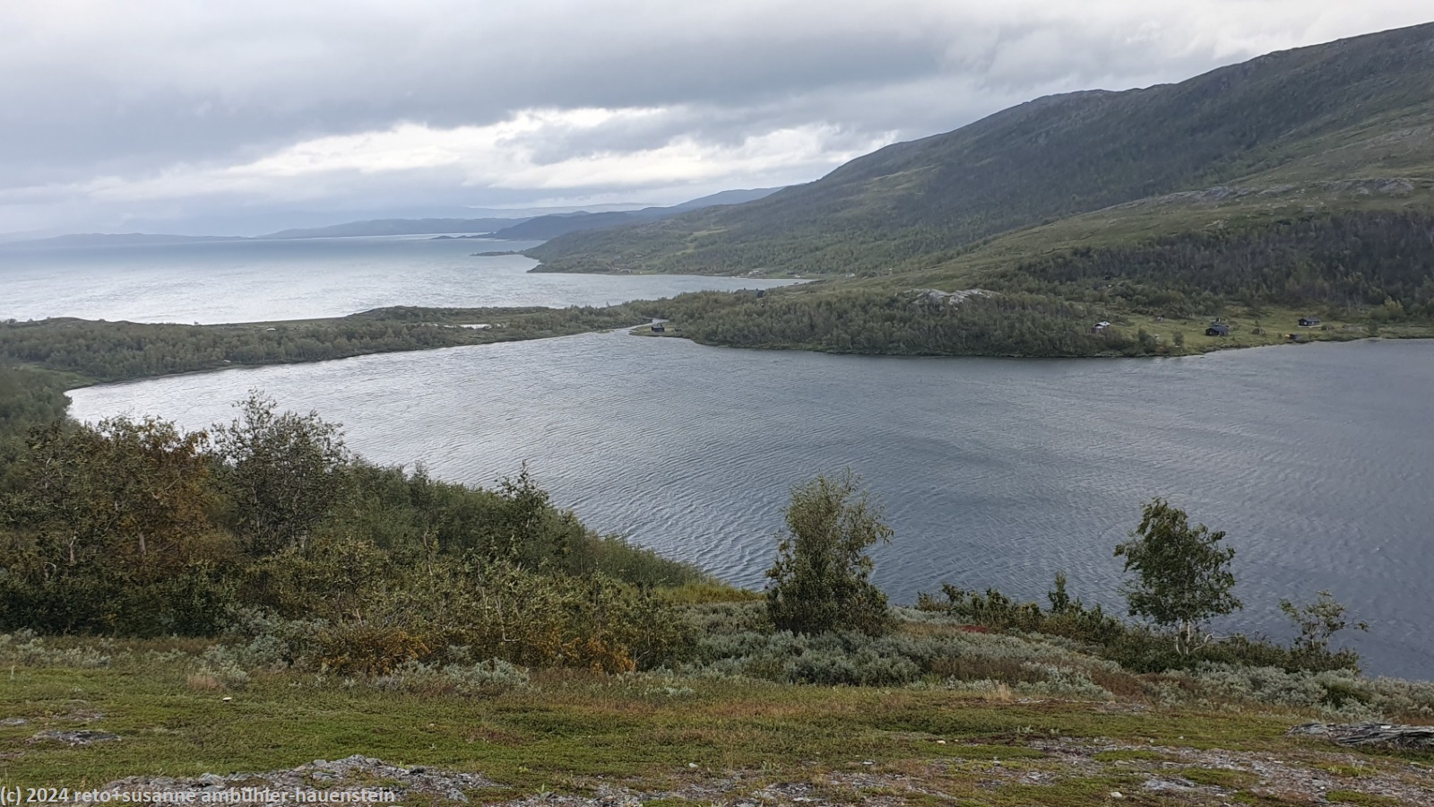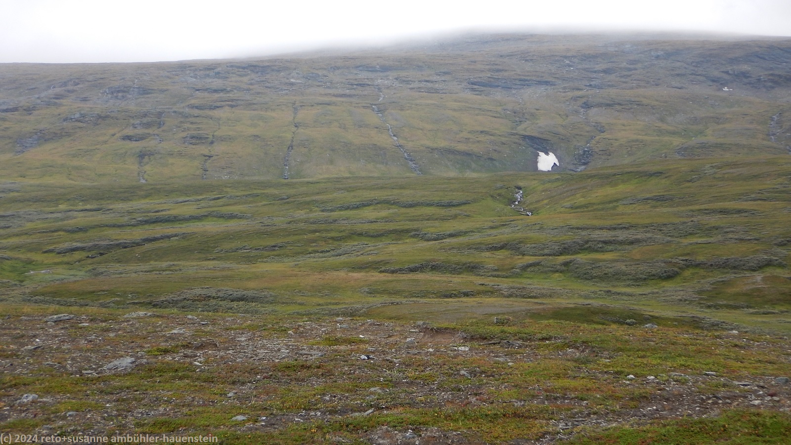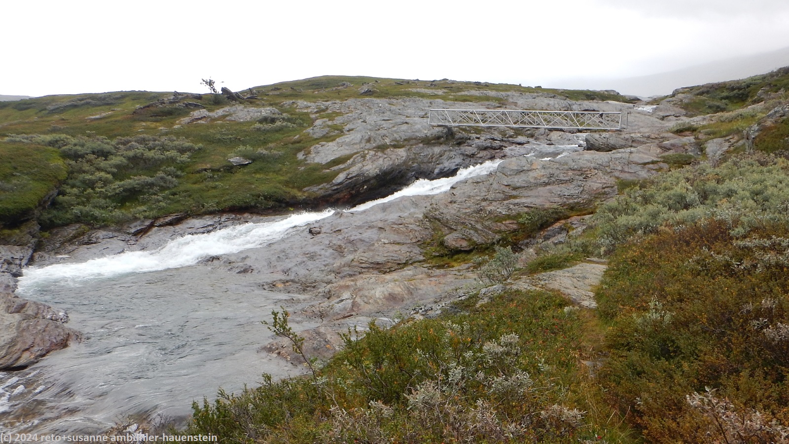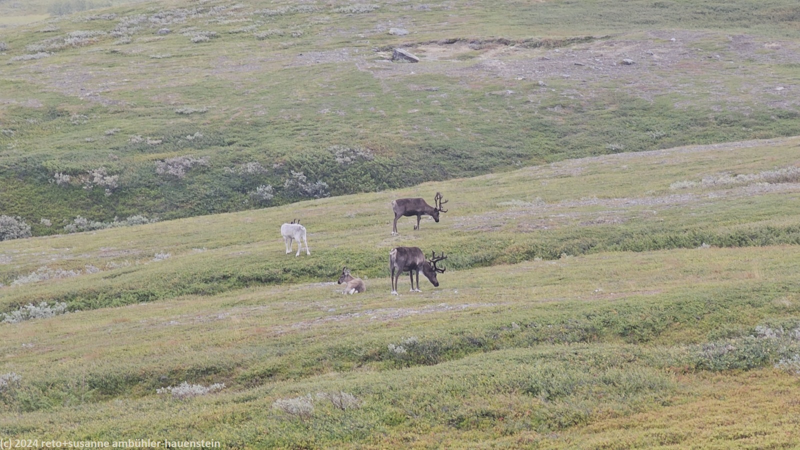 unser handy weckt uns um 7 uhr. die nacht war äusserst ruhig, ich habe sehr gut geschlafen. auch jetzt ist es im haus immer noch völlig still, offenbar sind noch alle gäste am schlafen. wir frühstücken im aufenthaltsraum mit blick auf den see. der himmel ist immer noch sehr verhangen und trüb, der wind bläst wie schon seit tagen. nach dem essen packen wir unsere rucksäcke, danach reinigen wir unser zimmer und den hintereingang. um 08:50 uhr brechen wir auf. wir überqueren die hängebrücke über den gieddejåhkå, danach steigt der weg sanft an. wenig später zweigt der nordkalottleden richtung süden ab. wir folgen dem padjelantaleden vorwiegend ostwärts. anfangs wandern wir durch niedrige birken, bei 630 m.ü.m. kommen wir über die baumgrenze. das kahle fjäll ist sehr grün, dazwischen sehen wir gelbliche und rötliche sträucher. es fällt ein leichter nieselregen, der manchmal etwas intensiver wird, dazwischen aber auch längere pausen macht. susanne hat die regenjacke angezogen, ich laufe im langarm t-shirt. am gieddávrre vorbei geht es ins weite tal des rådoljåhkå. der pfad ist grundsätzlich einfach und bequem zu begehen. er führt abwechslungsweise über offenes gelände und niedrige büsche. manchmal ist der weg ziemlich tief und sehr schmal, so dass nicht beide füsse nebeneinander platz haben. der aufstieg wird immer wieder durch kleine senken unterbrochen, so dass der weg ein bisschen einer berg- und talbahn ähnelt. bei der brücke über den ballavrijåhkå machen wir eine kurze pause. der fluss stürzt über mehrere kleine wasserfälle talwärts und macht einen ziemlichen lärm. ich liebe dieses geräusch. nach zehn minuten brechen wir wieder auf. am gegenüberliegenden hang scheint die sonne. das blaue loch in der wolkendecke ist stets vor uns, aber die sonnenstrahlen erreichen uns nicht. der weg steigt weiter sanft aber kontinuierlich an. wir wandern durch eine weite hochebene. die krete der bergkette rechts von uns ist in den wolken. gelegentlich sehen wir rentiere. gegen mittag finden uns die sonnenstrahlen dann doch noch. um 12:25 uhr picknicken wir in der nähe des ieltijávrásj zwischen grossen steinen.
