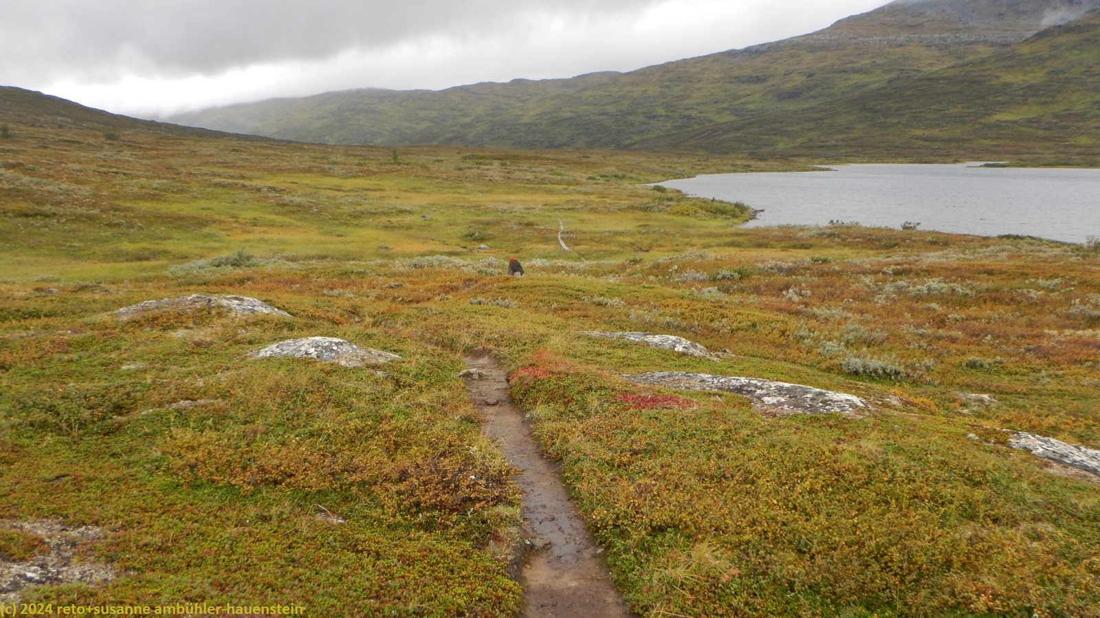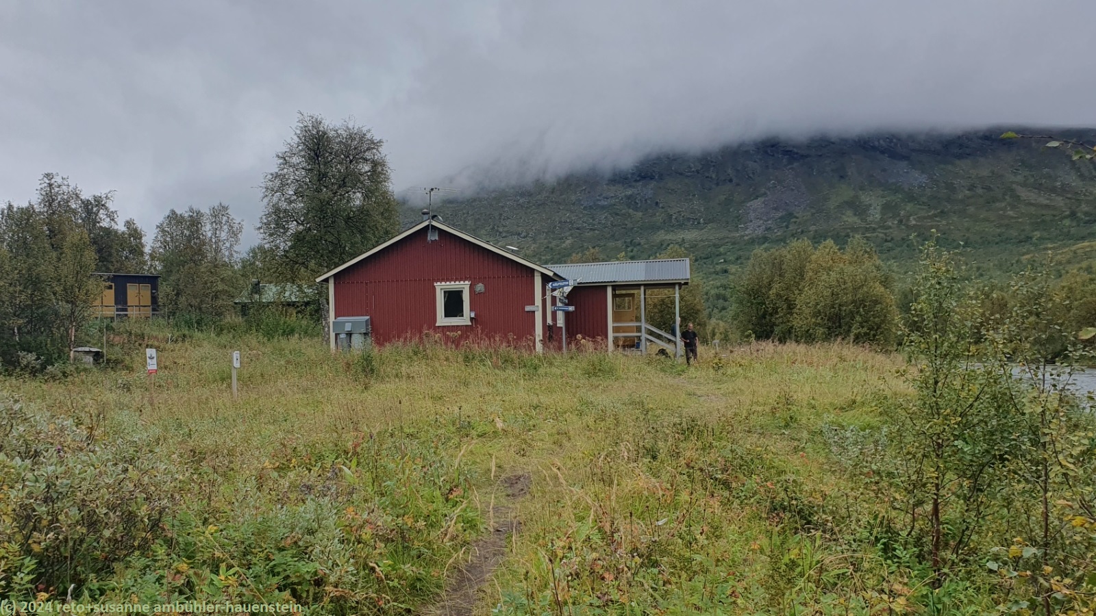 der hüttenwart empfängt uns freundlich und weist uns zwei betten im 4-bett-zimmer zu. wir werden letzteres mit einer schwedin teilen. wir richten uns in unserem zimmer ein, danach trinken wir einen kaffee. dazu gibt es etwas süsses aus dem kleinen laden des hüttenwartes. anschliessend waschen wir uns in unserem zimmer. den späteren nachmittag verbringen wir im aufenthaltsraum. der hüttenwart hat im ofen ein feuer entfacht, dieses verstrahlt eine angenehme wärme. die hütte füllt sich mehr, als der hüttenwart erwartet hat, weil vier holländer spontan entscheiden, hier zu übernachten. um 18 uhr geniessen wir unser nachtessen inklusive nachspeise. wir haben immer noch von den heidelbeeren, die susanne gestern gesammelt hat, damit ergänzen wir die vanilliesosse. das schmeckt sehr lecker. während wir essen, giesst es draussen in strömen. wie gewohnt dauert dieser zustand nicht lange. das wetter ist zwar grundsätzlich nach wie vor sehr trüb, trotzdem ist es auch wechselhaft, zumindest was wind und niederschlag betrifft. wir verbringen den abend, wie die meisten gäste, im aufenthaltsraum. erst liest susanne während ich mich am tablet beschäftige, danach spielen wir karten. gegen 21:30 uhr putzen wir unsere zähne und schlüpfen dann in unsere schlafsäcke.