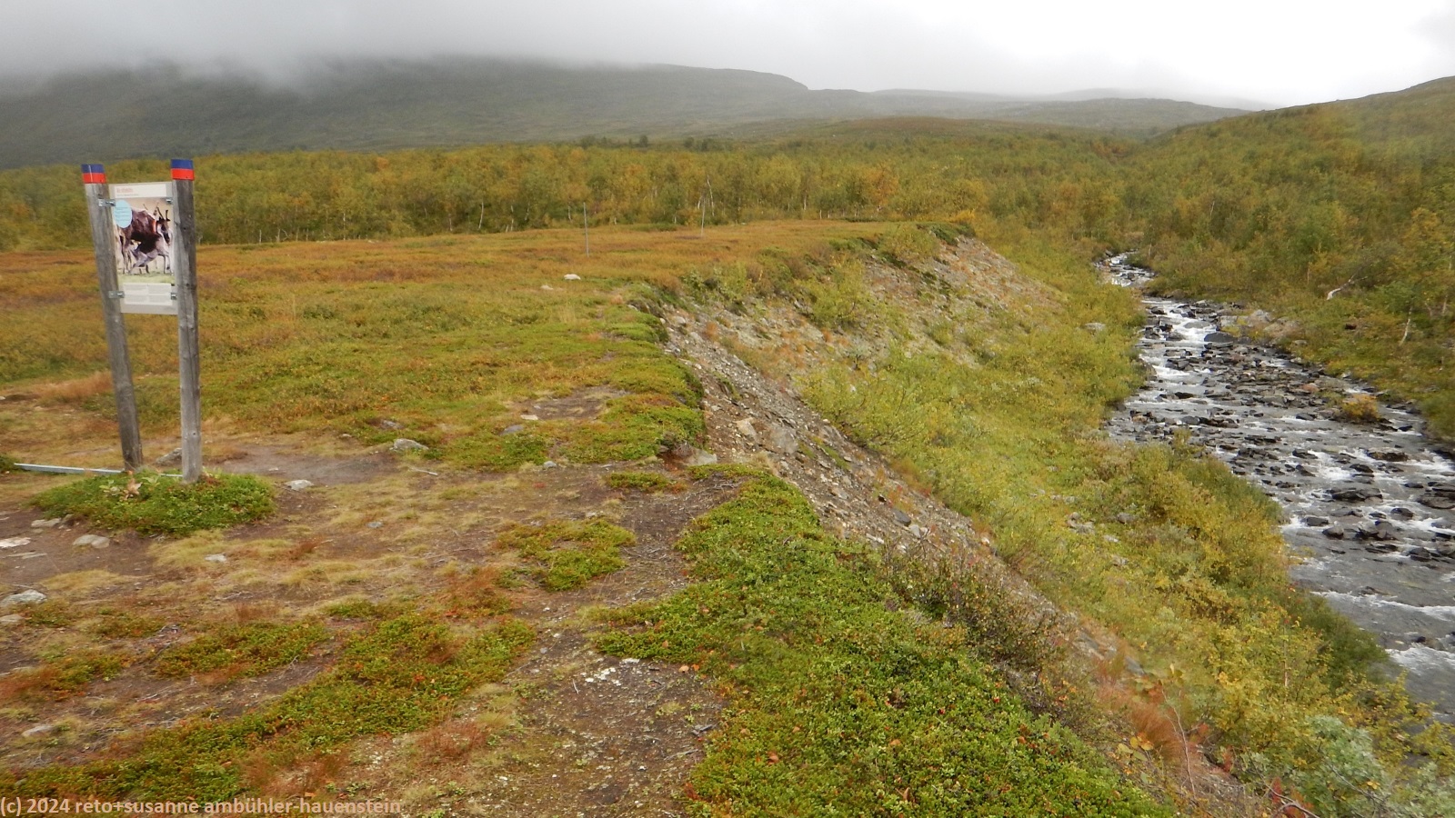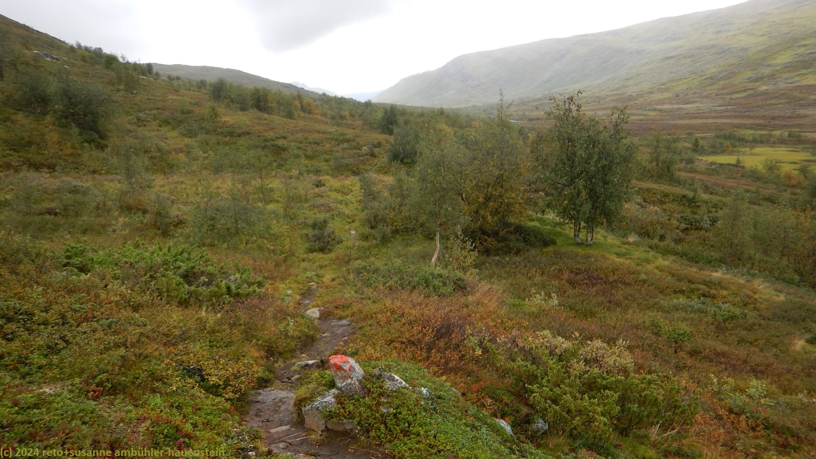 wir schlafen bis 07:15 uhr. das war wiederum eine wunderbare nacht, wir haben göttlich geschlafen. das wetter ist etwas weniger brilliant, der himmel ist verhangen und es fällt ein leichter nieselregen. der wind hat immerhin etwas nachgelassen. während wir in unserer gemütlichen hütte frühstücken, sehen wir den hüttenwart vorbeigehen. er hatte uns gestern gesagt, dass er heute morgen frisches fladenbrot backen werde und wir ab 8 uhr solches bei ihm kaufen könnten. so besuchen wir ihn nach dem frühstück in seinem büro und kaufen zwei scheiben fladenbrot. dabei erfahren wir, dass wir die vergangene nacht im sarek nationalpark verbracht hatten. das waren wir uns gar nicht bewusst. ein blick auf die karte zeigt, dass der sarek hier ein kleines stück in den padjelante nationalpark hineinragt. zurück in der hütte packen wir unsere rucksäcke, wischen den boden und entleeren das abwasser. um 09:30 uhr machen wir uns auf den weg. obwohl der himmel sehr trüb ausschaut, fällt nur ab und zu ein leichter regen. grundsätzlich wandern wir abwärts, aber auch heute ist der pfad ein auf und ab. nach knapp 800 metern gibt es schon die erste flussdurchquerung. wir entscheiden uns, die wanderschuhe auszuziehen und den fluss in unseren trockensocken zu durchqueren. es wäre schlecht, den rest des tages in nassen schuhen gehen zu müssen. wir erreichen das andere flussufer ohne probleme. nun wechseln wir das schuhwerk wieder. mit der durchquerung des gárránisjågåsj haben wir die grenze vom sarek zum padjelanta nationalpark überschritten. wenig später erreichen wir die waldgrenze. nun wechseln sich wilder birkenwald und sumpfiges gelände ab. in ersterem ist der pfad eher holprig, wenn auch nicht so sehr wie auf dem kungsleden, in letzterem geht es meistens über planken. solange wir im padjelanta nationalpark laufen, sind diese in recht gutem zustand. es ist nun meistens trocken, so dass ich meine regenjacke im rucksack verstaue. nach 6 km machen wir einen kurzen halt und essen einen stengel. die landschaft und die beschaffenheit des pfades ändern sich nur wenig. wir wandern durch das breite tal des tarrajåkkå. links und rechts säumen hügelzüge das tal. die kreten sind meistens in wolken gehüllt. nach knapp 11 km erreichen wir die parkgrenze und wechseln in das pärlälvens fjällurskog naturreservat. hier picknicken wir auf einer kleinen anhöhe. wir sehen und hören den tarrajåkkå unten im tal. am wetter ändert sich nichts, es ist trüb und windig, aber entgegen der vorhersage fast immer trocken.