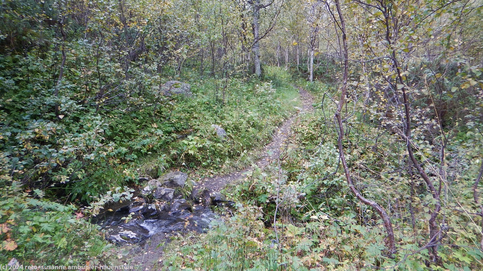 gegen 13:40 uhr brechen wir wieder auf. schon nach wenigen metern überspannt eine hängebrücke mitten im wald einen zufluss des tarrajåkkå. danach geht es wiederum abwechslungsweise durch birkenwald und sumpfgebiete. sowohl der reiseführer als auch der hüttenwart der darreluoppalstugorna warnten uns vor den rutschigen planken ausserhalb des nationalparkes. diese warnungen sind nicht übertrieben, die holzstege sind stellenweise in schlechtem zustand und extrem rutschig, besonders bei diesem nassen wetter. wir rutschen beide je einmal aus, aber ohne folgen. die letzten kilometer führen vorwiegend durch wilden birkenwald. die såmmarlappenstuga taucht erst zwischen den bäumen auf, als wir da sind.
