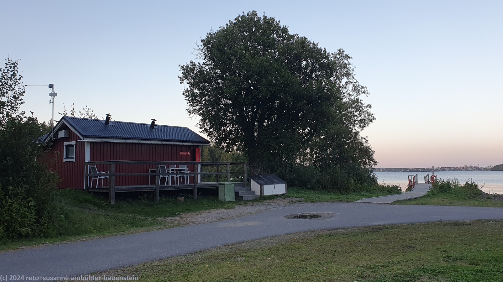 kurz nach 17 uhr sind wir wieder beim jogi. eine stunde später geniessen wir ein leckeres filet im teig. nach dem abwaschen heizen wir die sauna ein, die wir für heute abend gebucht haben. bis sie heiss ist, trinken wir eine tasse kaffee. wir machen zwei erholsame sitzungen, dazwischen kühlen wir uns im lulefjärden ab. in der nähe der sauna hat es einen wunderschönen sandstrand, das wasser ist gar nicht so kalt.