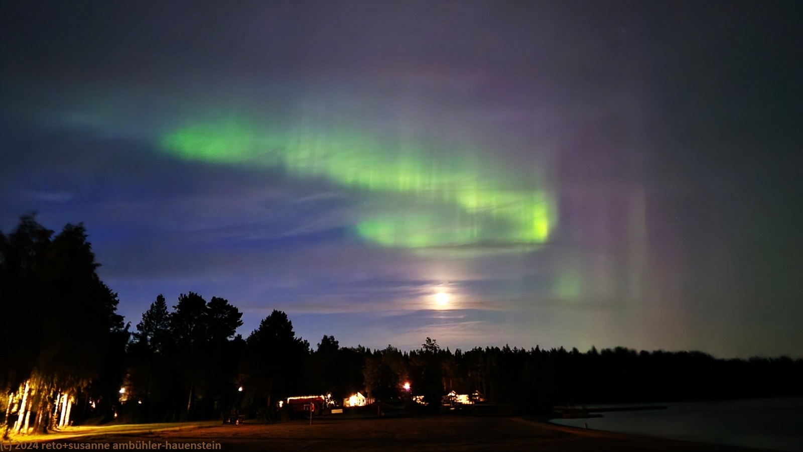 nachdem wir die sauna gereinigt haben, kehren wir zum wagen zurück. wir kommen gerade rechtzeitig, um die wunderschönen polarlichter zu beobachten, die sich am nachthimmel ausbreiten.