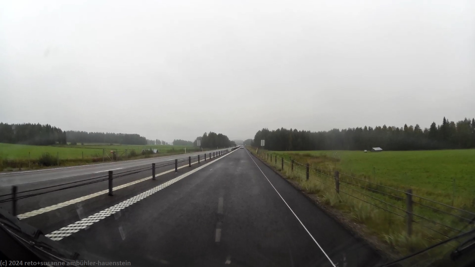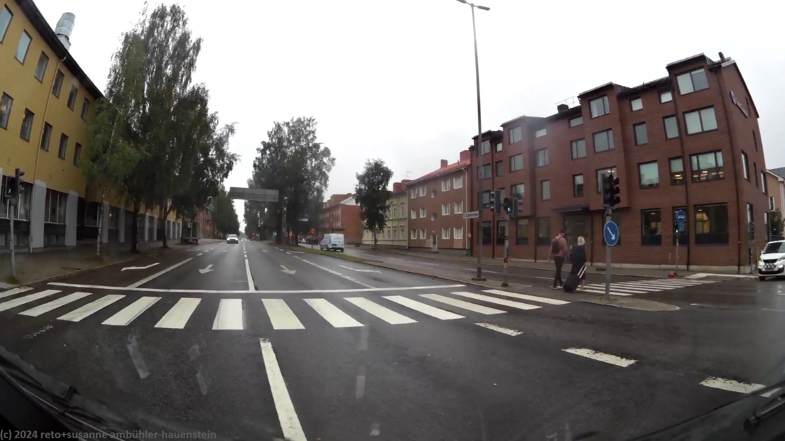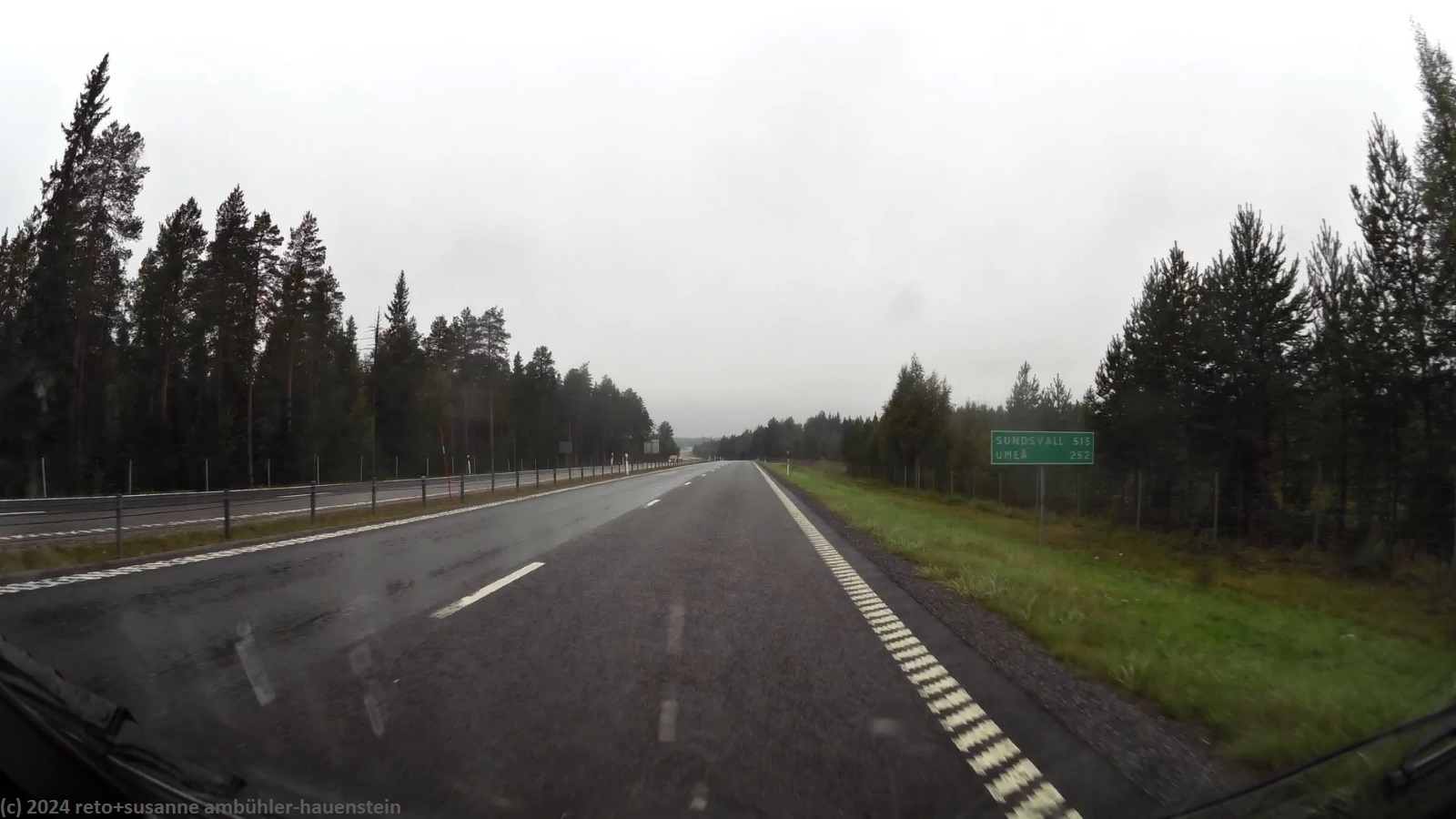 wir schlafen bis fast 9 uhr. als wir aufstehen, prasselt ein heftiger regen auf unseren jogi. wir brauchen einen schirm, um zur toilette zu gehen. nach dem frühstück im wagen machen wir uns bereit für die weiterfahrt. kurz vor 10:40 uhr verlassen wir den campingplatz. die fahrt über die E4 ist sehr entspannt, es hat viel weniger verkehr, als ich erwartet hätte. abschnittsweise ist die strasse dreispurig, manchmal hat es in unsere fahrtrichtung eine überholspur, dann in die entgegengesetzte richtung. gelegentlich gibt es einen lastwagen zu überholen, aber das verkehrsaufkommen ist äusserst gering. der regen lässt bald nach, dafür fahren wir nun durch dichten nebel. südlich von bureå werden die dreispurigen abschnitte vorübergehend seltener. südlich dieser stadt zeigt der kilometerzähler unseres wagens 368000. gegen 13:30 uhr erreichen wir umeå. susanne hat die adresse eine cafes ins navi programmiert, aber rund um die adresse sind nichts als baustellen. wir parkieren deshalb in einem nahen parkhaus und machen uns zu fuss auf die suche nach dem cafe rost.