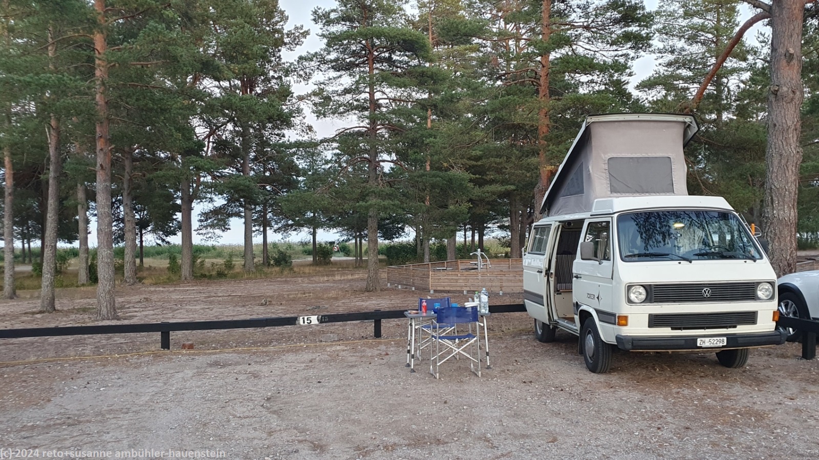 wir registrieren uns für eine nacht, dann fahren wir ins nahe kvissleby um im ICA Kvantum lebensmittel einzukaufen. zurück auf dem campingplatz geniessen wir das nachtessen im freien im licht der letzten sonnenstrahlen. während wir essen, fliegen hunderte von wildgänsen über den campingplatz und versammeln sich auf dem nahen bergafjärden.