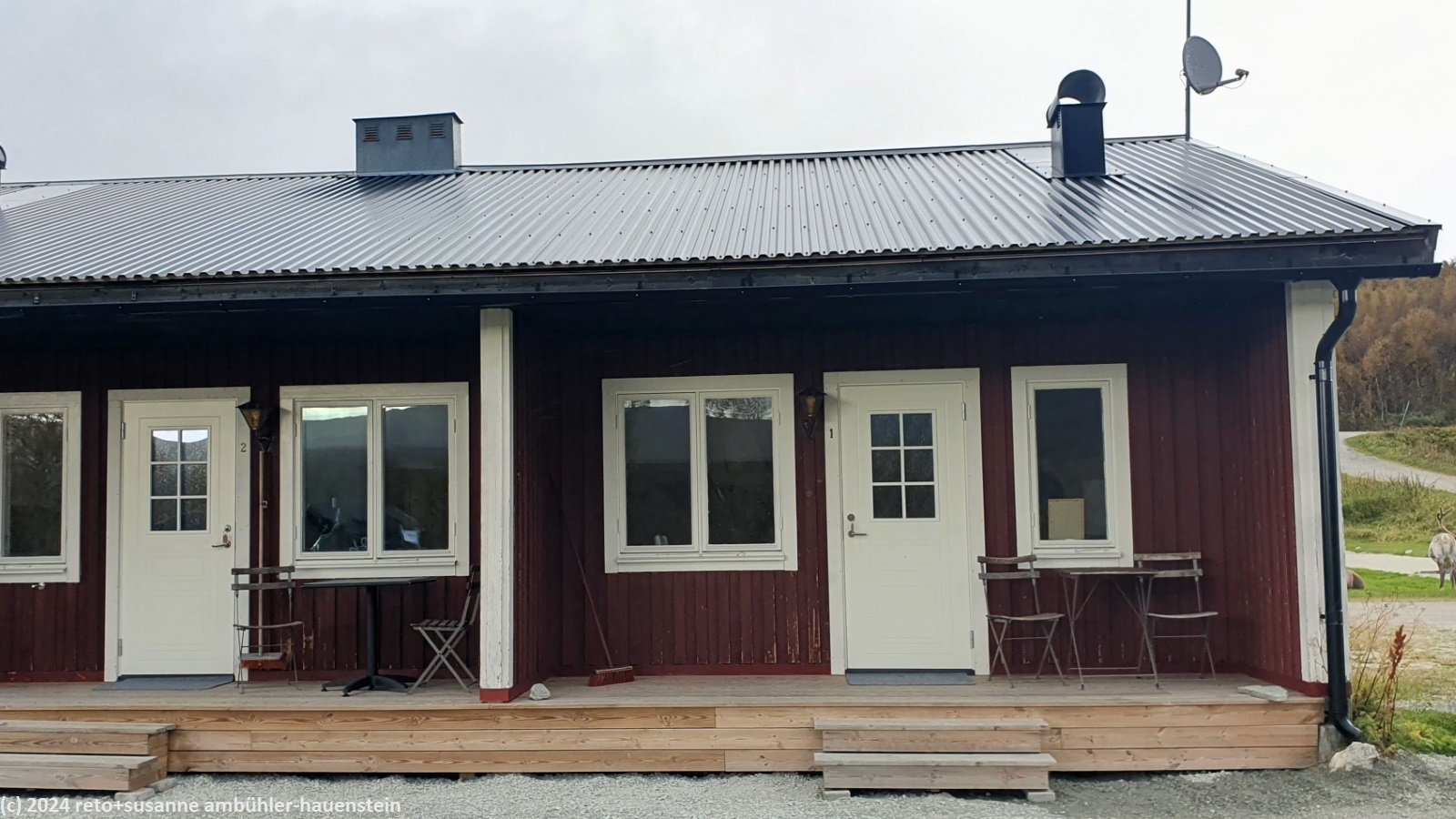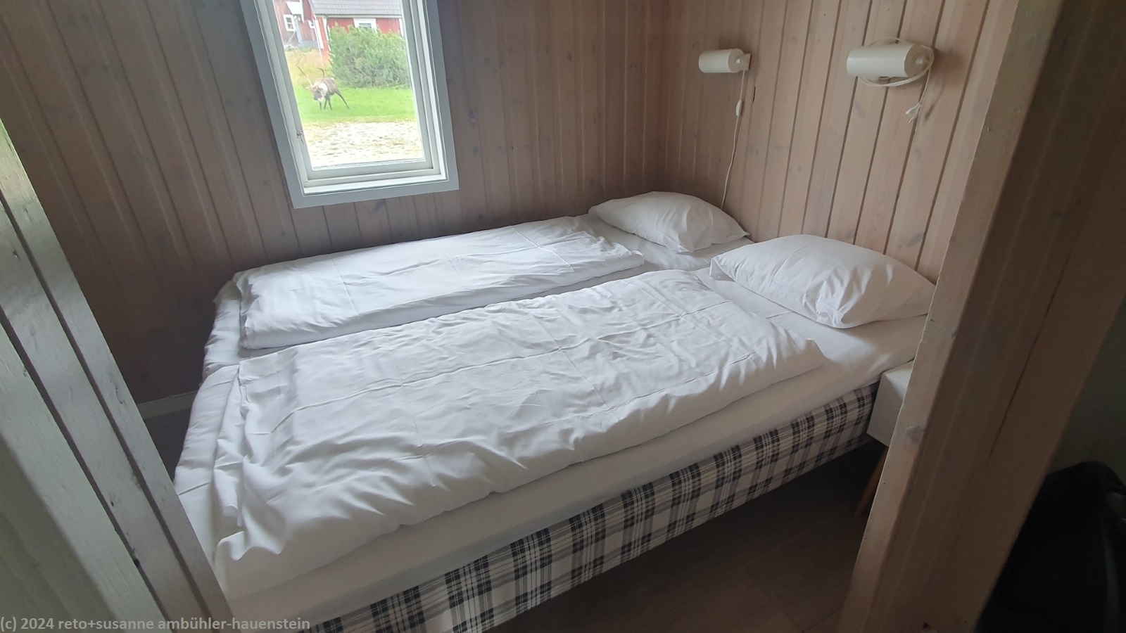 der bus fährt pünktlich. da das kartenlesegerät des busses keine verbindung zur zentrale hat, können wir die fahrkarte nicht mit kreditkarte bezahlen. so muss ich die app "länstrafiken jämtland" installieren, um den fahrpreis bezahlen zu können. ich habe allerdings den eindruck, der busfahrer hätte uns auch umsonst mitgenommen, es sei ja nicht unsere schuld, meint er. die fahrt nach funäsdalen verläuft entspannt. es sind etwa ein dutzend gäste im bus. das wetter ist weiterhin sehr wechselhaft. manchmal giesst es wie aus kübeln, bei unserer ankunft in funäsdalen hat es grössere flecken blauen himmel. wir erreichen den ort pünktlich und genauso pünktlich erscheint das taxi, welches uns nach fjällnäs bringt. die reise hat ganz wunderbar geklappt, das ist äusserst angenehm. vor dem hotel/restaurant strandgården liegen einige rentiere in der wiese und lassen sich durch unsere ankunft nicht im geringsten stören. eine dame, die sagt, sie sei hier gast, aber gerade damit beschäftigt ist, den rasen zu mähen, ruft die besitzerin unserer unterkunft an. diese kommt sofort aus dem haus und begrüsst uns äusserst freundlich. wir beziehen unsere hütte und richten uns ein. die unterkunft ist sehr gemütlich. es gibt eine kleine küche, einen esstisch mit vier stühlen und einen clubtisch mit zwei sesseln. im weiteren hat es ein schlafzimmer mit einem doppelbett und eines mit einem etagenbett sowie ein schönes badezimmer mit WC und dusche.