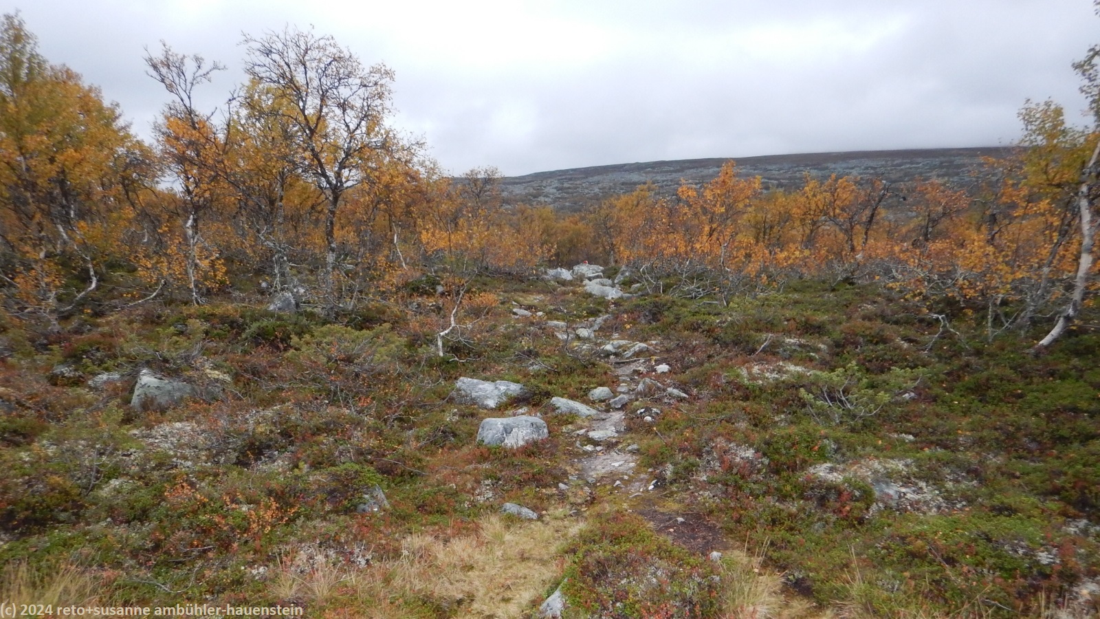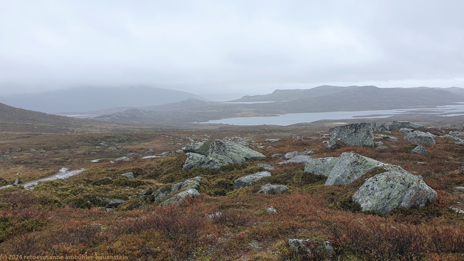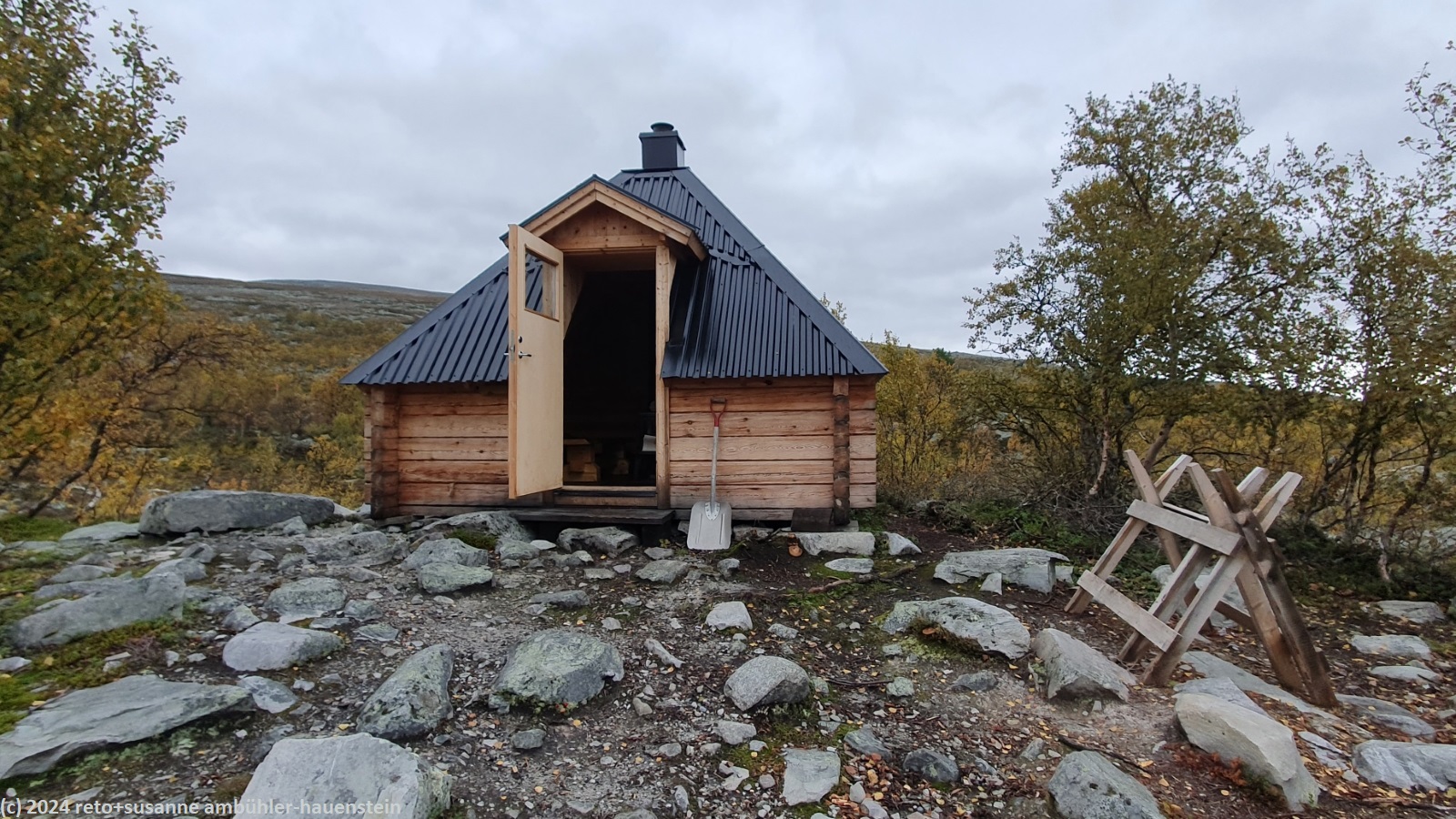 wir essen nur einen teil davon, einiges nehmen wir mit auf unsere wanderung. nach dem üppigen frühstück reinigen wir unsere hütte, dann melden wir uns bei unserer gastgeberin ab. wir wandern dem malmagen entlang am uns wohlbekannten campingplatz "fjällnäs camping & lodges" vorbei - dort haben wir vergangenes jahr vor und nach unserer wanderung über den nördlichen teil des südlichen kungsleden übernachtet, siehe tagebücher vom 27-jul-2023 und vom 05-aug-2023. leider endet der weg nach knapp 800 meter und wir müssen 1.5 km der landstrasse entlang gehen. glücklicherweise fahren hier sehr wenige autos. kurz nach dem mächtigen wasserfall zu unserer linken biegen wir nach rechts auf eine unbefestigte mautstrasse ab. diese steigt enorm steil an. während wir an höhe gewinnen, setzt der angekündigte regen ein. ich schütze mich erst mit dem schirm, aber als wir über die baumgrenze kommen, nimmt der wind stark zu und es bleibt mir nichts anderes übrig, als auch das regenzeug anzuziehen. je höher wir auf das kahle fjäll kommen, umso widerlicher wird das wetter. der wind wird immer heftiger und bläst uns den regen ins gesicht. nach etwa 5 km meint susanne: "warum tun wir uns dies noch an ?". die wettervorhersage war wirklich übel, wir hätten doch noch ein oder zwei tage warten können, meint sie. da wir die hütten entlang der route alle schon gebucht und bezahlt haben, ist eine verschiebung zwar nicht unmöglich, aber halt doch aufwändig. und so trotzen wir dem wetter und wandern bei garstigsten bedingungen über das bestimmt wunderschöne fjäll, wenn man es sehen könnte. in einer senke machen wir einen kurzen halt und essen einen stengel. bis zur ersten hütte sind es etwas mehr als 28 km. unser plan ist es, etwa die hälfte zu gehen und dort im zelt zu übernachten. morgen wollen wir dann den rest bewältigen. aber da, wo ich die übernachtung geplant hatte, ist nicht daran zu denken, das zelt aufzubauen. es giesst und stürmt und so gehen wir einfach weiter. gemäss reiseführer hat es nach etwa 18 km eine schutzhütte, die allerdings in einem üblen zustand sein soll. aber egal wie schmutzig die schützhütte auch sein soll, sie bietet uns hoffentlich etwas schutz vor dem wetter. so marschieren wir tapfer weiter. der weg wird immer holpriger, hohe und rutschige steine versperren den weg bzw. wollen überstiegen werden. gegen 16:45 uhr erreichen wir die schutzhütte und erleben eine äusserst erfreuliche überraschung: die hütte ist ganz neu und in tadellosem zustand.