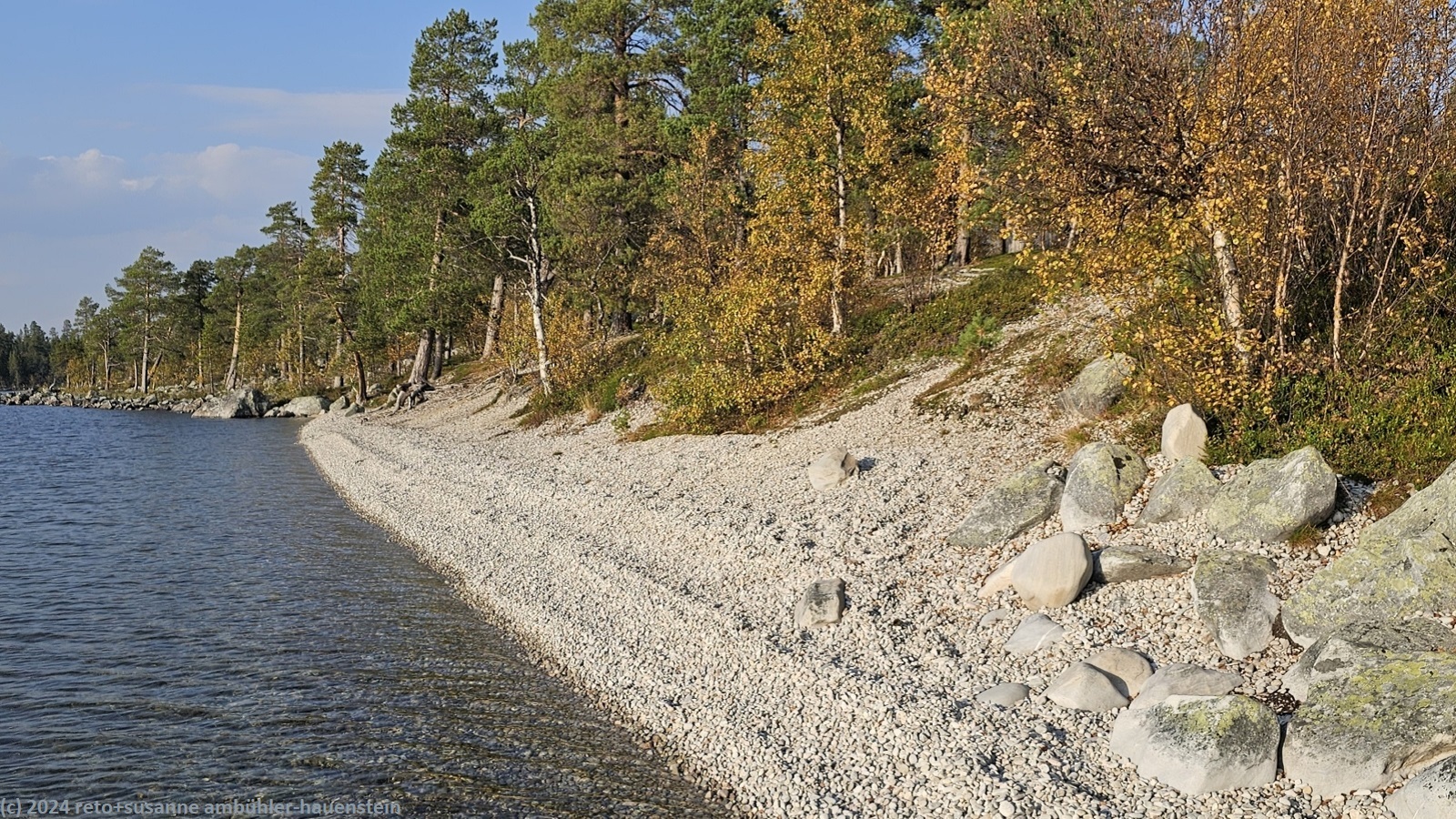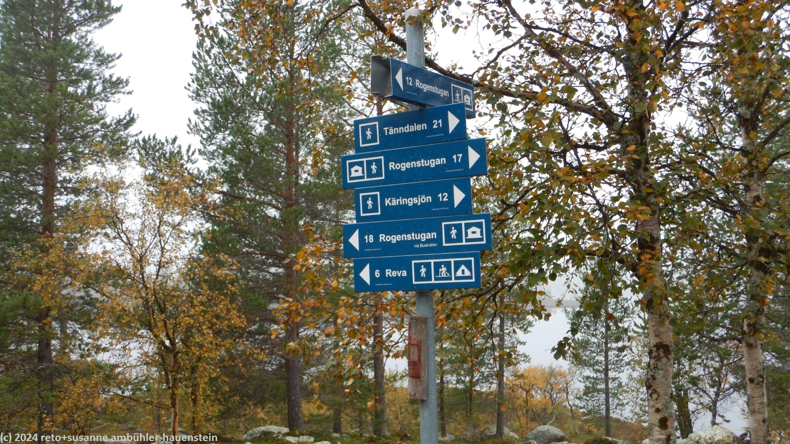 wir stehen um 7 uhr auf und nehmen überrascht zur kenntnis, dass es draussen regnet, obwohl ein sonniger tag angesagt ist. als wir um 08:30 uhr aufbrechen, hat der regen aufgehört, aber es herrscht dichter nebel. der blick über den see hat etwas mystisches. nach 75 minuten sind wir bei der abzweigung richtung reva und damit nur noch knapp 750 meter von norwegen entfernt. der nebel hat sich inzwischen aufgelöst und während wir an den beiden gipfeln des bustvålen vorbei wandern, scheint die sonne wie vorhergesagt. als wir gegen 12:45 uhr bei einer schutzhütte am rogen rasten, ist es so warm, dass wir uns am see abkühlen. nach dem mittagessen folgen wir dem ufer des rogen und erreichen kurz nach 16:30 uhr unser tagesziel rogenstugan. der hüttenwart begrüsst uns freundlich. um 18 uhr dürfen wir uns in die schöne und geräumige sauna setzen. zwischen den sitzungen kühlen wir uns im glasklaren see ab. nach dem nachtessen erleben wir eine wunderschöne abendstimmung über dem see.