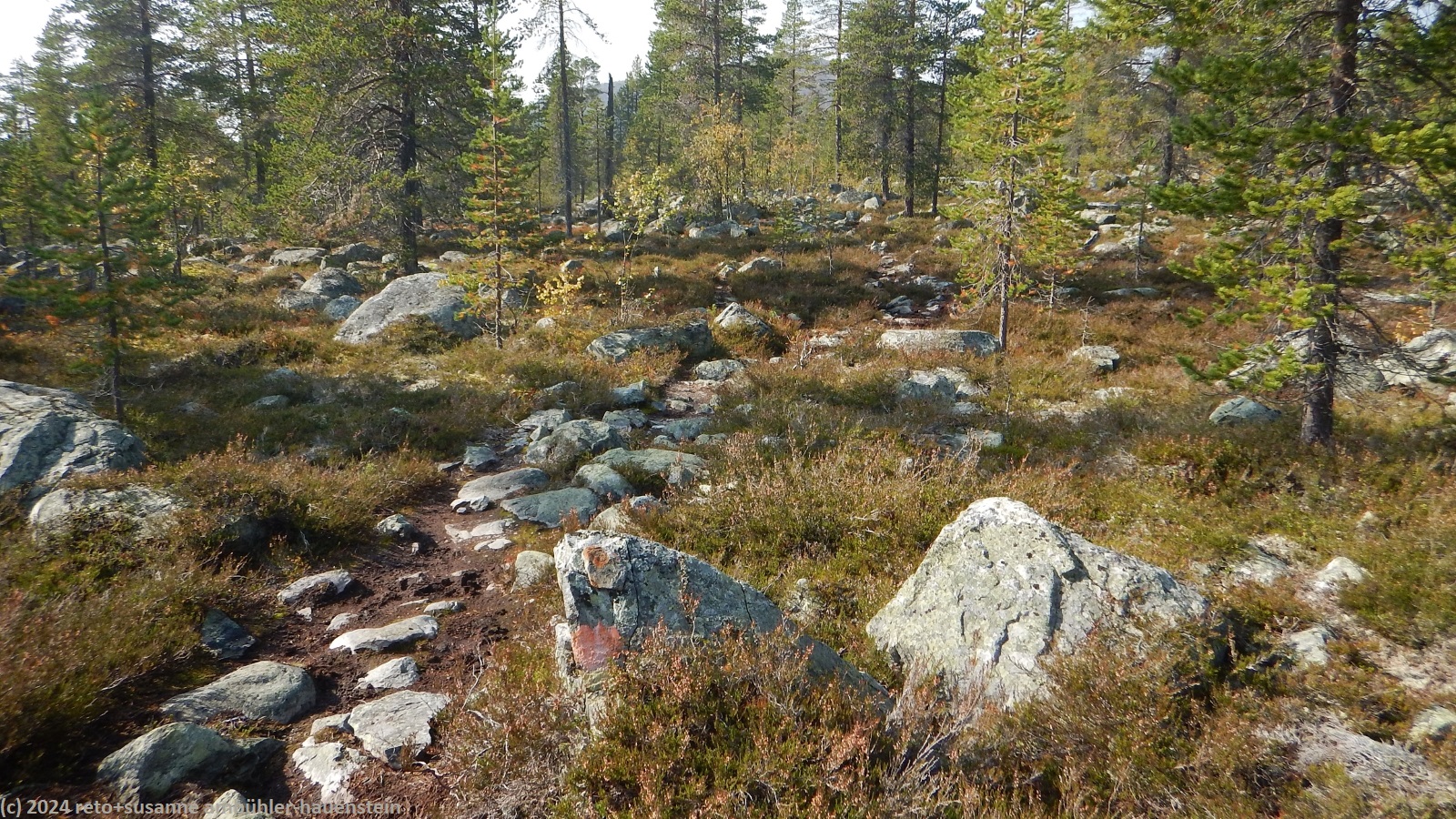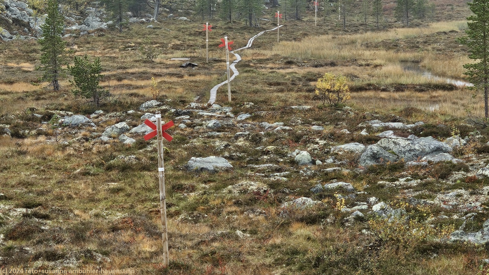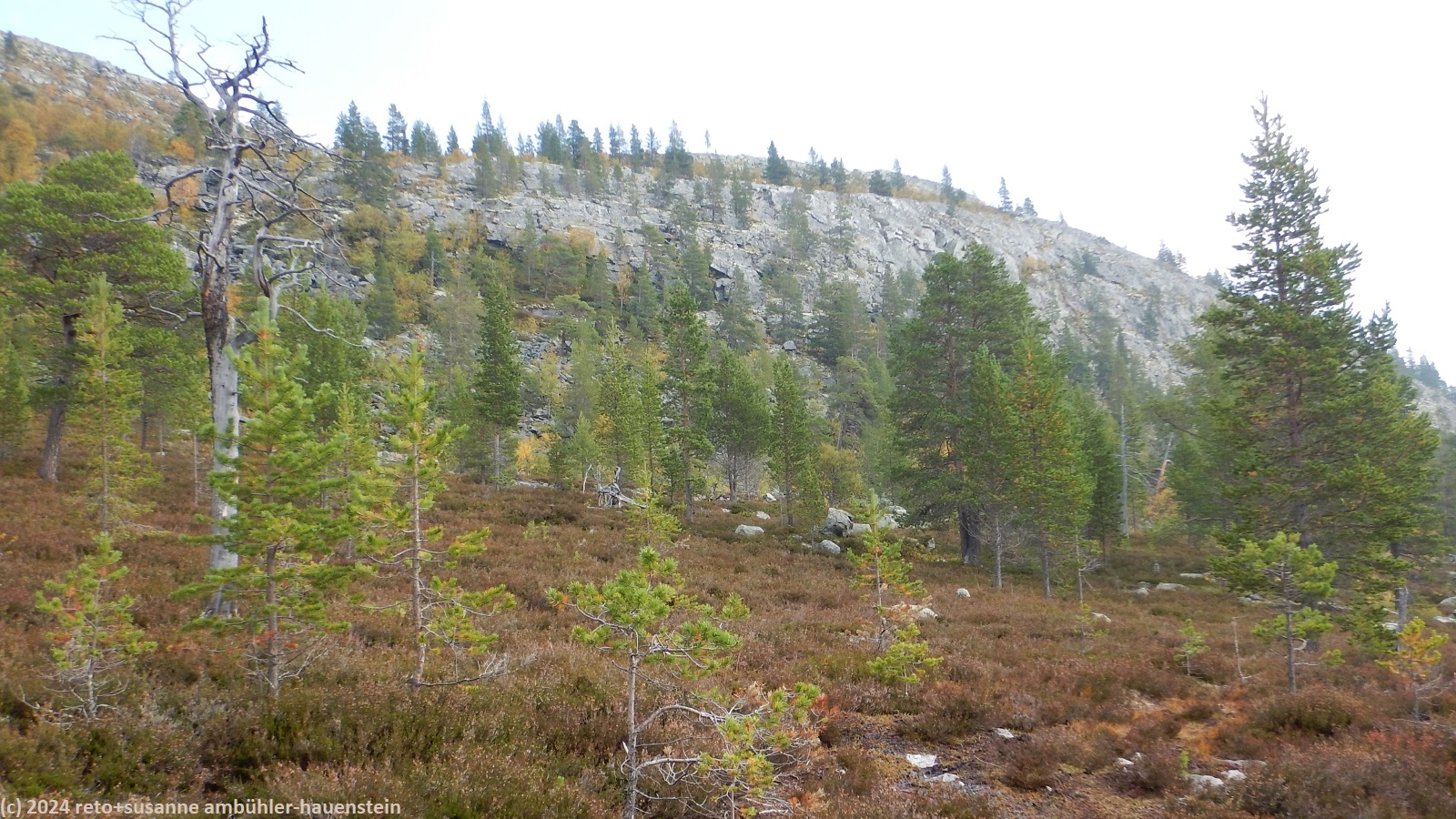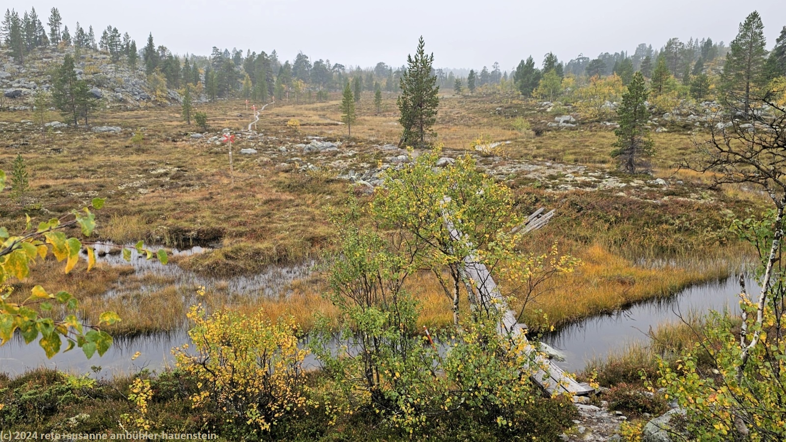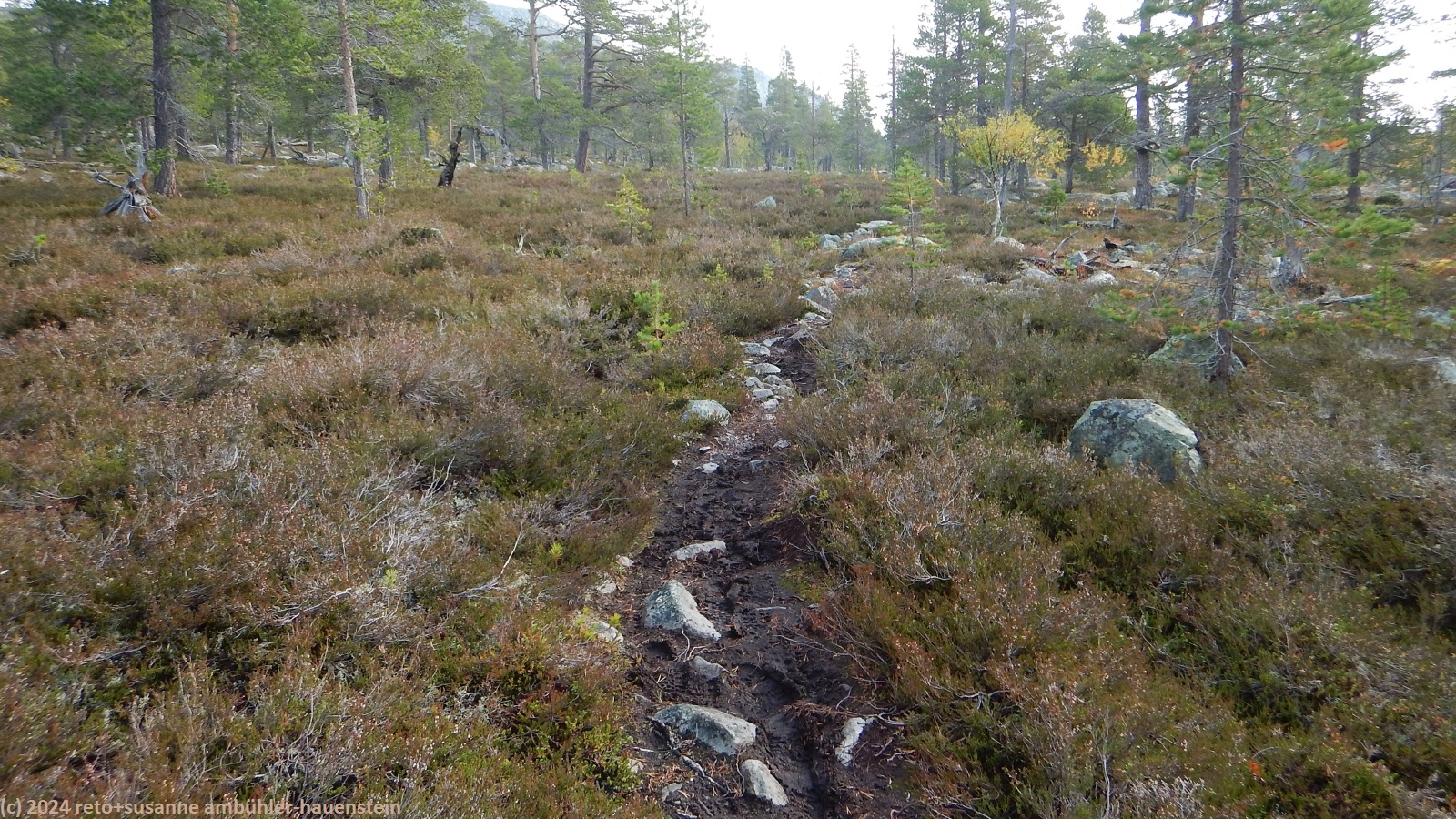 unser handy weckt uns um 7 uhr. ich habe wunderbar geschlafen, susanne "es geht so". als ich zur toilette gehe, stelle ich überrascht fest, dass es regnet. damit haben wir überhaupt nicht gerechnet, es ist ein sonniger tag angesagt. nach dem frühstück packen wir unsere rucksäcke und reinigen unseren hausteil. als wir aufbrechen, hat der regen aufgehört, aber der himmel ist ziemlich verhangen. allerdings sind es keine wolken, sondern nebel. anfangs präsentiert sich der pfad ähnlich wie gestern, sehr holprig und steinig und enorm rutschig. die landschaft ist wunderschön, richtung westen sehen wir seen und die hohen norwegischen berge. kurz vor 10:15 uhr erreichen wir die abzweigung richtung reva. die grenze zu norwegen ist knapp 750 meter entfernt. wir bleiben jedoch auf dem kungsleden und wandern nun ostwärts, womit wir uns wieder von der schwedisch/norwegischen grenze entfernen. inzwischen hat sich der nebel verzogen. die sonne scheint, am blauen himmel hat es nur wenige, vereinzelte wolken. schon am morgen war es drückend warm, jetzt kommen wir richtig ins schwitzen. der pfad führt durch einen schönen wald, vorbei an den beiden gipfeln des bustvålen. der waldboden ist dicht bewachsen, dazwischen liegen weit verstreut felsbrocken. wir überqueren die flanke des bustvålen wobei der weg kontinuierlich ansteigt. manchmal ist er ganz gut zu begehen, dann ist er wieder mit steinen übersät oder führt durch sehr nasses gelände. der kleinere gipfel hat auf unserer seite eine beeindruckende felswand. kurz nach der brücke über die verbindung zwischen dem öster-rödsjön und dem rödviken hat es am seeufer einen sehr schön gelegenen windschutz. meine frau nutzt den sandstrand für ein kurzes bad, ich erfrische mich ohne ins wasser zu gehen. danach essen wir im windschutz unsere brote und haben dabei eine tolle aussicht auf den rogen.