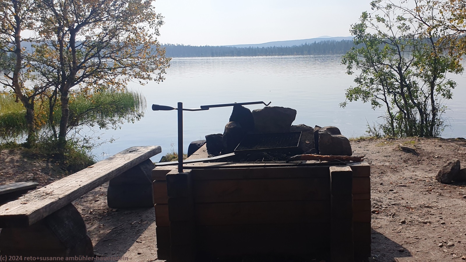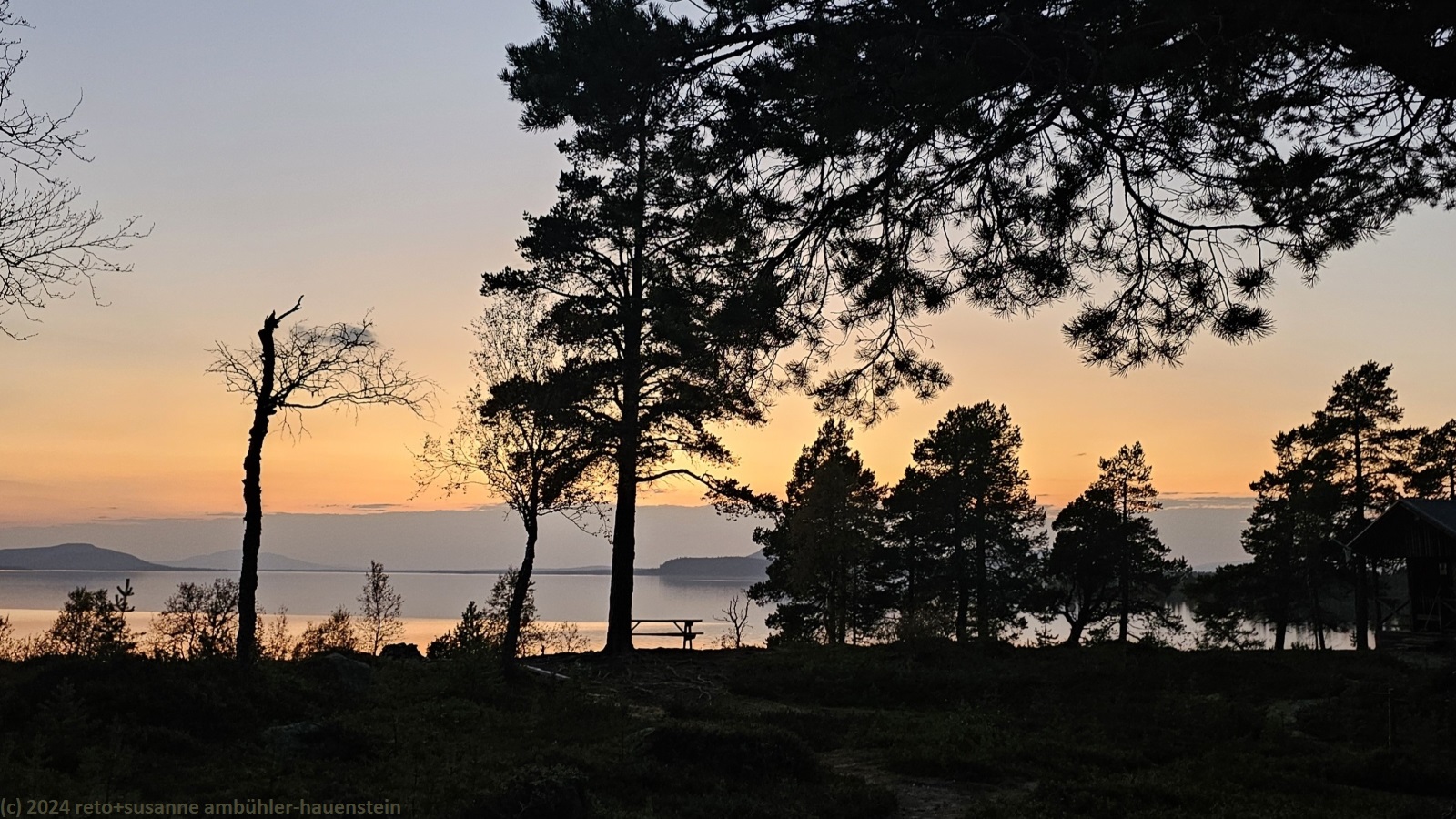 danach machen wir zwei sitzungen in der sauna, dazwischen kühlen wir uns im glasklaren see ab. zurück in der hütte bereitet susanne das abendessen zu. dieses geniessen wir mit fantastischer aussicht auf den see. während susanne liest und ich tagebuch schreibe, färbt sich der himmel über dem see wunderschön rot und violett.