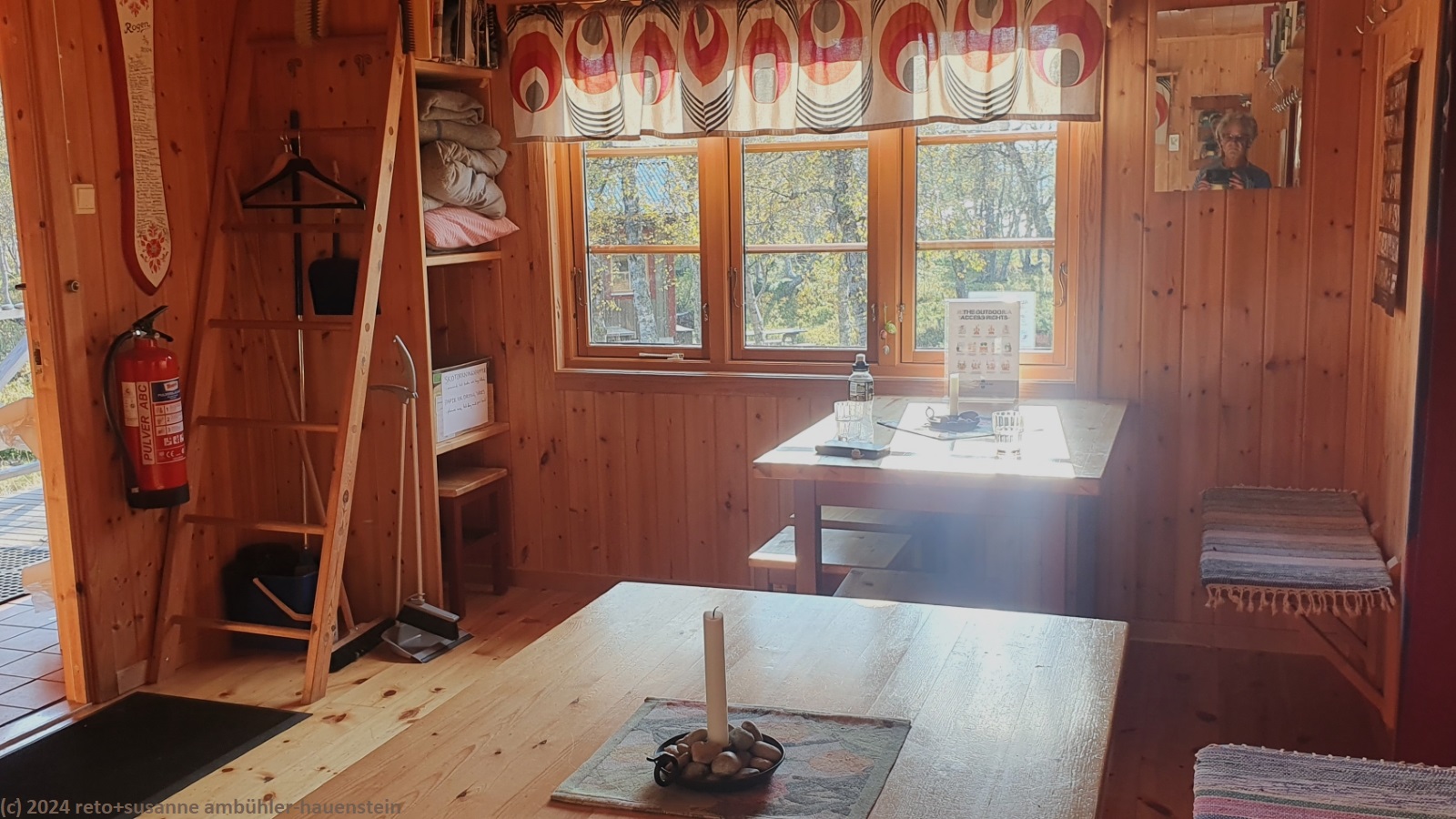 die aussicht von der hütte auf den rogen und die dahinterliegenden berge ist fantastisch. der hüttenwart begrüsst uns freundlich und meint, wir seien im moment die einzigen gäste. er erwartet noch ein schwedisches paar, welches aber erst spät ankommen wird. wir erhalten ein glas preiselbeersaft, der schmeckt fantastisch. auch diese stuga hat zwei räume mit je zwei schlafnischen. allerdings gibt es hier nur vier betten pro nische und nicht fünf, wie in den meisten anderen hütten dieser art. wir dürfen den einen raum in beschlag nehmen.