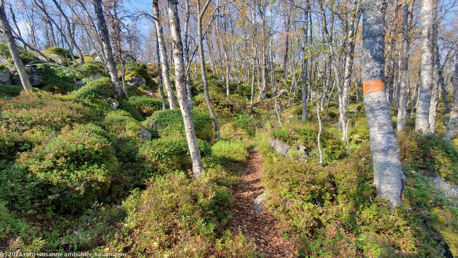 nach 15 minuten brechen wir wieder auf. eine brücke führt über die verbindung zwischen dem hävlingen und dem särsjön. hier füllen wir unsere trinkflaschen auf. der pfad folgt nun ein kurzes stück dem südlichen seeufer. wir haben eine fantastische aussicht über den hävlingen, in welchem sich der herbstliche wald spiegelt. dann dreht der weg langsam richtung süden und entfernt sich damit vom see. solange wir durch den wald wandern, ist der weg äusserst mühsam zu begehen, über der waldgrenze wird es einfacher. der weg steigt weiter kontinuierlich an, wobei die steigung eher abnimmt. gegen 12:30 uhr sind wir auf der höhe der schutzhütte särsjöbäcken. diese liegt knapp 250 meter vom wanderweg entfernt, direkt am winterpfad. querfeldein gehen wir zu hütte und essen auf deren treppe bei strahlendem sonnenschein zu mittag.
