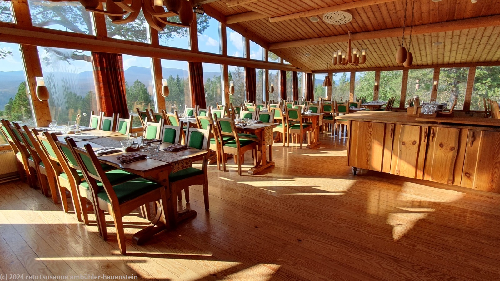 wir richten uns im zimmer ein, danach geniessen wir eine enorm erfrischende dusche. pünktlich um 17:30 uhr sind wir im restaurant. hier gibt es keine präsentation der küchenmannschaft, sondern es wird sofort die vorspeise serviert. die hauptmahlzeit dürfen wir am buffet holen. es gibt salate, kartoffelstock, mischgemüse und lachsburger. das schmeckt alles sehr gut. zur nachspeise wählt susanne einen blaubeerkuchen und ich vanilleeis mit moltebeeren. nach dem essen setzen wir uns in den gemütlichen leseraum. susanne liest, ich schreibe tagebuch. um 21:15 uhr ziehen wir uns in unser zimmer zurück und schlüpfen wenig später ziemlich erschöpft in unsere schlafsäcke.