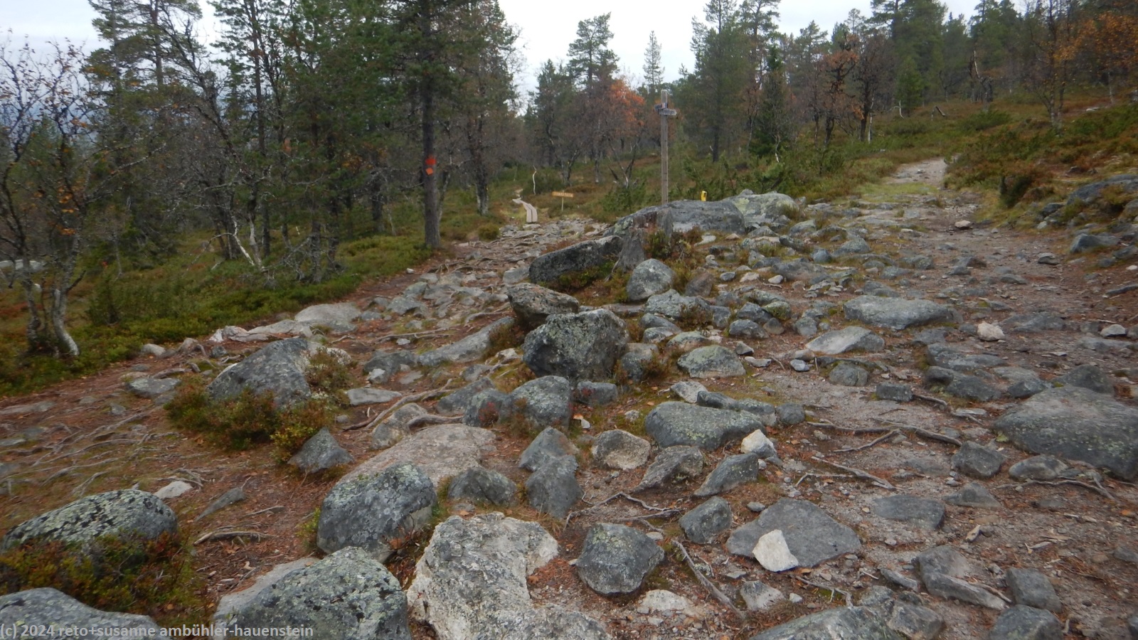 der himmel ist zwar immer noch bewölkt, aber wir sehen nun ab und zu blaue flecken und manchmal sogar für einen kurzen moment die sonne. der weg folgt erst ein kurzes stück dem grøvelåa entlang richtung ryvang, dann geht es südwärts. der pfad steigt nun recht steil an und führt durch einen wunderschönen herbstwald. anfangs geht es über die berüchtigten steine, aber mit dem leichten rucksack geht das viel einfacher. auf etwa 850 m.ü.m erreichen wir die baumgrenze. der weg steigt nun etwas weniger steil an. der wanderweg ist hier nicht ein einziger pfad, sondern es verlaufen mehrere trampelpfade mehr oder weniger parallel neben- und durcheinander. aus der ferne könnte man die wanderwege als strasse interpretieren. während dem aufstieg begegnen wir immer wieder anderen menschen. viele sind tagesausflügler wie wir, andere haben viel gepäck dabei und sind wohl länger unterwegs. auf dem weg zum höchsten punkt bläst uns ein mässiger wind ins gesicht. mit 1065 m.ü.m haben wir ersteren erreicht. nun senkt sich der pfad sanft talwärts. wir würden gerne picknicken, aber das ist gar nicht so einfach. wir befinden uns im femundsmarka nationalpark und entlang des weges hat es immer wieder schilder, dass man den pfad nicht verlassen darf. so direkt am weg essen möchten wir aber auch nicht. schliesslich kommen wir an einem grösseren felsen knapp neben dem weg vorbei, bei diesem rasten wir.