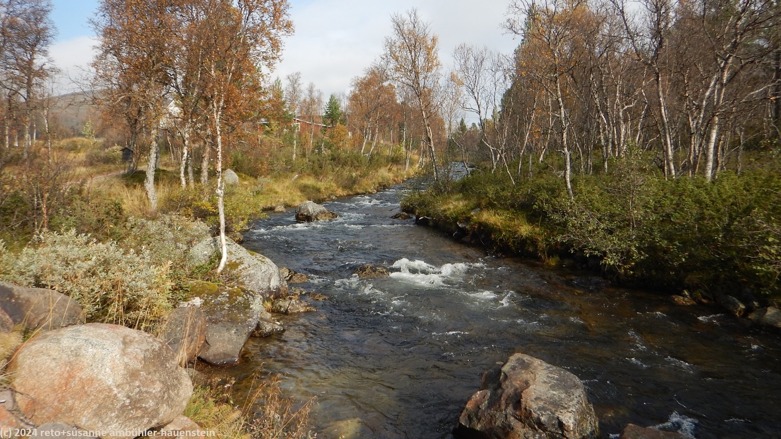während wir unsere brote verzehren, zeigt sich das wetter von allen seiten. erst scheint die sonne, dann fallen einige regentropfen, angereichert wird das ganze mit einem böigen wind. nach gut 30 minuten wird uns langsam kalt und wir setzen unsere wanderung fort. es geht nicht lange, da scheint die sonne wieder. der abstieg richtung grövelsjön ist einfach zu begehen. nach knapp 1 km überschreiten wir die grenze zwischen norwegen und schweden, damit endet unser kurzer ausflug nach norwegen. schon bald erreichen wir die waldgrenze und wenig später sind wir bei der markanten hängebrücke über den grövlan.