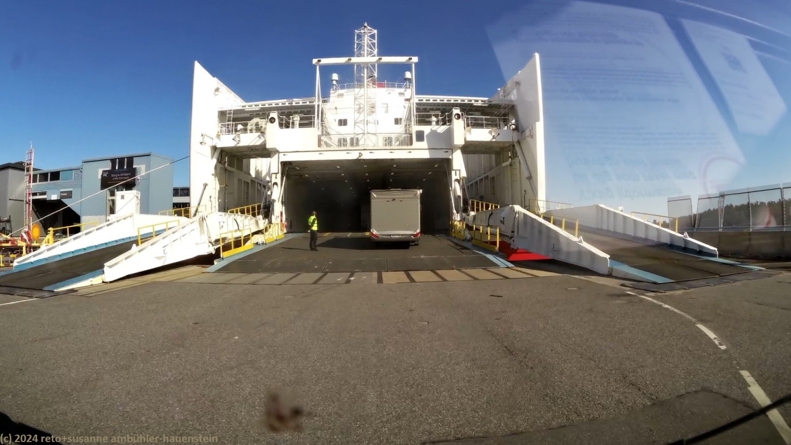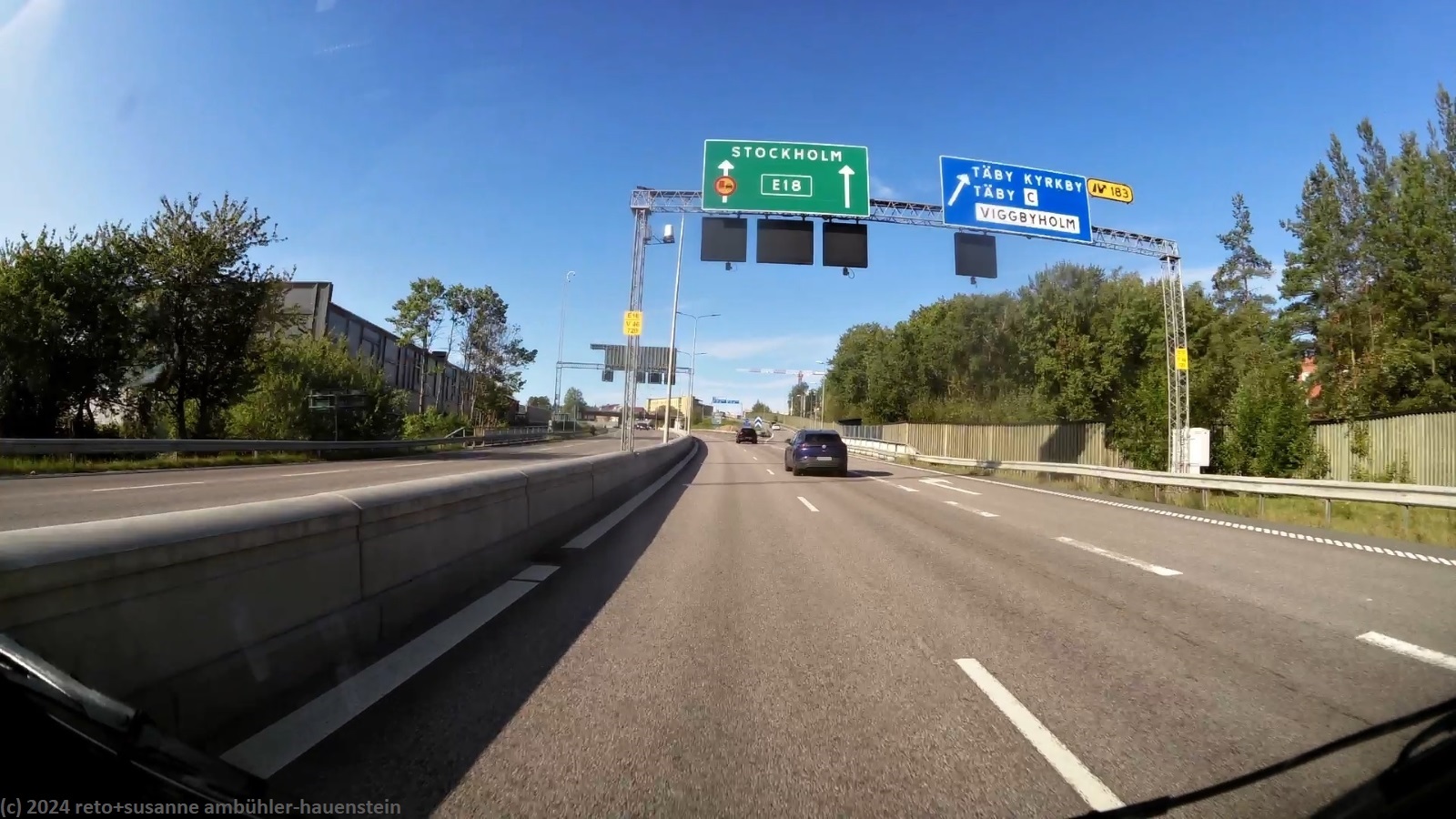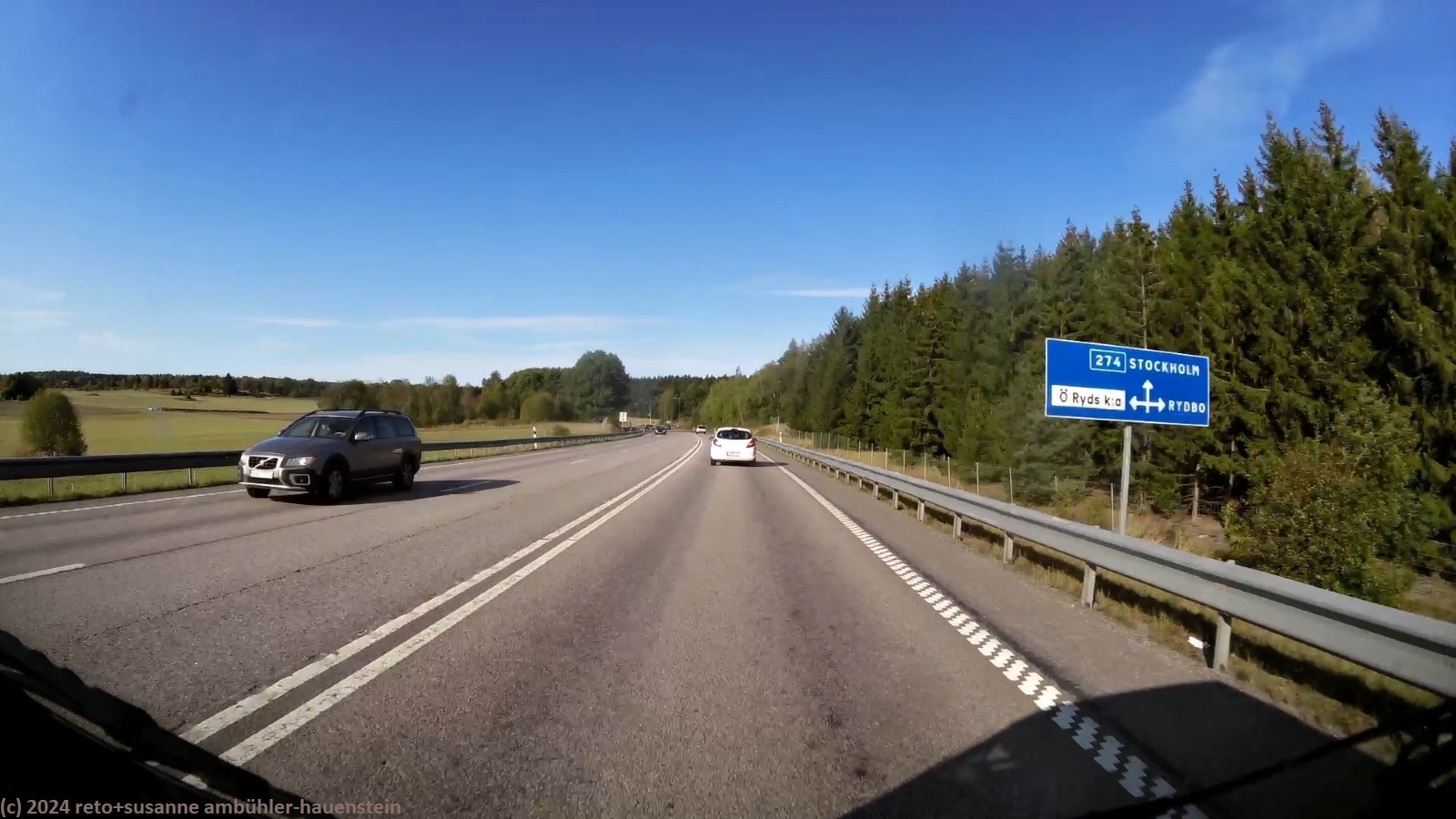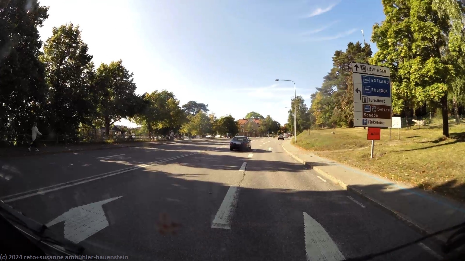 unser handy weckt uns um 07:30 uhr. wieder erwartet uns ein strahlend blauer himmel, so dass wir im freien frühstücken können. wie geplant machen wir uns um 09:30 uhr auf den weg richtung nynäshamn. erst geht es bei regem verkehr über die strasse 274 westwärts. vorallem in der gegenrichtung sind viele autos unterwegs. viele stockholmer machen wohl an diesem sonnigen tag einen sonntagsausflug heraus aus der stadt. bei arninge tanken wir unseren wagen auf, dann geht es auf der autobahn E18 richtung schwedens hauptstadt. erstaunlicherweise schlägt unser navi vor, mitten durchs stadtzentrum zu fahren. uns scheint das keine so gute idee, wir folgem deshalb dem autobahnring E20 und umfahren die stadt. auch hier herrscht dichter verkehr, aber wir kommen sehr gut voran, so dass wir unseren entscheid nicht bereuen. südlich der stadt geht es auf der autobahn 73 südwärts richtung nynäshamn. der verkehr nimmt rasch ab, nachdem wir die 70er-zone endlich hinter uns haben, geht es zügig vorwärts. kurz vor 11 uhr sind wir im hafen von nynäshamn. der check-in geht problemlos. noch bleiben knapp 45 minuten bis zur fahrplanmässigen abfahrt. susanne liest im auto, ich schreibe tagebuch. plötzlich setzen sich die fahrzeuge vor uns in bewegung. rasch nehme ich hinter dem steuer platz und fahre an bord.