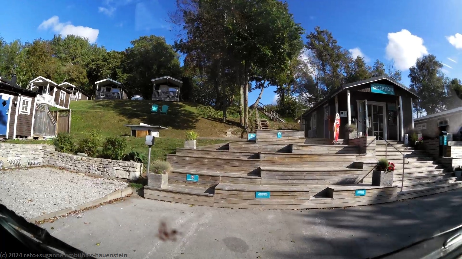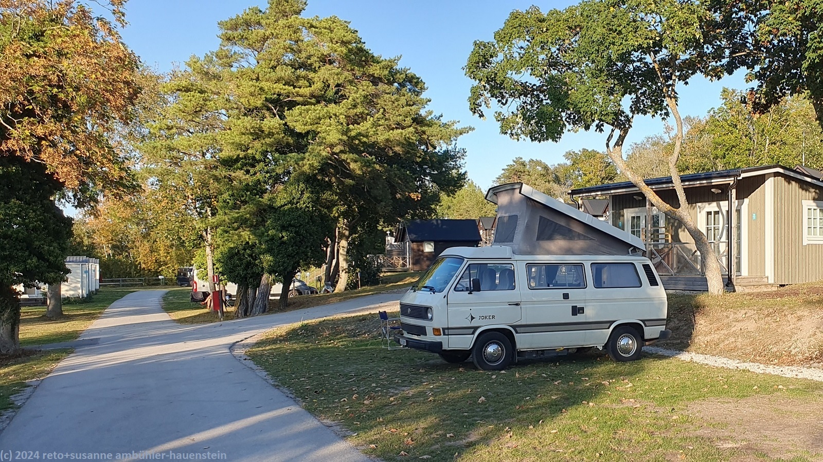 gegen 13 uhr setzen wir uns ins restaurant und essen eine kleinigkeit. die fähre ist gut besetzt, es ist nicht einfach, im restaurant einen freien sitzplatz zu finden. als wir fertig sind mit essen, entdecken wir freie sitze am fenster. hier geniessen wir kaffee und einen muffin. wir schauen noch einmal die websites der campingplätze auf gotland an und kommen zum selben schluss wie gestern: der einzige platz, der noch offen hat, ist der strandby am nördlichen stadtrand von visby. wir machen eine buchung für drei nächte. für den rest der überfahrt liest susanne, ich arbeite am computer. etwa 20 minuten vor der geplanten ankunft packen wir zusammen und kehren zum auto zurück. das entladen geht zügig. fünf minuten nach der geplanten ankunftszeit sind wir schon von bord. die fahrt zum campingplatz dauert knapp zehn minuten. zu unserer überraschung ist die reception offen. wir hatten die website so verstanden, dass diese ab heute geschlossen sei.