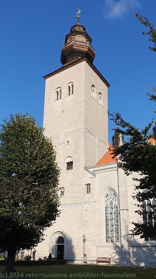 wir stehen um 07:30 uhr auf und frühstücken bei strahlend blauem himmel im freien. zwei stunden später machen wir uns auf dem weg. auf der strasse 274 kommen uns viele autos entgegen, vermutlich vorwiegend sonntagsausflügler. wir umfahren stockholm auf der E20 und biegen dann südlich der stadt auf die autobahn 73 ab. hier nimmt der verkehr rasch ab und die lästige geschwindigkeitsbegrenzung auf 70 km/h wird endlich aufgehoben. kurz vor 11 uhr sind wir im hafen von nynäshamn. der check-in klappt problemlos und 30 minuten später sind wir an bord. zu beginn der überfahrt sitzen wir auf dem oberdeck. später begeben wir uns ins restaurant und essen eine kleinigkeit. die fähre ist gut besetzt, es ist nicht einfach, einen freien tisch zu finden. um 15 uhr erreichen wir visby und stehen wenig später beim empfang des camping visby strandby. zu unserer überraschung ist die reception geöffnet und wir bestätigen unsere registrierung für drei nächte. danach gehen wir einkaufen. anschliessend spazieren wir durch die altstadt, wo wir einen tee trinken. zurück auf dem campingplatz geniessen wir das nachtessen im jogi, denn draussen ist es inzwischen kühl geworden. nach dem abwaschen planen wir die kommenden tage auf gotland.