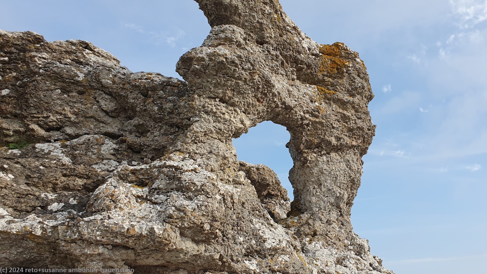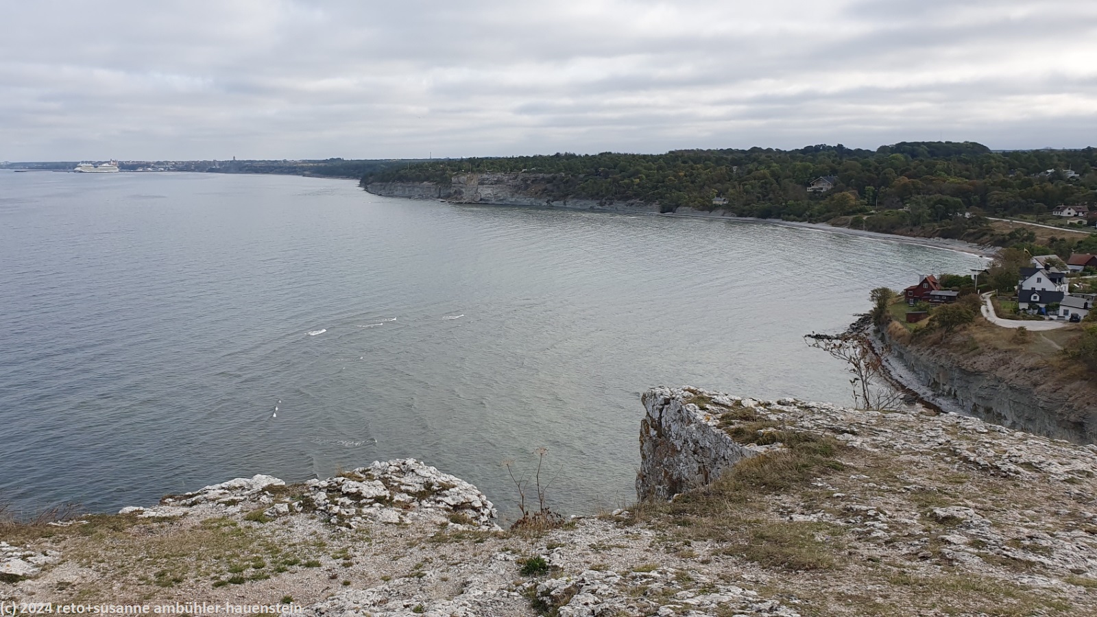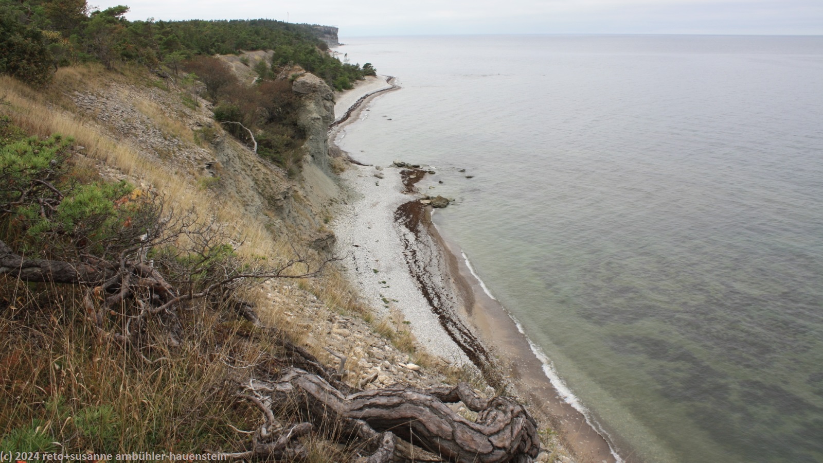 diese bis zu knapp 50 meter hohe steilküste erstreckt sich wenige kilometer südwestlich von visby. ganz in der nähe des parkplatzes befindet sich der höchste punkt der küste. von hier hat man eine tolle aussicht auf den hafen von visby. eine metalltreppe führt auf etwa halbe höhe der steilküste hinab. unter dem höchsten punkt hat es eine höhle. bei manchen ausgesetzten felsen sieht man tiefe risse im boden, da halten wir uns lieber fern. wir folgen dem weg entlang der klippe. dieser senkt sich langsam richtung meereshöhe. nach etwa einem kilometer kommen wir zum wasser hinunter. der strand ist mit rundgeschliffenem kies übersät. allerdings hat es auch angeschwemmte algen, die sehen etwas weniger hübsch aus. ein schmaler pfad führt auf die kante der steilküste hinauf, dann geht es auf dem gleichen weg zurück zum parkplatz.
