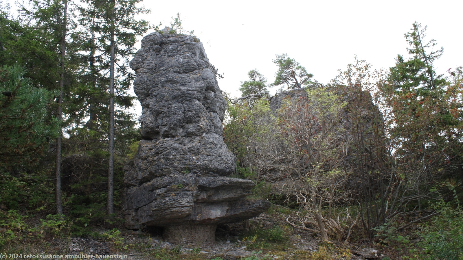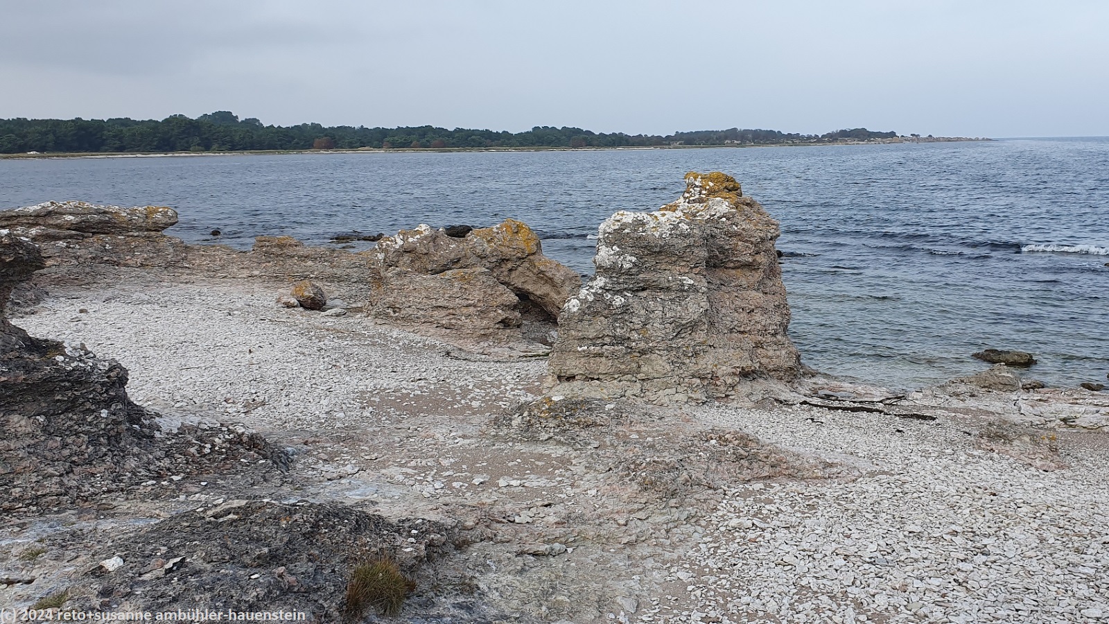 wieder kehren wir zur strasse 140 zurück. wir folgen nun der westlichen küste südwärts. ab klintehamn verläuft die strasse im landesinneren. gegen 13 uhr erreichen wir burgsvik. auf wunsch meiner frau verzichten wir darauf, im einzigen restaurant zu mittag zu essen und fahren weiter bis hoburgen in der nähe der südspitze von gotland. dort picknicken wir an einem tisch des geschlossenen restaurants. um diese jahreszeit hat fast alles auf dieser insel zu. nach dem essen spazieren wir zu den raukar, welche auch hier zahlreich vorhanden sind.