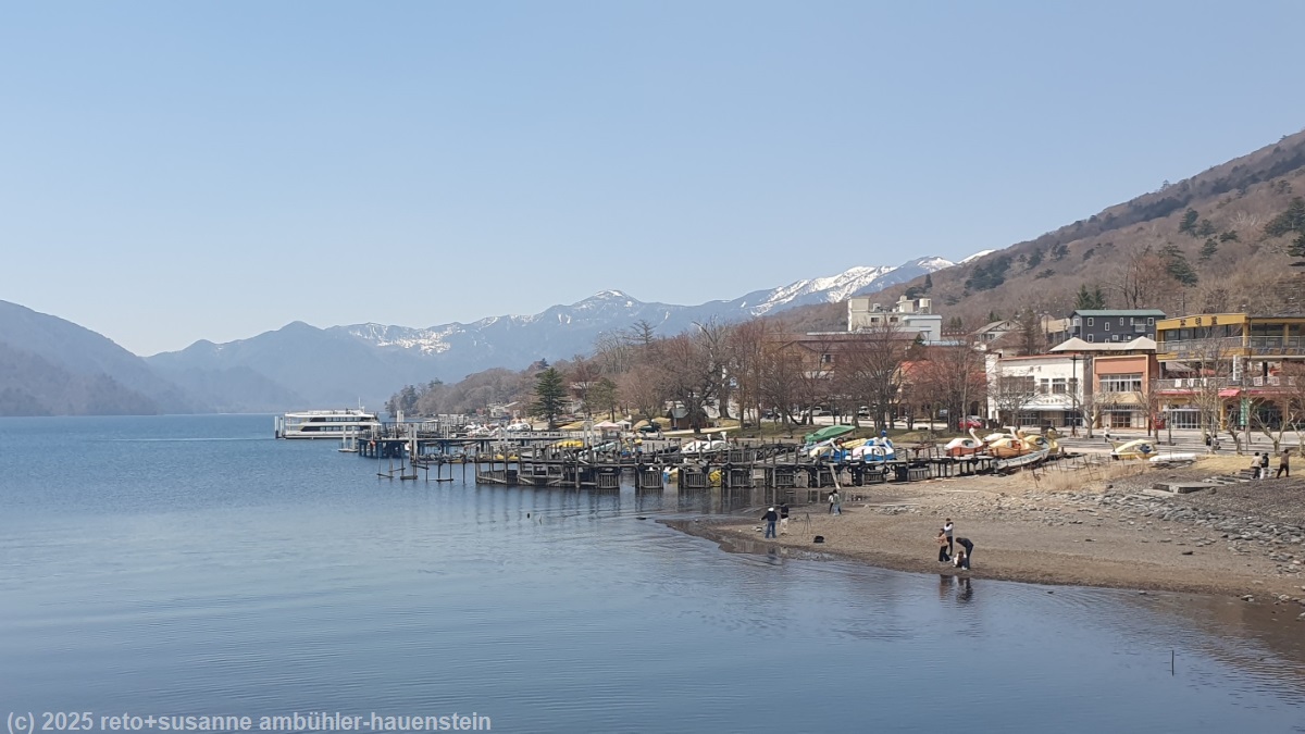 es empfängt uns ein bedeckter himmel und es bläst ein kühler wind. vor der weiterfahrt haben wir zeit, im nahen familymart picknick einzukaufen. mit einem bus fahren wir zum lake chunzenji, einem hübsch gelegenen see auf über 1200 m.ü.m. die fahrt führt über eine äusserst spektakuläre, kurvenreiche strasse. bis chugushi hat es über ein duzend spitzkehren. von der bushaltestelle spazieren wir zum seeufer und folgen diesem richtung westen. der wanderweg verläuft zwischen der strasse 120 - genannt "japan romantic highway" - und dem steinigen seeufer. gegen dorfende hat es hoch über dem see einen holzsteg mit bänken. auf einer solchen essen wir zu mittag. der himmel hat sich aufgehellt, die sonne scheint, aber der kühle wind bläst nach wie vor.