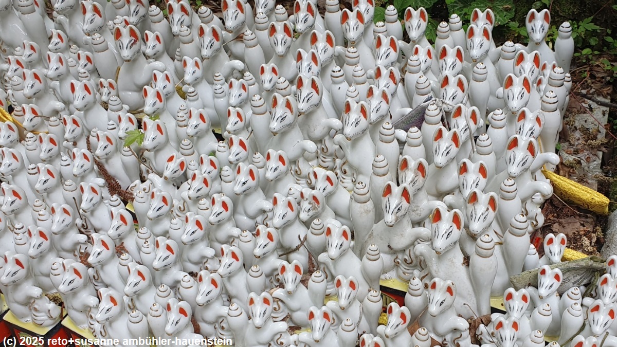 bis zum nächsten tempel gehen wir durch ein wohnquartier. wir staunen über die kleinen häuser, die sich dicht gedrängt aneinander reihen. eine längere und ziemlich steile treppe führt zum sasuke inari schrein hinauf. in der liebevoll gestalteten anlage hat es hunderte von winzig kleinen figuren. wir sind uns nicht ganz sicher, ob diese hunde darstellen - ich muss beim wort "inari" jedenfalls an die huskies in inari im norden finnlands denken.