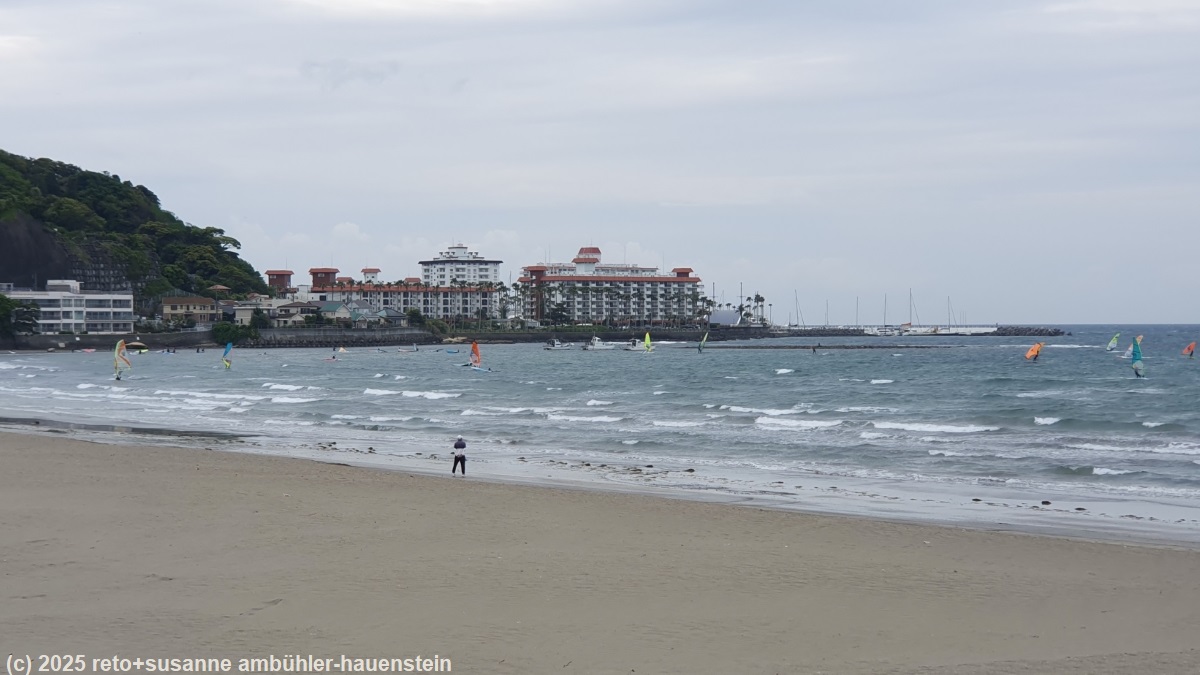 wir machen einige bilder der zweitgrössten buddha-statue japans und marschieren danach weiter richtung küste. dabei kommen wir am hase-dera tempel vorbei. auf der zubringerstrasse sind aber so viele leute unterwegs, dass wir auf einen besuch verzichten. im daisy's cafe mit blick auf die yuigahama bucht essen wir zu mittag. unsere reisgerichte mit fleisch schmecken sehr lecker. nach dem essen bummeln wir dem strand entlang bis zur riesigen siedlung zushi marina. es ist für uns nicht klar, ob die wohnungen permanent bewohnt sind, oder ob das ferienappartements sind. es herrscht zwar kaum betrieb, aber wir sehen einige schulkinder in den häusern verschwinden. reger betrieb herrscht dafür auf dem wasser. duzende surfer geniessen wind und wellen und schiessen mit ihren bunten segeln in der bucht hin und her.