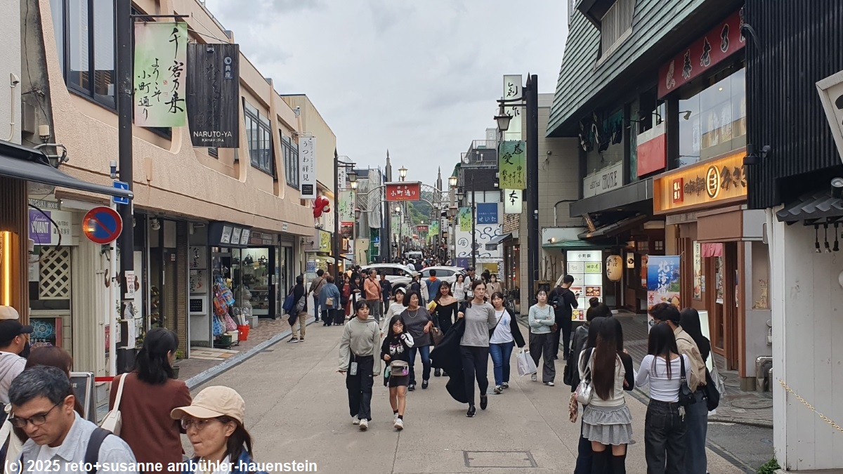 wir machen uns auf den rückweg richtung ortszentrum und kommen dabei durch ausgedehnte wohnquartiere. als wir uns dem bahnhof nähern, nimmt die anzahl menschen deutlich zu. wir finden ein hübsches cafe und geniessen kaffee, tee und kuchen. zudem erledigen wir den check-in für den morgigen flug nach fukuoka. noch bleibt eine stunde bis der zug fährt. wir entdecken zufällig beim bahnhof eine typisch japanische strasse mit zahllosen kleinläden. hier finden wir auch japanisches vermicelles.