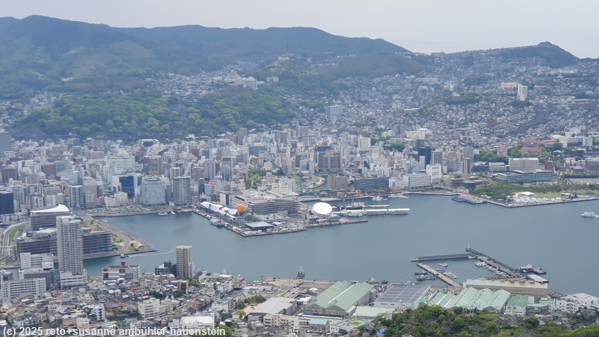 wir stehen um 07:30 uhr auf und frühstücken im hotel. um 9 uhr verlassen wir dieses und machen uns zu fuss auf den weg zum mount inasa, dem hausberg von nagasaki. wir marschieren erst dem fluss urakami-gawa entlang, danach geht es über schmale und stellenweise ziemlich steile wege durch ein wohnquartier. oberhalb der häuser folgen wir der alten bergstrasse, welche allerdings in einem üblen zustand ist. auf dem gipfel des mount inasa geniessen wir vom observatory tower aus die fantastische aussicht auf die stadt nagasaki. danach fahren wir mit der luftseilbahn wieder in die stadt hinunter und marschieren durch die siedlung dejima sowie am seaside park vorbei zum glover garden. wir picknicken auf einer parkbank, danach schlendern wir durch den schönen park und gönnen uns zum schluss ein getränk im teehaus. kurz vor 15 uhr fahren wir mit einer älteren strassenbahn bis zum nakashima-gawa. wir folgen ein stück weit dem fluss und bewundern die steinbrücken. anschliessend marschieren wir am koeizan choshoji tempel vorbei bis zu den hamanomachi arkaden. wir erfrischen uns mit kaffee und früchten, danach kehren wir zum hotel zurück. wir erfahren, dass wir heute zum vierten mal grosseltern geworden sind ! kurz vor 19 uhr marschieren wir noch einmal zu den hamanomachi arkaden und geniessen ein köstliches abendessen. obwohl es auf dem rückweg zum hotel wie aus kübeln giesst, trinken wir noch etwas im nahen starbucks. um 23 uhr sind wir im bett.