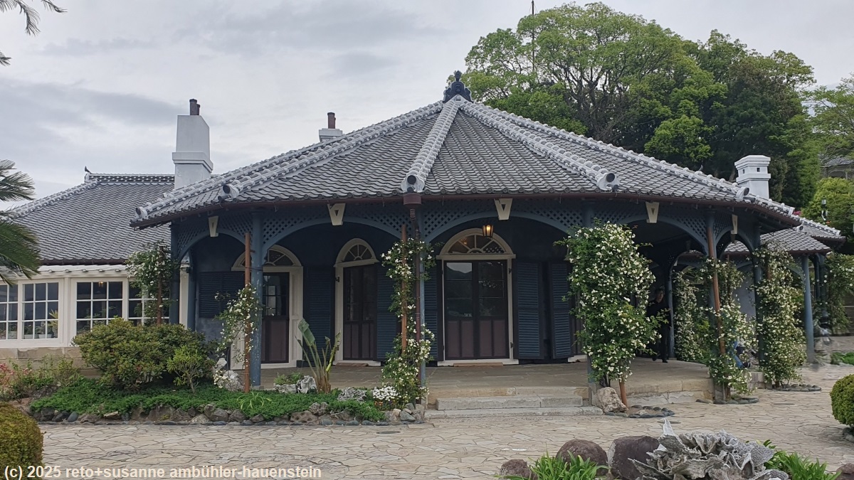 am nagasaki seaside park vorbei gehen wir richtung süden und erklimmen nocheinmal einige schmale und steile treppen. diese bringen uns zum glover garden. hier stehen diverse häuser aus der blütezeit der holländischen besiedlung. wir essen erst unseren picknick, danach schlendern wir durch den park und bewundern die häuser aus alter zeit. im teehaus trinken wir einen köstlichen kaffee. am kleinen japanischen garten vorbei geht es zum ausgang der anlage.