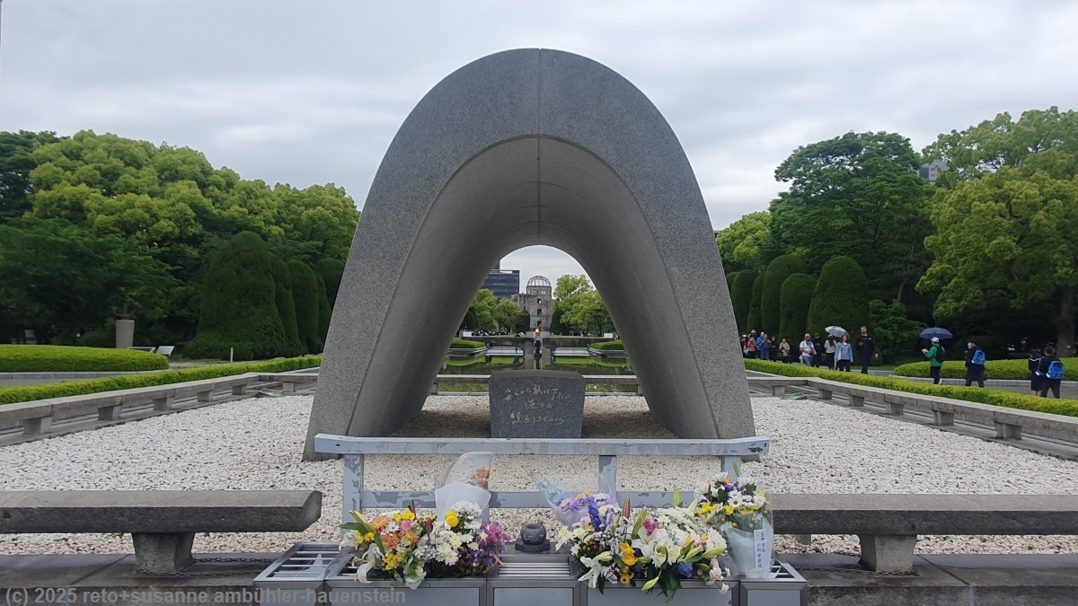 als wir das hotel gegen 09:30 uhr verlassen, fallen einige regentropfen. wir haben die regenjacken angezogen, den schirm brauchen wir vorerst noch nicht. im hauptbahnhof machen wir eine reservation für die zugfahrt von übermorgen und erkundigen uns nach verbindungen nach miyajima und zurück. dieser ausflug steht morgen auf dem programm. anschliessend kaufen wir einige lebensmittel fürs mittagessen, dann machen wir uns auf den weg zum hiroshima peace memorial museum. wir gehen durch breite strassen an modernen hochhäuser vorbei. im vergleich zu fukuoka und nagasaki fahren hier sehr moderne strassenbahnen durch das stadtzentrum. kurz nach 10:30 uhr erreichen wir das museum. von der brücke über den motoyasugawa river sehen wir den "atombomben dom", ein gebäude mit einem halbkugelförmigen dach, das durch die explosion der atombombe über hiroshima nicht ganz vollständig zerstört wurde und nun als denkmal erhalten bleibt. wir gehen durch den park bis zum eigentlichen museum. es hat sehr viele leute, unter anderem zahlreiche schulklassen. beim eingang zum museum hat es eine lange schlange. wir sehen eine tafel mit einem QR-code und lösen damit eintrittskarten online. für den einlass gibt es 30 minütige zeitschlitze. der nächste zeitschlitz ist bereits ausverkauft, wir müssen uns deshalb eine stunde gedulden. diese verbringen wir im nahen "backen mozart cafe". als wir um 11:50 zum eingang kommen, meint die dame, wir könnten mit unserer elektronischen eintrittskarte sofort eintreten.