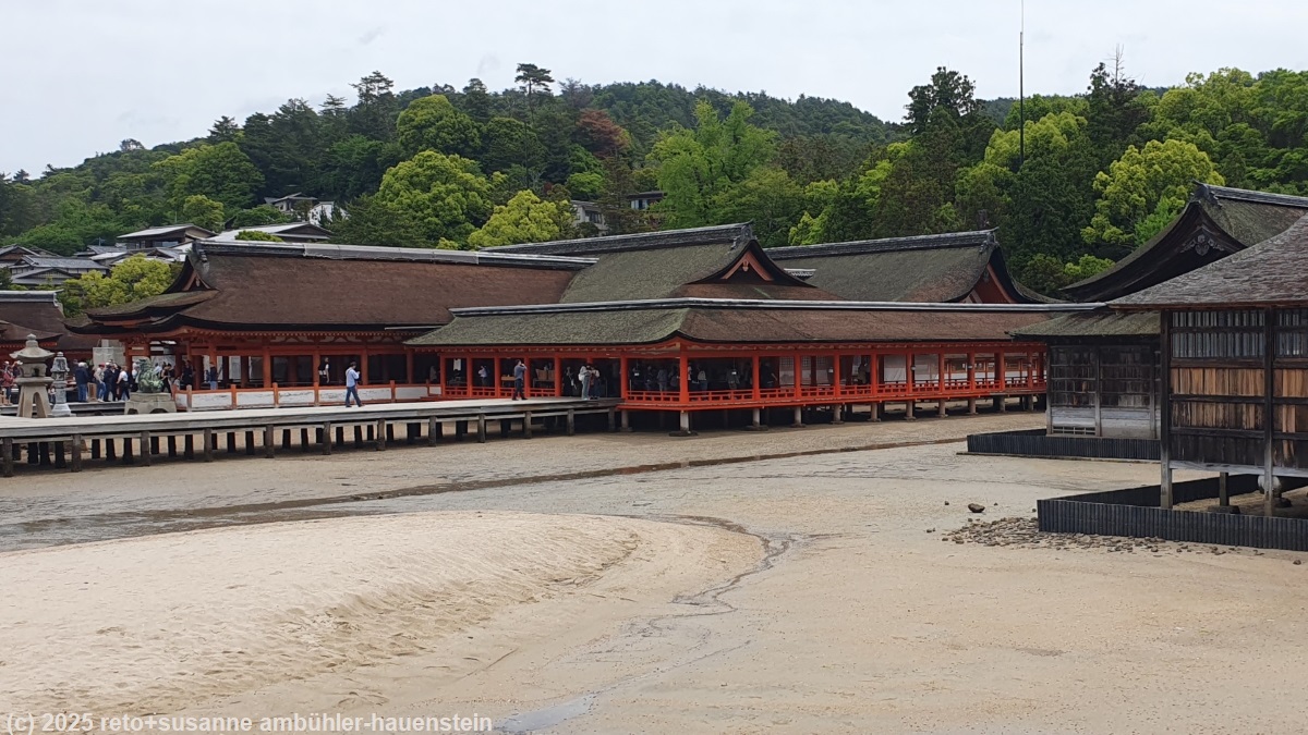 bei unserer ankunft steht es noch im wasser. wir spazieren dem ufer entlang bis zum itsukushima schrein, verzichten aber angesichts der langen menschenschlange beim eingang auf einen besuch. wir gehen weiter dem ufer entlang vorbei am daiganji tempel und beginnen dann am ende des ortes mit dem aufstieg zum 535 meter hohen mount misen.