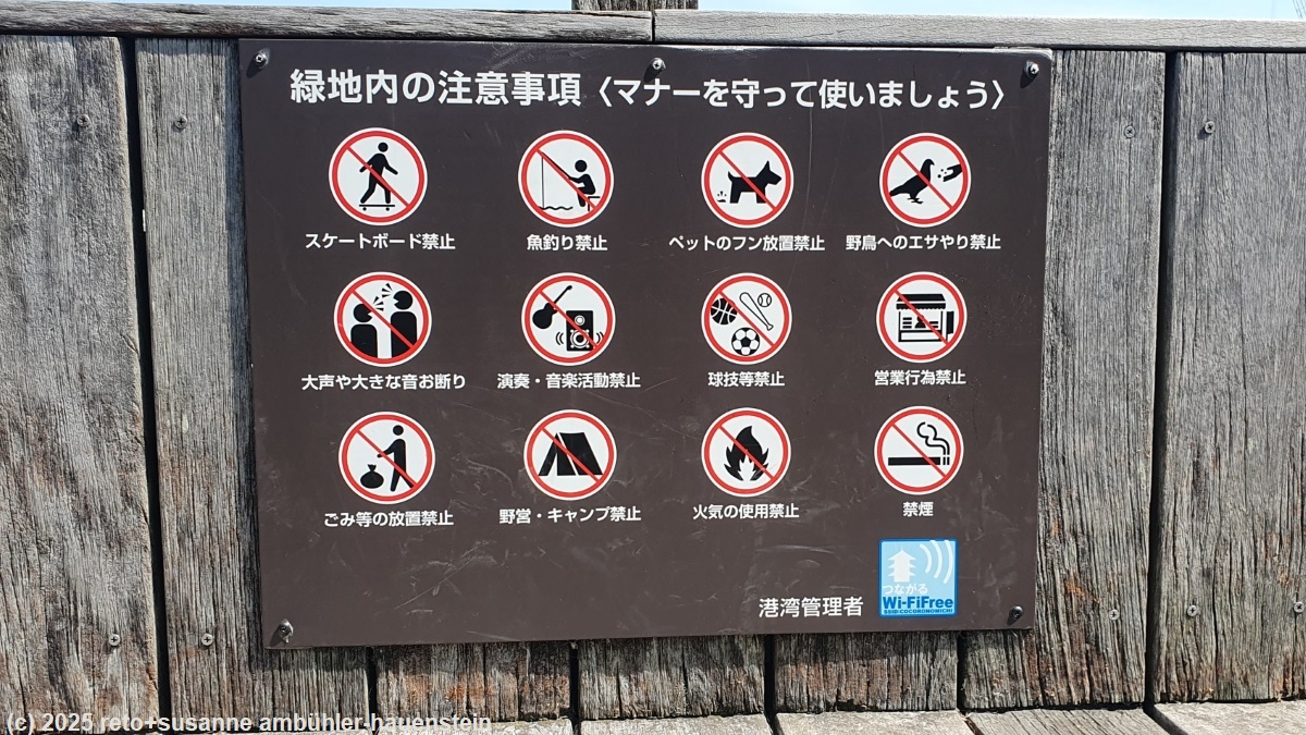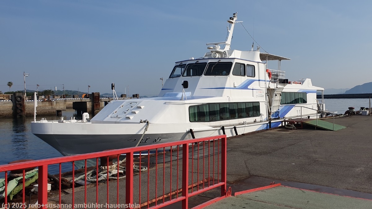 unser handy weckt uns um 6 uhr. draussen ist es bereits hell. es kündigt sich ein weiterer sonniger tag an. pünktlich um 06:30 uhr sind wir im restaurant um zu frühstücken. es gibt zwar müesli, aber keine früchte. wir werden trotzdem satt. ich gönne mir als jux ein paar pommes frites. kurz nach 07:15 uhr verlassen wir das hotel. unser navi führt uns auf einer anderen route zum hafen, als wir gestern gekommen sind. obwohl wir auf hauptstrassen fahren, hat es wenig verkehr, aber viele ampeln. am hafen hilft uns die selbe freundliche dame wie gestern, die fahrkarten am automaten zu beziehen. sie zeigt uns auch, bei welchem pier wir warten müssen. das personal im dienstleistungssektor ist auch in japan äusserst hilfsbereit und freundlich. wir haben das auch schon bei unseren reisen in die skandinavischen länder bemerkt: egal wie zurückhalten bis leicht mürrisch die menschen im allgemeinen sein mögen, die leute, die im dienstleistungsbereich arbeiten, sind fast immer sehr nett. das boot legt gerade im hafen an, wir müssen uns aber noch zehn minuten gedulden, bis wir an bord gehen dürfen. es sind bloss eine handvoll fahrgäste unterwegs. wir verlassen imabari auf die sekunde genau. wie in neuseeland gilt auch in japan: pünktlich sein ist zu spät. noch einmal haben wir einen schönen blick auf die über 4 km lange hängebrücke kurushimakaikyo-ohashi zwischen den inseln shikoku und ohshima. die überfahrt nach habu dauert 80 minuten und verläuft äusserst ruhig. die erste und die letzte zwischenstation lässt unser boot aus, offenbar will niemand ein- oder aussteigen. bei den übrigen zwischenhalten steigen passagiere ein und aus.