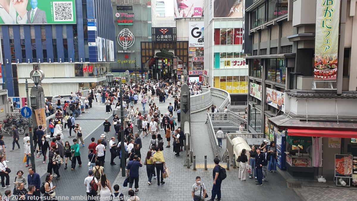 die fahrt mit dem shinkansen "hikari 574" von himeji nach shin-osaka dauert 29 minuten. shin-osaka ist der bahnhof der hochgeschwindigkeitszüge. von hier gelangen wir mit einem lokalzug zum hauptbahnhof. unser hotel ist mehr als 2 km von diesem entfernt. wir versuchen deshalb mit der metro näher zum hotel zu kommen. anfangs tun wir uns schwer, die richtige linie zu finden, denn auf unseren karten fehlen die nummern der stationen. als wir dann endlich einen brauchbaren plan des u-bahnnetzes finden, klappt es mit der anfahrt. diese wird dadurch verkompliziert, dass wir drei verschiedene linien nehmen müssen. mit viel intuition und etwas glück gelangen wir bis auf 150 meter an unser hotel, näher gehts nicht mehr. wir deponieren das gepäck im hotel, dann fahren wir mit der metro drei stationen südwärts. wir spazieren dem dotonbori river entlang. dieser fluss geht mitten durch das lebhafte stadtviertel dotonbori. auf dem wasser verkehren boote voll mit touristen. überhaupt hat es hier enorm viele leute. wir spazieren dem fluss entlang bis zur konzerthalle namba hatch. hier finden wir einen kleinen park - genau genommen ist es ein platz mit etwas grün darum herum und einigen sitzbänken. auf einer solchen picknicken wir. danach spazieren wir durch die dotonbori strasse wieder zurück. google map schreibt zu dieser verkehrsfreien strasse "as busy as it gets", besser kann man es wohl nicht beschreiben. es hat unglaublich viele leute aus allen herren länder. ob das immer so ist, oder ob das an der weltausstellung liegt, wissen wir natürlich nicht. in einem starbucks trinken wir einen kaffee. aus dem ersten stock haben wir eine tolle aussicht auf die belebte strasse.