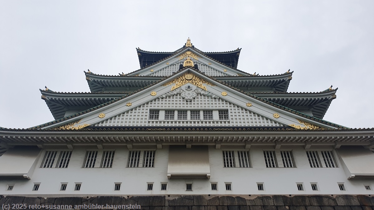 schliesslich marschieren wir zur nächsten metrostation und fahren erst mit der braunen und dann mit der hellgrünen linie zum schlossgarten. das schloss von osaka ist ebenfalls sehr imposant, wenn auch etwas weniger mächtig als dasjenige in himeji. der besucherandrang ist aber noch grösser als in himeji, weshalb wir auf den besuch verzichten. wir spazieren um das schloss herum und verlassen es auf der rückseite über eine brücke über den beeindruckenden graben, welcher das schloss umgibt.
