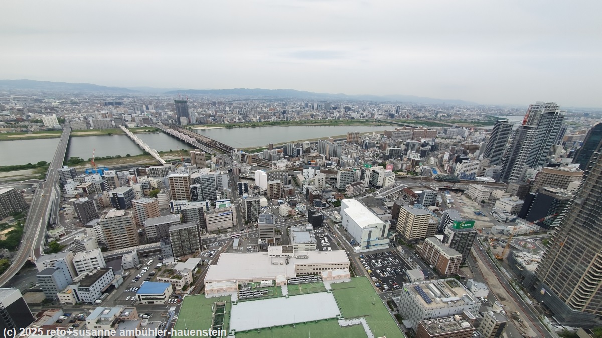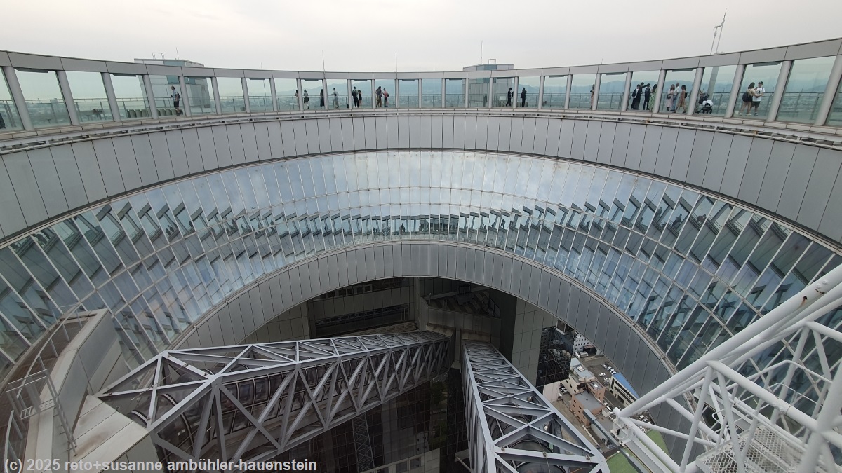 vom bahnhof osakajokoen fahren wir mit dem regionalzug zur osaka station. von da ist es nicht mehr weit bis zum umeda sky building. wir entdecken über einem kaufhaus eine terrasse, von welcher aus man bestimmt einen tollen blick auf das beeindruckende sky building hat. wir tun uns schwer, den zugang zur terrasse zu finden und als wir endlich oben sind müssen wir zu unserer enttäuschung feststellen, dass man das gebäude gar nicht richtig sieht. als wir endlich wieder draussen sind, machen wir uns auf den weg zum sky building. unter dem gebäude ist ein festival im gang. es hat duzende stände und auf einer bühne spielt eine gruppe hawaiianische musik. zu meiner überraschung gibt es keine warteschlange beim aufzug. die ersten drei stockwerke müssen wir mit rolltreppen erklimmen. dann geht es mit einem aufzug zum 35. stock hinauf. eine weitere rolltreppe bringt uns zum 39. stock. nachdem wir den eintritt bezahlt haben, dürfen wir uns auf der plattform umsehen. auf der unteren ebene der plattform hat es ein restaurant. wir erfrischen uns mit einem getränk und geniessen die aussicht über die stadt. danach begeben wir uns auf die obere plattform, welche im freien ist. die rundsicht auf die stadt ist atemberaubend. leider ist der himmel leicht bedeckt, die sonne ist gerade knapp zu erkennen. nachdem wir die plattform einmal umrundet haben, lassen wir uns mit dem aufzug wieder auf den festen boden hinunterbringen.