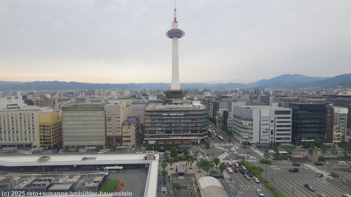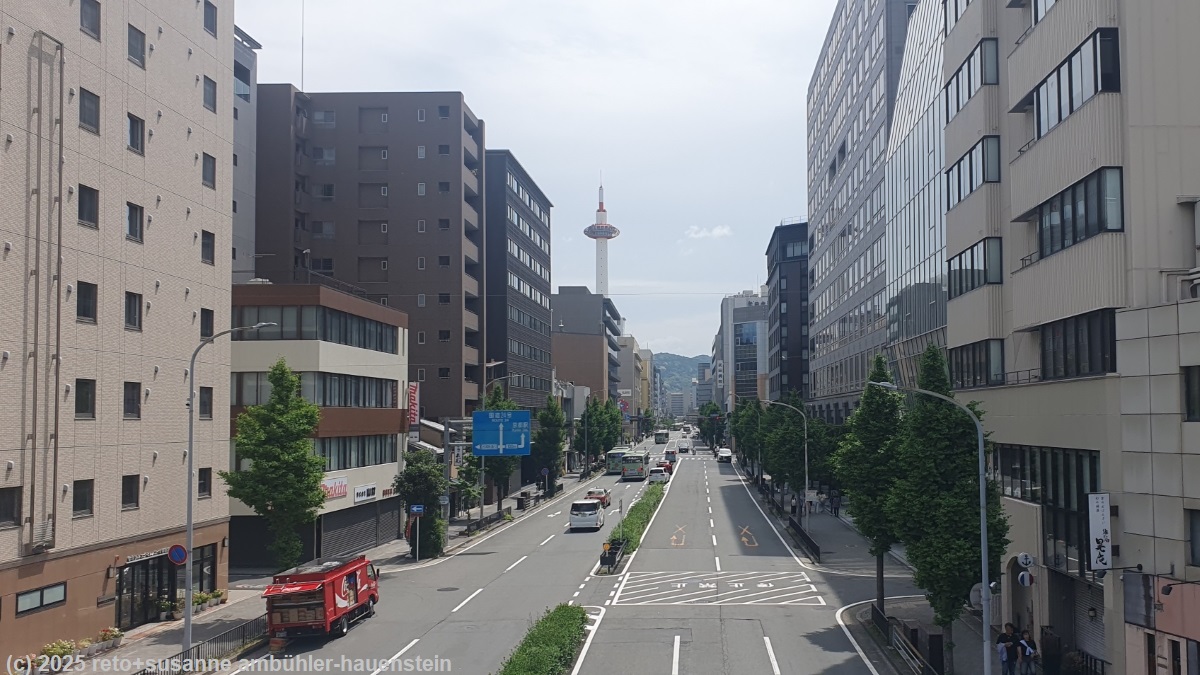 | limited express im bahnhof kyoto | blick auf die shiokoji dori und den kyoto tower |