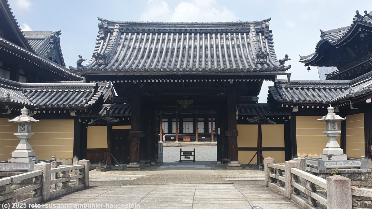 wie inzwischen üblich sind wir auch heute schon wach, als der wecker einschaltet. wir stehen um 07:30 uhr auf und frühstücken im restaurant des hotels. danach packen wir unsere rucksäcke und machen uns auf den weg zur metrostation. mit der u-bahn fahren wir zur osaka station und von da mit dem zug weiter bis shin-osaka. ich bin zwar etwas irritiert, dass auf unserer sitzplatzreservation als abfahrtsbahnhof nur "osaka" und nicht "shin-osaka" steht, aber da wir davon ausgehen, dass wir mit einem shinkansen fahren und diese nur ab shin-osaka verkehren, nehmen wir an, dass wir in shin-osaka einsteigen müssen. wir finden aber keinen passenden zug und realisieren irgendwann, dass wir in einem "limited express" und nicht in einem shinkansen reserviert haben. zum glück fährt dieser zug von osaka station via shin-osaka nach kyoto und so können wir trotzdem hier einsteigen. auch wenn wir nicht mit einem hochgeschwindigkeitszug unterwegs sind, so dauert die fahrt trotzdem nicht länger als eine halbe stunde. im wagen sind nur wenige sitzplätze belegt, die fahrt verläuft ruhig und angenehm. der bahnhof in kyoto ist riesig und sehr modern. wir beschliessen, zu fuss zum hotel zu gehen. der marsch dauert knapp 30 minuten. unterwegs kommen wir an der riesigen tempelanlage nishi honganji vorbei.