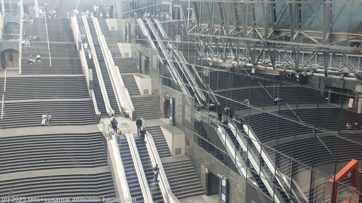 mit dem zug fahren wir zurück zur kyoto station. auf der suche nach einem kaffee kommen wir an einer riesigen treppe vorbei. an deren fuss spielt ein orchester auf einer bühne, die zuhörer sitzen auf der treppe. die akustik zwischen den hohen wänden ist fantastisch. wir setzen uns ebenfalls auf die treppe und hören eine weile zu. danach finden wir ein nettes cafe und geniessen einen köstlichen zvieri. allerdings müssen wir uns diesen erst mit etwas geduld verdienen, denn das lokal hat ein komisches reservationssystem. man muss sich registrieren und sollte per email benachrichtigt werden, wenn der tisch bereit ist. ich habe mich zwar registriert, eine email kommt aber nicht. der kellner macht sich einfach nach kurzem bemerkbar und meint, wir dürfen uns nun setzen. der bahnhof von kyoto ist ein modernes gebäude aus stahl und glas, dem wohl niemand mit einer kamera widerstehen kann. auch wir machen da und dort ein foto. man findet immer wieder neue blickwinkel mit spiegelungen oder anderen tollen optischen effekten. schon als wir 2005 einige tage in kyoto waren, erging es uns so, siehe reisebericht.