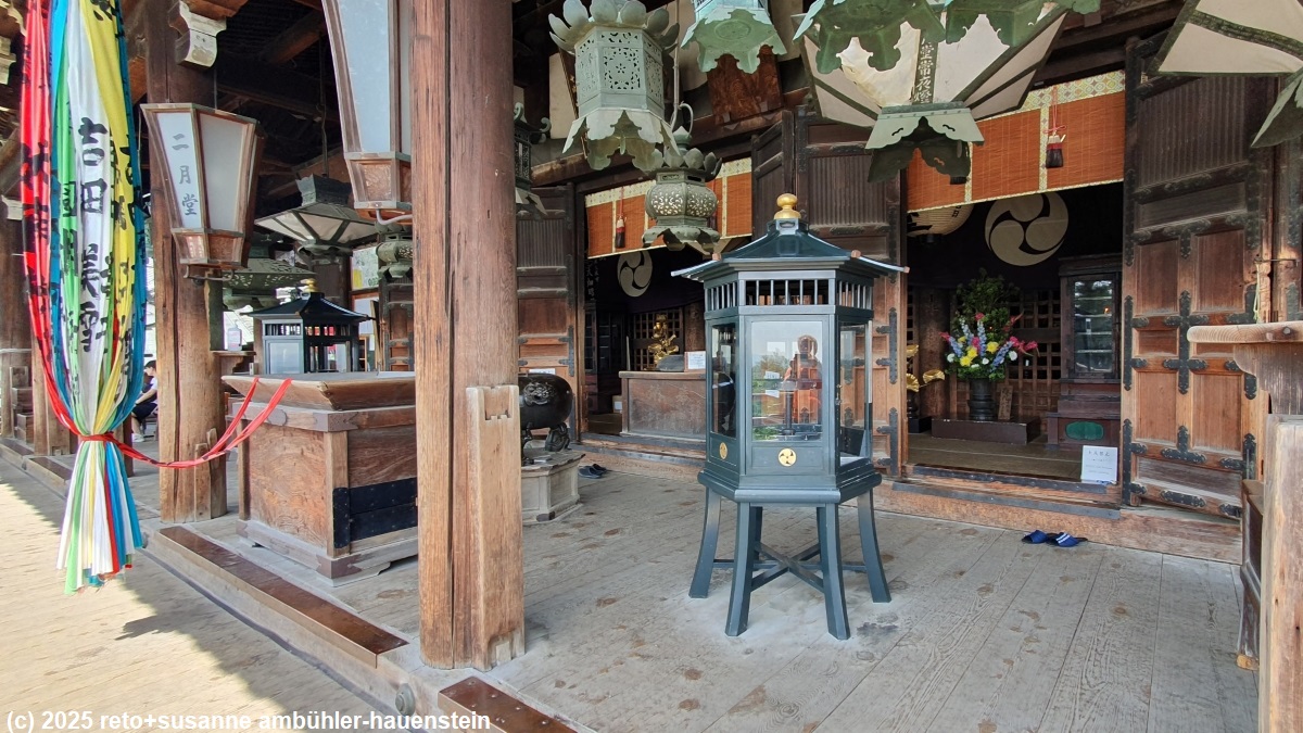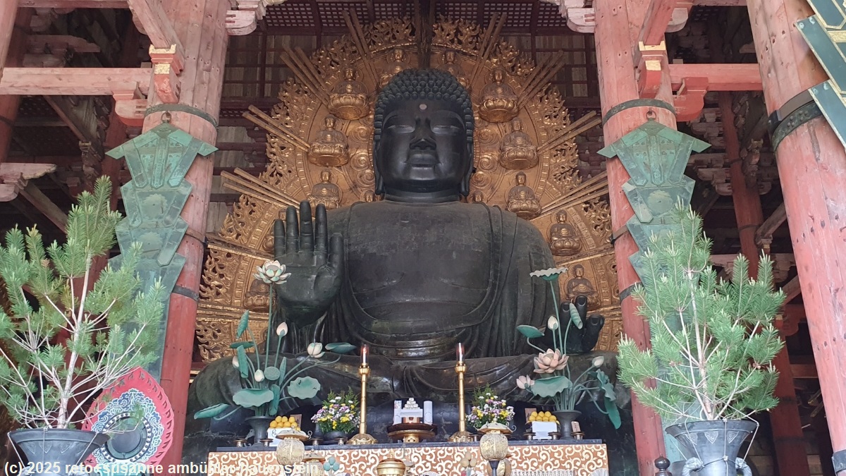 um 12:45 uhr sind wir beim eingang des todaiji tempel. hier befindet sich der daibutsu, der grosse buddha. manchmal habe ich den eindruck, die europäischen kirchenbauer und die japanischen tempelbauer leiden gelegentlich an grössenwahn. manche kirchen und manche tempel sehen für mich aus, als seien sie fünf mal zu gross gebaut worden. wir bewundern den grossen buddah in seinem tempel und setzen dann unsere wanderung fort. bei der nigatsudo hall picknicken wir auf einer treppe im schatten eines nebengebäudes. danach geniessen wir vom balkon der halle den blick auf die tempelanlage und die stadt.